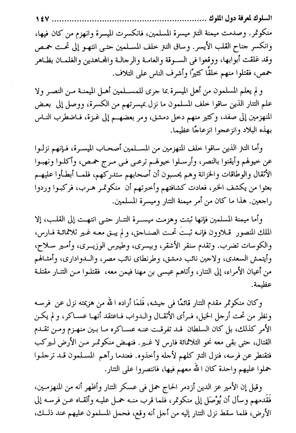 منكوتمر. وصدمت ميمنة التتر ميسرَة الْمُسلمين فَانْكَسَرت الميسرة وَانْهَزَمَ من كَانَ فِيهَا وانكسر جنَاح الْقلب الْأَيْسَر. وسَاق التتر خلف الْمُسلمين حَتَّى انتهو إِلَى تَحت حمص وَقد غلقت أَبْوَابهَا ووقعوا فِي السوقة والعامة والرجالة والمجاهدين والغلمان بِظَاهِر حمص فَقتلُوا مِنْهُم خلقا كثيرا وأشرف النَّاس على التلاف. وَلم يعلم الْمُسلمُونَ من أهل الميسرة. بِمَا جري للْمُسلمين أهل الميمنة من النَّصْر وَلَا علم التتار الَّذين ساقوا خلف الْمُسلمُونَ مَا نزل. بميسرتهم من الْكسْوَة وَوصل إِلَى بعض المنهزمين إِلَى صفد وَكثير مِنْهُم دخل دمشق وَمر بَعضهم إِلَى غَزَّة فاضطرب النَّاس بِهَذِهِ الْبِلَاد وانزعجوا انزعاجاً عَظِيما. وَأما التتر الَّذين ساقوا خلف المنهزمين من الْمُسلمين أَصْحَاب الميسرة فَإِنَّهُم نزلُوا عَن خيولهم وأيقنوا بالنصر وَأَرْسلُوا خيولهم توعي فِي مرج حمص وأكلوا ونهبوا الأثقال والوطاقات والخزانة وهم يحسبون أَن أَصْحَابهم ستدركهم فَلَمَّا أبطأوا عَلَيْهِم بعثوا من يكْشف الْخَبَر فَعَادَت كشافتهم وَأَخْبَرتهمْ أَن منكوتمر هرب فَرَكبُوا وردوا رَاجِعين. هَذَا مَا كَانَ من أَمر ميمنة التتار وميسرة الْمُسلمين. وَأما ميمنة الْمُسلمين فَإِنَّهَا ثبتَتْ وهزمت ميسرَة التتار حَتَّى انْتَهَت إِلَى الْقلب إِلَّا الْملك الْمَنْصُور قلاوون فَإِنَّهُ ثَبت تَحت الصناجق وَلم يبْق مَعَه غير ثَلَاثمِائَة فَارس والكوسات تضرب. وَتقدم سنقر الْأَشْقَر وبيسري وطيبرس الوزيري وأمير سلَاح وأيتمش السَّعْدِيّ ولاجين نَائِب دمشق وطرنطاي نَائِب مصر والدواداري وأمثالهم من أَعْيَان الْأُمَرَاء إِلَى التتار وأتاهم عيسي بن مهنا فِيمَن مَعَه فَقتلُوا من التتار مقتلة عَظِيمَة. وَكَانَ منكوتمر مقدم التتار قَائِما فِي جَيْشه فَلَمَّا أَرَادَهُ الله من هزيمته نزل عَن فرسه وَنظر من تَحت أرجل الْخَيل فرأي الأثقال وَالدَّوَاب فَاعْتقد أَنَّهَا عَسَاكِر وَلم يكن الْأَمر كَذَلِك بل كَانَ السُّلْطَان قد تَفَرَّقت عَنهُ عساكره مَا بَين مُنْهَزِم وَمن تقدم الْقِتَال حَتَّى بَقِي مَعَه نَحْو الثلاثمائة فَارس لَا غير. فَنَهَضَ منكوتمر من الأَرْض ليركب فتقنطر عَن فرسه فَنزل التتر كلهم لأَجله وأخذوه. فعندما رَآهُمْ الْمُسلمُونَ قد ترجلوا حملُوا عَلَيْهِم وَاحِدَة كَانَ الله مَعَهم فِيهَا فانتصروا على التتار. وَقيل إِن الْأَمِير عز الدّين أزدمر الْحَاج حمل فِي عَسْكَر التتار وَأظْهر أَنه من المنهزمين فَقَدمهُمْ وسال أَن يُوصل إِلَى منكوتمر فَلَمَّا قرب مِنْهُ حمل عَلَيْهِ وألقاه عَن فرسه إِلَى الأَرْض فَلَمَّا سقط نزل التتار إِلَيْهِ من أجل إِنَّه وَقع فَحمل الْمُسلمُونَ عَلَيْهِم عِنْد ذَلِك