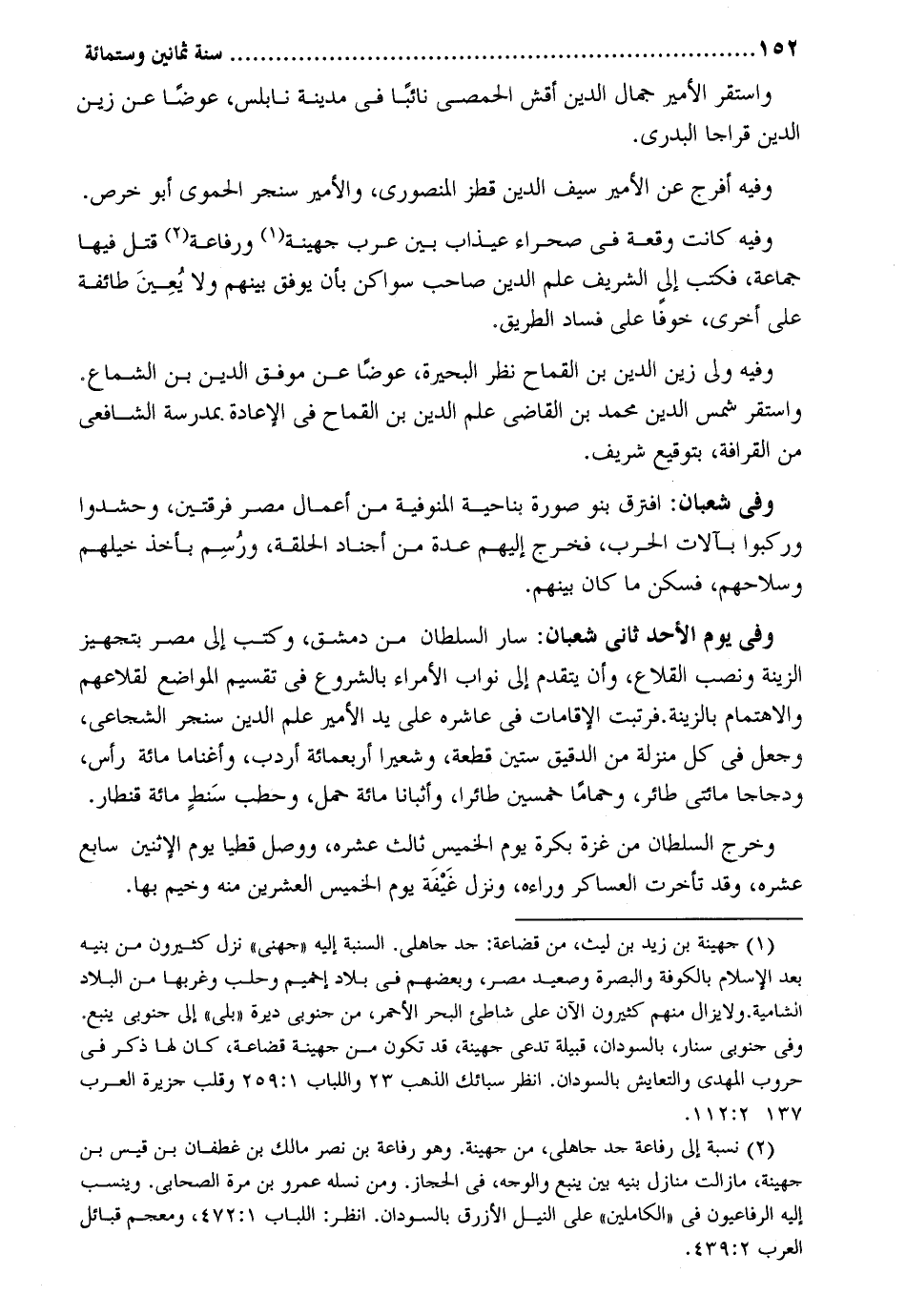 وَاسْتقر الْأَمِير جمال الدّين أقش الْحِمصِي نَائِبا فِي مَدِينَة نابلس عوضا عَن زين الدّين قراجا البدري. وَفِيه افرج عَن الْأَمِير سيف الدّين قطز المنصوري والأمير سنجر الْحَمَوِيّ أَبُو خرص. وَفِيه كَانَت وقْعَة فِي صحراء عيذاب بَين عرب جُهَيْنَة وَرِفَاعَة قتل فِيهَا جمَاعَة فَكتب إِلَى الشريف علم الدّين صَاحب سواكن بِأَن يوفق بَينهم وَلَا يعين طَائِفَة على أُخْرَى خوفًا على فَسَاد الطَّرِيق. وَفِيه ولي زين الدّين بن القماح نظر الْبحيرَة عوضا عَن موفق الدّين بن الشماع. وَاسْتقر شمس الدّين مُحَمَّد بن القَاضِي علم الدّين بن القماح فِي الْإِعَادَة. بمدرسة الشَّافِعِي من القرافة بتوقيع شرِيف. وَفِي شعْبَان: افترق بَنو صُورَة بِنَاحِيَة المنوفية من أَعمال مصر فرْقَتَيْن وحشدوا وركبوا بآلات الْحَرْب فَخرج إِلَيْهِم عدَّة من أجناد الْحلقَة ورسم بِأخذ خيلهم وسلاحهم فسكن مَا كَانَ بَينهم. وَفِي يَوْم الْأَحَد ثَانِي شعْبَان: سَار السُّلْطَان من دمشق وَكتب إِلَى مصر بتجهيز الزِّينَة وَنصب القلاع وَأَن يتَقَدَّم إِلَى نواب الْأُمَرَاء بِالشُّرُوعِ فِي تَقْسِيم الْمَوَاضِع لقلاعهم والاهتمام بالزينة. فرتبت الإقامات فِي عاشره على يَد الْأَمِير علم الدّين سنجر الشجاعي وَجعل فِي كل منزلَة من الدَّقِيق سِتِّينَ قِطْعَة وشعيرا أَرْبَعمِائَة أردب وأغناما مائَة رَأس ودجاجا مِائَتي طَائِر وحماما خمسين طائرا وأثبانا مائَة حمل وحطب سنطٍ مائَة قِنْطَار. وَخرج السُّلْطَان من غَزَّة بكرَة يَوْم الْخَمِيس ثَالِث عشره وَوصل قطيا يَوْم الْإِثْنَيْنِ سَابِع عشره وَقد تَأَخَّرت العساكر وَرَاءه وَنزل غيفة يَوْم الْخَمِيس الْعشْرين مِنْهُ وخيم بهَا.