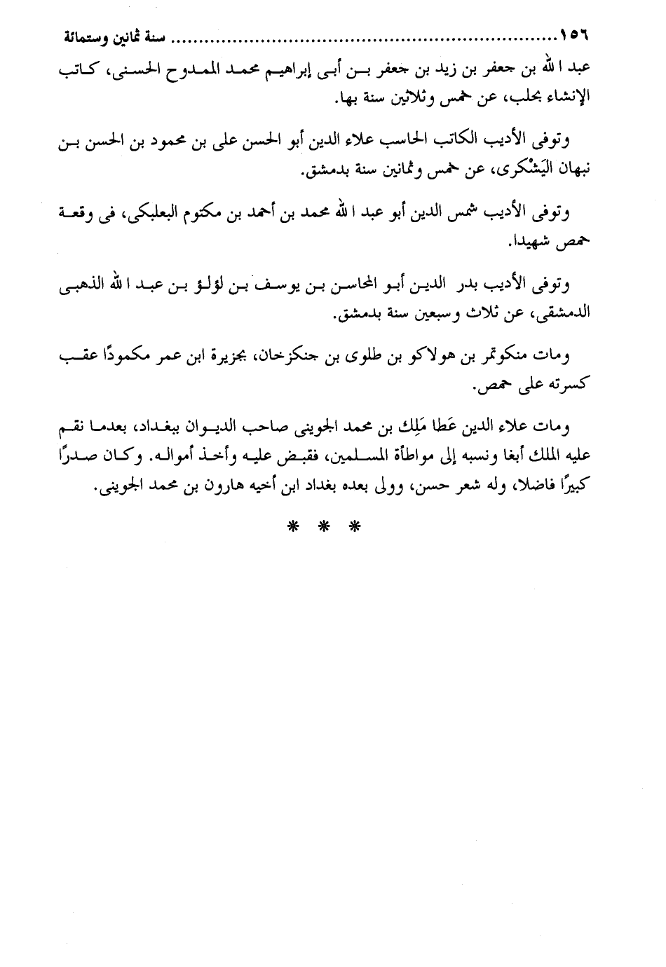 عبد الله بن جَعْفَر بن زيد بن جَعْفَر بن أبي إِبْرَاهِيم مُحَمَّد الممدوح الحسني كَاتب الْإِنْشَاء بحلب عَن خمس وَثَلَاثِينَ سنة بهَا وَتُوفِّي الأديب الْكَاتِب الحاسب عَلَاء الدّين أَبُو الْحسن على بن مَحْمُود بن الْحسن بن نَبهَان الْيَشْكُرِي عَن خمس وَثَمَانِينَ سنة بِدِمَشْق. وَتُوفِّي الأديب شمس الدّين أَبُو عبد الله مُحَمَّد بن أَحْمد بن مَكْتُوم البعلبكي فِي وقْعَة حمص شَهِيدا. وَتُوفِّي الأديب بدر الدّين أَبُو المحاسن بن يُوسُف بن لُؤْلُؤ بن عبد الله الذَّهَبِيّ الدِّمَشْقِي عَن ثَلَاث وَسبعين سنة بِدِمَشْق. وَمَات منكوتمر بن هولاكو بن طلوي بن جنكزخان بِجَزِيرَة ابْن عمر مكموداً عقب كَسرته على حمص. وَمَات عَلَاء الدّين عطا ملك بن مُحَمَّد الْجُوَيْنِيّ صَاحب الدِّيوَان بِبَغْدَاد بَعْدَمَا نقم عَلَيْهِ الْملك أبغا وَنسبه إِلَى مواطأة الْمُسلمين فَقبض عَلَيْهِ وَأخذ أَمْوَاله. وَكَانَ صَدرا كَبِيرا فَاضلا وَله شعر حسن وَولي بعده بَغْدَاد ابْن أَخِيه هَارُون بن مُحَمَّد الْجُوَيْنِيّ