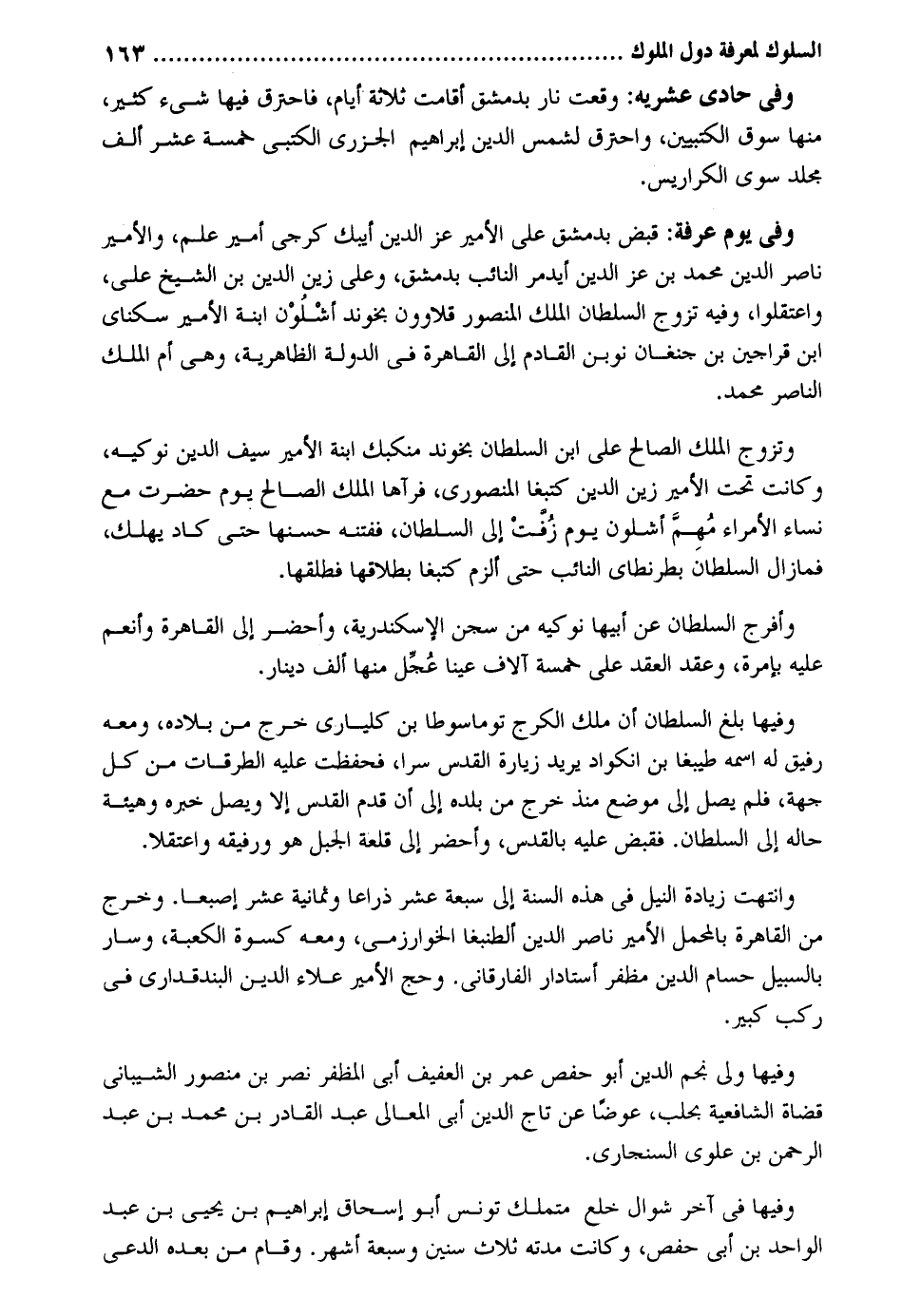 وَفِي حادي عشريه: وَقعت نَار بِدِمَشْق أَقَامَت ثَلَاثَة أَيَّام فَاحْتَرَقَ فِيهَا شَيْء كثير مِنْهَا سوق الكتبيين وَاحْتَرَقَ لشمس الدّين إِبْرَاهِيم الْجَزرِي الكتبي خَمْسَة عشر ألف مُجَلد سوي الكراريس. وَفِي يَوْم عَرَفَة: قبض بِدِمَشْق على الْأَمِير عز الدّين أيبك كرجي أَمِير علم والأمير نَاصِر الدّين مُحَمَّد بن عز الدّين أيدمر النَّائِب بِدِمَشْق وعَلى زين الدّين بن الشَّيْخ على واعتقلوا وَفِيه تزوج السُّلْطَان الْملك الْمَنْصُور قلاوون بخوند أشلون ابْنة الْأَمِير سكناي ابْن قراجين بن جنغان نوبن القادم إِلَى الْقَاهِرَة فِي الدولة الظَّاهِرِيَّة وَهِي أم الْملك النَّاصِر مُحَمَّد. وَتزَوج الْملك الصَّالح على ابْن السُّلْطَان بخوند منكبك ابْنة الْأَمِير سيف الدّين نوكيه وَكَانَت تَحت الْأَمِير زين الدّين كتبغا المنصوري فرآها الْملك الصَّالح يَوْم حضرت مَعَ نسَاء الْأُمَرَاء مُهِمّ أشلون يَوْم زفت إِلَى السُّلْطَان ففتنه حسنها حَتَّى كَاد يهْلك فمازال السُّلْطَان بطرنطاي النَّائِب حَتَّى ألزم كتبغا بِطَلَاقِهَا فَطلقهَا. وَأَفْرج السُّلْطَان عَن أَبِيهَا نوكيه من سجن الْإسْكَنْدَريَّة وأحضر إِلَى الْقَاهِرَة وأنعم عَلَيْهِ بإمرة وفيهَا بلغ السُّلْطَان أَن ملك الكرج توماسوطا بن كلياري خرج من بِلَاده وَمَعَهُ رَفِيق لَهُ اسْمه طيبغا بن انكواد يُرِيد زِيَارَة الْقُدس سرا فَحفِظت عَلَيْهِ الطرقات من كل جِهَة فَلم يصل إِلَى مَوضِع مُنْذُ خرج من بَلَده إِلَى أَن قدم الْقُدس إِلَّا ويصل خَبره وهيئة حَاله إِلَى السُّلْطَان. فَقبض عَلَيْهِ بالقدس وأحضر إِلَى قلعة الْجَبَل هُوَ ورفيقه واعتقلا. وانتهت زِيَادَة النّيل فِي هَذِه السّنة إِلَى سَبْعَة عشر ذِرَاعا وَثَمَانِية عشر إصبعا. وَخرج من الْقَاهِرَة بالمحمل الْأَمِير نَاصِر الدّين ألطنبغا الْخَوَارِزْمِيّ وَمَعَهُ كسْوَة الْكَعْبَة وَسَار بالسبيل حسام الدّين مظفر أستادار الفارقاني. وَحج الْأَمِير عَلَاء الدّين البندقداري فِي ركب كَبِير. وفيهَا ولي نجم الدّين أَبُو حَفْص عمر بن الْعَفِيف أبي المظفر خصر بن مَنْصُور الشَّيْبَانِيّ قُضَاة الشَّافِعِيَّة بحلب عوضا عَن تَاج الدّين أبي الْمَعَالِي عبد الْقَادِر بن مُحَمَّد بن عبد الرَّحْمَن بن علوي السنجاري. وفيهَا فِي آخر شَوَّال خلع متملك تونس أَبُو إِسْحَاق إِبْرَاهِيم بن يحيي بن عبد الْوَاحِد بن أبي حَفْص وَكَانَت مدَّته ثَلَاث سِنِين وَسَبْعَة أشهر. وَقَامَ من بعده الدعي