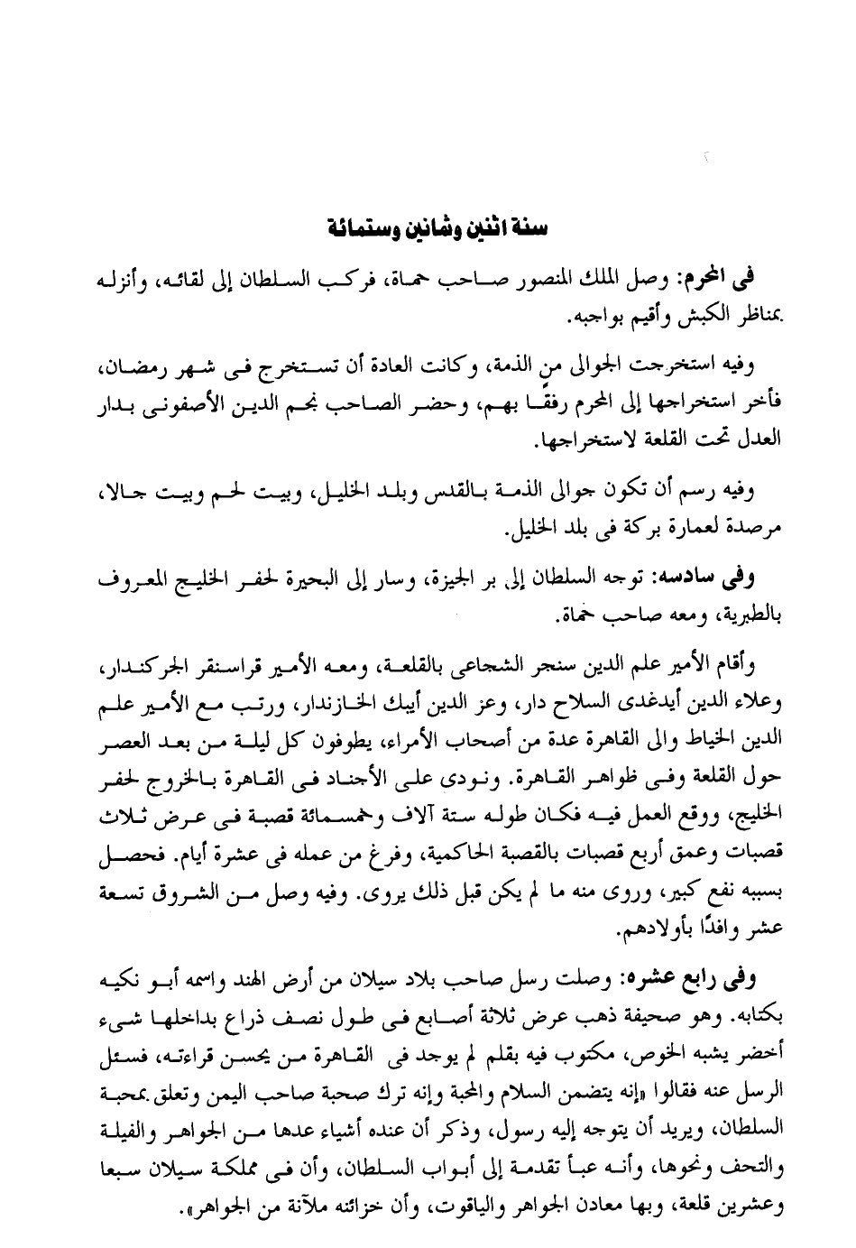 سنة اثْنَيْنِ وَثَمَانِينَ وسِتمِائَة فِي الْمحرم: وصل الْملك الْمَنْصُور صَاحب حماة فَركب السُّلْطَان إِلَى لِقَائِه وأنزله بمناظر الْكَبْش وأقيم بواجبه. وَفِيه استخرجت الجوالي من الذِّمَّة وَكَانَت الْعَادة أَن تستخرج فِي شهر رَمَضَان فَأخر استخراجها إِلَى الْمحرم رفقا بهم وَحضر الصاحب نجم الدّين الأصفوني بدار الْعدْل تَحت القلعة لاستخراجها. وَفِيه رسم أَن تكون جوالي الذِّمَّة بالقدس وبلد الْخَلِيل وَبَيت لحم وَبَيت جمالا مرصدة لعمارة بركَة فِي بلد الْخَلِيل. وَفِي سادسه: توجه السُّلْطَان إِلَى بر الجيزة وَسَار إِلَى الْبحيرَة لحفر الخليج الْمَعْرُوف بالطبرية وَأقَام الْأَمِير علم الدّين سنجر الشجاعي بالقلعة وَمَعَهُ الْأَمِير قراسنقر الجركندار وعلاء الدّين أيدغدي السِّلَاح دَار وَعز الدّين أيبك الخازندار ورتب مَعَ الْأَمِير علم الدّين الْخياط وَإِلَى الْقَاهِرَة عدَّة من أَصْحَاب الْأُمَرَاء يطوفون كل لَيْلَة من بعد الْعَصْر حول القلعة وَفِي ظواهر الْقَاهِرَة. وَنُودِيَ على الأجناد فِي الْقَاهِرَة بِالْخرُوجِ لحفر الخليج وَوَقع الْعَمَل فِيهِ فَكَانَ طوله سِتَّة آلَاف وَخَمْسمِائة قَصَبَة فِي عرض ثَلَاث قصبات وعمق أَربع قصبات بالقصبة الحاكمية وَفرغ من عمله فِي عشرَة أَيَّام. فَحصل بِسَبَبِهِ نفع كَبِير وَرُوِيَ مِنْهُ مَا لم يكن قبل ذَلِك يروي. وَفِيه وصل من الشروق تِسْعَة عشر وافدا بأولادهم. وَفِي رَابِع عشره: وصلت رسل صَاحب بِلَاد سيلان من أَرض الْهِنْد واسْمه أَبُو أنكيه بكتابه. وَهُوَ صحيفَة ذهب عرض ثَلَاثَة أَصَابِع فِي طول نصف ذِرَاع بداخلها شَيْء أَخْضَر يشبه الخوص مَكْتُوب فِيهِ بقلم لم يُوجد فِي الْقَاهِرَة من يحسن قِرَاءَته فَسئلَ الرُّسُل عَنهُ فَقَالُوا إِنَّه يتَضَمَّن السَّلَام والمحبة وَإنَّهُ ترك صُحْبَة صَاحب الْيمن وَتعلق بمحبة السُّلْطَان وَيُرِيد أَن يتَوَجَّه إِلَيْهِ رَسُول وَذكر أَن عِنْده أَشْيَاء عدهَا من الْجَوَاهِر والفيلة والتحف وَنَحْوهَا وَأَنه عبأ تقدمة إِلَى أَبْوَاب السُّلْطَان وَأَن فِي مملكة سيلان سبعا وَعشْرين قلعة وَبهَا معادن الْجَوَاهِر والياقوت وَأَن خزائنه ملآنة من الْجَوَاهِر.