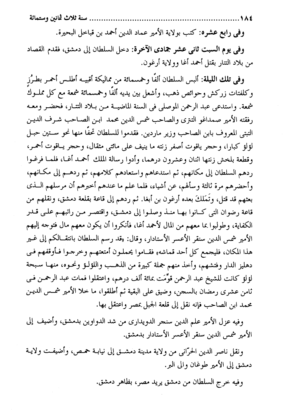 وَفِي رَابِع عشره: كتب بِولَايَة الْأَمِير عماد الدّين أَحْمد بن قباخل الْبحيرَة. وَفِي يَوْم السبت ثَانِي عشر جُمَادَى الْآخِرَة: دخل السُّلْطَان إِلَى دمشق فَقدم القصاد من بِلَاد وَفِي تِلْكَ اللَّيْلَة: ألبس السُّلْطَان ألفا وَخَمْسمِائة من مماليكة أقبيه أطلس أَحْمَر بطرز وكلفتات زركش وحوائص ذهب وأشعل بَين يَدَيْهِ ألفا وَخَمْسمِائة شمعة مَعَ كل مَمْلُوك شمعة. واستدعى عبد الرَّحْمَن الْموصِلِي فِي السّنة الْمَاضِيَة من بِلَاد التتار فَحَضَرَ وَمَعَهُ رفقته الْأَمِير صمداغو التتري والصاحب شمس الدّين مُحَمَّد ابْن الصاحب شرف الدّين التبتي الْمَعْرُوف بِابْن الصاحب وَزِير ماردين. فقدموا للسُّلْطَان تحفاً مِنْهَا نَحْو سِتِّينَ حَبل لُؤْلُؤ كبارًا وَحجر ياقوت أصفر زنته مَا ينيف على مِائَتي مِثْقَال وَحجر ياقوت أَحْمَر وَقطعَة بلخش زنتها اثْنَان وَعِشْرُونَ درهما وأدوا رِسَالَة الْملك أَحْمد أغا فَلَمَّا فرغوا ردهم السُّلْطَان إِلَى مكانهم ثمَّ استدعاهم واستعادهم كَلَامهم ثمَّ ردهم إِلَى مكانهم وأحضرهم مرّة ثَالِثَة وسألهم عَن أَشْيَاء فَلَمَّا علم مَا عِنْدهم أخْبرهُم أَن مرسلهم الَّذِي بَعثهمْ قد قتل وتملك بعده أرغون بن أبغا. ثمَّ ردهم إِلَى قاعة بقلعة دمشق ونقلهم من قاعة رضوَان الَّتِي كَانُوا بهَا مُنْذُ وصلوا إِلَى دمشق وَاقْتصر من راتبهم على قدر الْكِفَايَة وطولبوا. بِمَا مَعَهم من المَال لِأَحْمَد أغا فأنكروا أَن يكون مَعَهم مَال فَتوجه إِلَيْهِم الْأَمِير شمس الدّين سنقر الأعسر الأستادار وَقَالَ: قد رسم السُّلْطَان بانتقالكم إِلَى غير هَذَا الْمَكَان فليجمع كل أحد قماشه فَقَامُوا يحملون أمتعتهم وَخَرجُوا فأوقفهم فِي دهليز الدَّار وفتشهم وَأخذ مِنْهُم جملَة كَبِيرَة من الذَّهَب واللؤلؤ وَنَحْوه مِنْهَا سبْحَة لُؤْلُؤ كَانَت للشَّيْخ عبد الرَّحْمَن قومت. بِمِائَة ألف دِرْهَم واعتقلوا فَمَاتَ عبد الرَّحْمَن فِي ثامن عشري رَمَضَان بالسجن وضيق على الْبَقِيَّة ثمَّ أطْلقُوا مَا خلا الْأَمِير شمسي الدّين مُحَمَّد ابْن الصاحب فَإِنَّهُ نقل إِلَى قلعة الْجَبَل. بِمصْر واعتقل بهَا. وَفِيه عزل الْأَمِير علم الدّين سنجر الدويداري من شدّ الدَّوَاوِين بِدِمَشْق وأضيف إِلَى الْأَمِير شمس الدّين سنقر الأعسر الأستادار بِدِمَشْق. وَنقل نَاصِر الدّين الْحَرَّانِي من ولَايَة مَدِينَة دمشق إِلَى نِيَابَة حمص وأضيفت ولَايَة دمشق إِلَى الْأَمِير طوغان وَإِلَى الْبر. وَفِيه خرج السُّلْطَان من دمشق يُرِيد مصر بِظَاهِر دمشق.