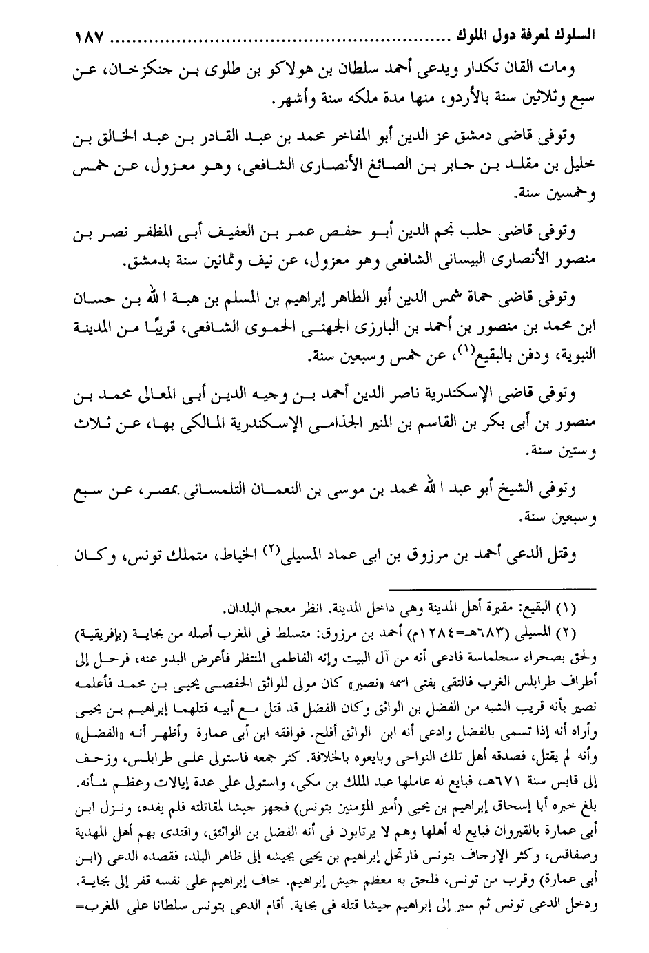 وَمَات القان تكدار وَيَدعِي أَحْمد سُلْطَان بن هولاكو بن طلوي بن جنكزخان عَن سبع وَثَلَاثِينَ وَتُوفِّي قَاضِي دمشق عز الدّين أَبُو المفاخر مُحَمَّد بن عبد الْقَادِر بن عبد الْخَالِق بن خَلِيل بن مقلد بن جَابر بن الصَّائِغ الْأنْصَارِيّ الشَّافِعِي وَهُوَ مَعْزُول عَن خمس وَخمسين سنة. وَتُوفِّي قَاضِي حلب نجم الدّين أَبُو حمص عمر بن الْعَفِيف أبي المظفر نصر بن مَنْصُور الْأنْصَارِيّ البيساني الشَّافِعِي وَهُوَ مَعْزُول عَن نَيف وَثَمَانِينَ سنة بِدِمَشْق. وَتُوفِّي قَاضِي حماة شمس الدّين أَبُو الطَّاهِر إِبْرَاهِيم بن الْمُسلم بن هبة الله بن حسان ابْن مُحَمَّد بن مَنْصُور بن أَحْمد بن الْبَارِزِيّ الْجُهَنِيّ الْحَمَوِيّ الشَّافِعِي قَرِيبا من الْمَدِينَة النَّبَوِيَّة وَدفن بِالبَقِيعِ عَن خمس وَسبعين سنة. وَتُوفِّي قَاضِي الْإسْكَنْدَريَّة نَاصِر الدّين أَحْمد بن وجيه الدّين أبي الْمَعَالِي مُحَمَّد بن مَنْصُور بن أبي بكر بن الْقَاسِم بن الْمُنِير الجذامي الْإسْكَنْدَريَّة الْمَالِكِي بهَا عَن ثَلَاث وَسِتِّينَ سنة. وَتُوفِّي الشَّيْخ أَبُو عبد الله مُحَمَّد بن مُوسَى بن النُّعْمَان التلمساني بِمصْر عَن سبع وَسبعين سنة. وَقتل الدعي أَحْمد بن مَرْزُوق بن أبي عماد المسيلي الْخياط متملك تونس وَكَانَ