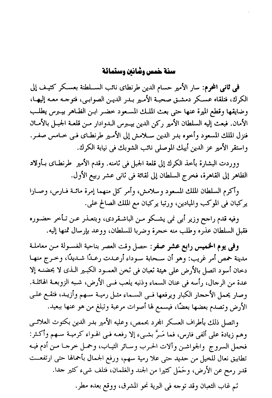 سنة خمس وَثَمَانِينَ وسِتمِائَة فِي ثَانِي الْمحرم: سَار الْأَمِير حسام الدّين طرنطاي نَائِب السلطنة بعسكر كثيف إِلَى الكرك فَتَلقاهُ عَسْكَر دمشق صُحْبَة الْأَمِير بدر الدّين الصوابي فَتوجه مَعَه إِلَيْهَا وضايقها وَقطع الْميرَة عَنْهَا حَتَّى بعث الْملك المسعود خضر ابْن الظَّاهِر بيبرس يطْلب الْأمان. فَبعث إِلَيْهِ السُّلْطَان الْأَمِير ركن الدّين بيبرس الدوادار من قلعة الْجَبَل بالأمان فَنزل الْملك المسعود وَأَخُوهُ بدر الدّين سلامش إِلَى الْأَمِير طرنطاي فِي خَامِس صفر. وَاسْتقر الْأَمِير عز الدّين أيبك الْموصِلِي نَائِب الشوبك فِي نِيَابَة الكرك. ووردت الْبشَارَة بِأخذ الكرك إِلَى قلعة الْجَبَل فِي ثامنه. وَقدم الْأَمِير طرنطاي بأولاد الظَّاهِر إِلَى الْقَاهِرَة فَخرج السُّلْطَان إِلَى لِقَائِه فِي ثَانِي عشر ربيع الأول. وَأكْرم السُّلْطَان الْملك المسعود وسلامش وَأمر كل مِنْهُمَا إمرة مائَة فَارس وصارا يركبان فِي الموكب والميادين ورتبا يركبان مَعَ الْملك الصَّالح عَليّ. وَفِيه قدم رَاجِح وَزِير أبي نمي يشكو من الباشقردي ويتعذر عَن تَأَخّر حُضُوره فَقبل السُّلْطَان عذره وَطلب مِنْهُ خجرة وَضَربا للسُّلْطَان ووعد بإرسال ثمنهَا إِلَيْهِ. وَفِي يَوْم الْخَمِيس رَابِع عشر صفر: حصل وَقت الْعَصْر بِنَاحِيَة الغسولة من مُعَاملَة مَدِينَة حمص أَمر غَرِيب: وَهُوَ أَن سَحَابَة سَوْدَاء أرعدت رعداً شَدِيدا وَخرج مِنْهَا دُخان أسود اتَّصل بِالْأَرْضِ على هَيْئَة ثعبان فِي ثخن العمود الْكَبِير الَّذِي لَا يحضنه إِلَّا عدَّة من الرِّجَال رَأسه فِي عنان السَّمَاء وذنبه يلْعَب فِي الأَرْض شبه الزوبعة الهائلة. وَصَارَ يحمل الْأَحْجَار الْكِبَار ويرفعها فِي السَّمَاء مثل رمية سهم وأزيد فَتَقَع على الأَرْض وتصدم بَعْضهَا بَعْضًا فَيسمع لَهَا أصوات مرعبة وتبلغ من هُوَ عَنْهَا بِبَعِيد. واتصل ذَلِك بأطراف الْعَسْكَر الْمُجَرّد بحمص وَعَلِيهِ الْأَمِير بدر الدّين بكتوت العلائي وهم زِيَادَة على ألفي فَارس فَمَا مر بِشَيْء إِلَّا رَفعه فِي الْهَوَاء كرمية سهم وَأكْثر: فَحمل السُّرُوج والجواشن وآلات الْحَرْب وَسَائِر الثِّيَاب وَحمل خرجا من أَدَم فِيهِ تطاببق ندال للخيل من حَدِيد حَتَّى علا رمية سهم وَرفع الْجمال بأحمالها حَتَّى ارْتَفَعت قدر رمح عَن الأَرْض وَحمل كثيرا من الْجند والغلمان فَتلف شَيْء كثير جدا. ثمَّ غَابَ الثعبان وَقد توجه فِي الْبَريَّة نَحْو الْمشرق وَوَقع بعده مطر.
