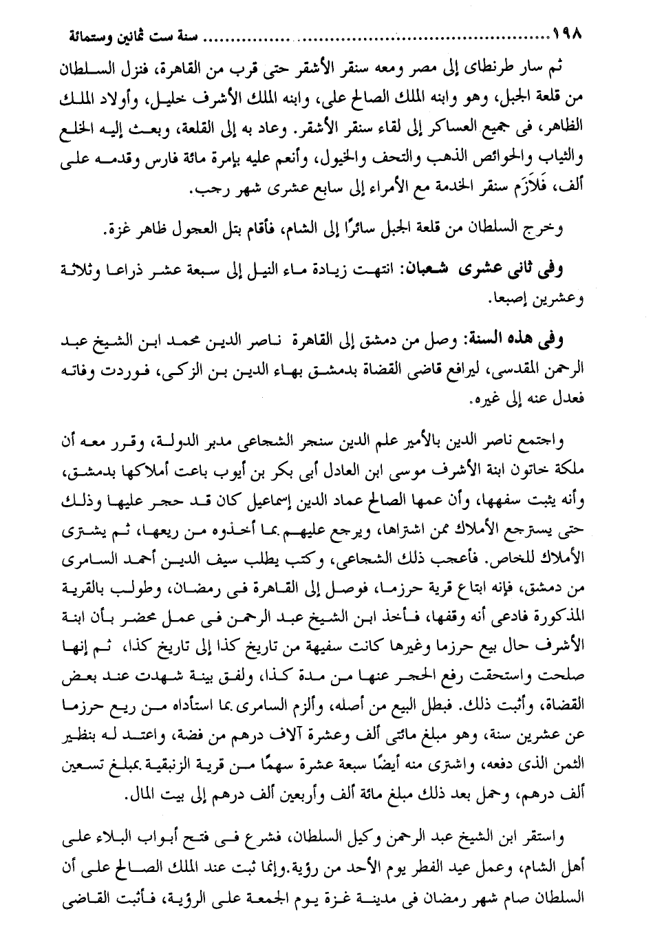 ثمَّ سَار طرنطاي إِلَى مصر وَمَعَهُ سنفر الْأَشْقَر حَتَّى قرب من القاهر فَنزل السُّلْطَان من قلعة الْجَبَل وَهُوَ وَابْنه الْملك الصَّالح على وَابْنه الْملك الْأَشْرَف خَلِيل وَأَوْلَاد الْملك الظَّاهِر فِي جَمِيع العساكر إِلَى لِقَاء سنقر الْأَشْقَر. وَعَاد بِهِ إِلَى القلعة وَبعث إِلَيْهِ الْخلْع وَالثيَاب والحوائص الذَّهَب والتحف والخيول وأنعم عَلَيْهِ بإمرة مائَة فَارس وَقدمه على ألف فلازم سنقر الْخدمَة مَعَ الْأُمَرَاء إِلَى سَابِع عشري شهر رَجَب. وَخرج السُّلْطَان من قلعة الْجَبَل سائرا إِلَى الشَّام فَأَقَامَ بتل العجول ظَاهر غَزَّة. وَفِي ثَانِي عشري شعْبَان: انْتَهَت زِيَادَة مَاء النّيل إِلَى سَبْعَة عشر ذِرَاعا وَثَلَاثَة وَعشْرين إصبعا. وَفِي هَذِه السّنة: وصل من دمشق إِلَى الْقَاهِرَة نَاصِر الدّين مُحَمَّد ابْن الشَّيْخ عبد الرَّحْمَن الْمَقْدِسِي ليرافع قَاضِي الْقُضَاة بِدِمَشْق بهاء الدّين بن الزكي فوردت وَفَاته فَعدل عَنهُ إِلَى غَيره. وَاجْتمعَ نَاصِر الدّين بالأمير علم الدّين سنجر الشجاعي مُدبر الدولة وَقرر مَعَه أَن ملكة خاتون ابْنة الْأَشْرَف مُوسَى ابْن الْعَادِل أبي بكر بن أَيُّوب باعت أملاكها بِدِمَشْق وَأَنه يثبت سفهها وَأَن عَمها الصَّالح عماد الدّين إِسْمَاعِيل كَانَ قد حجر عَلَيْهَا وَذَلِكَ حَتَّى يسترجع الْأَمْلَاك مِمَّن اشْتَرَاهَا وَيرجع عَلَيْهِم. بِمَا أَخَذُوهُ من ريعها ثمَّ يَشْتَرِي الْأَمْلَاك للخاص. فأعجب ذَلِك الشجاعي وَكتب يطْلب سيف الدّين أَحْمد السامري من دمشق فَإِنَّهُ ابْتَاعَ قَرْيَة حرزما فوصل إِلَى الْقَاهِرَة فِي رَمَضَان وطولب بالقرية الْمَذْكُورَة فادعي أَنه وَقفهَا فَأخذ ابْن الشَّيْخ عبد الرَّحْمَن فِي عمل محْضر بِأَن ابْنة الْأَشْرَف حَال بيع حرزما وَغَيرهَا كَانَت سَفِيهَة من تَارِيخ كَذَا إِلَى تَارِيخ كَذَا ثمَّ إِنَّهَا صلحت واستحقت رفع الْحجر عَنْهَا من مُدَّة كَذَا ولفق بَيِّنَة شهِدت عِنْد بعض الْقُضَاة وَأثبت ذَلِك. فَبَطل البيع من أَصله وألزم السامري بِمَا استأداه من ريع حرزما عَن عشْرين سنة وَهُوَ مبلغ مِائَتي ألف وَعشرَة آلَاف دِرْهَم من فضَّة واعتد لَهُ بنظير الثّمن الَّذِي دَفعه واشتري مِنْهُ أَيْضا سَبْعَة عشرَة سَهْما من قَرْيَة الزنبقية. بمبلغ تسعين ألف دِرْهَم وَحمل بعد ذَلِك مبلغ مائَة ألف وَأَرْبَعين ألف دِرْهَم إِلَى بَيت المَال. وَاسْتقر ابْن الشَّيْخ عبد الرَّحْمَن وَكيل السُّلْطَان فشرع فِي فتح أَبْوَاب الْبلَاء على أهل الشَّام وَعمل عيد الْفطر يَوْم الْأَحَد من رُؤْيَة. وَإِنَّمَا ثَبت عِنْد الْملك الصَّالح على أَن السُّلْطَان صَامَ شهر رَمَضَان فِي مَدِينَة غَزَّة يَوْم الْجُمُعَة على الرُّؤْيَة فَأثْبت القَاضِي