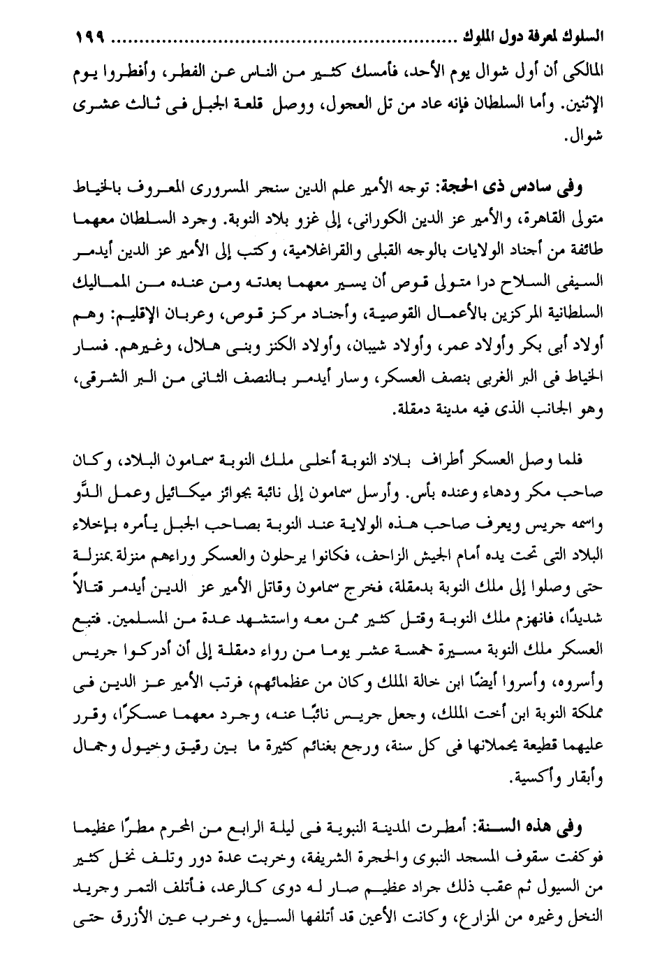 الْمَالِكِي أَن أول شَوَّال يَوْم الْأَحَد فَأمْسك كثير من النَّاس عَن الْفطر وأفطروا يَوْم الْإِثْنَيْنِ. وَأما السُّلْطَان فَإِنَّهُ عَاد من تل العجول وَوصل قلعة الْجَبَل فِي ثَالِث عشري شَوَّال. وَفِي سادس ذِي الْحجَّة: توجه الْأَمِير علم الدّين سنجر المسروري الْمَعْرُوف بالخياط مُتَوَلِّي الْقَاهِرَة والأمير عز الدّين الكوراني إِلَى غَزْو بِلَاد النّوبَة. وجرد السُّلْطَان مَعَهُمَا طَائِفَة من أجناد الولايات بِالْوَجْهِ القبلي والقراغلامية وَكتب إِلَى الْأَمِير عز الدّين أيدمر السيفي السِّلَاح درا مُتَوَلِّي قوص أَن يسير مَعَهُمَا بعدته وَمن عِنْده من المماليك السُّلْطَانِيَّة المركزين بِالْأَعْمَالِ القوصية وأجناد مَرْكَز قوص وعربان الإقليم: وهم أَوْلَاد أبي بكر وَأَوْلَاد عمر وَأَوْلَاد شَيبَان وَأَوْلَاد الْكَنْز وَبني هِلَال وَغَيرهم. فَسَار الْخياط فِي الْبر الغربي بِنصْف الْعَسْكَر وَسَار أيدمر بِالنِّصْفِ الثَّانِي من الْبر الشَّرْقِي وَهُوَ الْجَانِب الَّذِي فِيهِ مَدِينَة دمقلة. فَلَمَّا وصل الْعَسْكَر أَطْرَاف بِلَاد النّوبَة أخلي ملك النّوبَة سمامون الْبِلَاد وَكَانَ صَاحب مكر ودهاء وَعِنْده بَأْس. وَأرْسل سمامون إِلَى نائبة بجوائز مِيكَائِيل وَعمل الدو واسْمه جريس وَيعرف صَاحب هَذِه الْولَايَة عِنْد النّوبَة بِصَاحِب الْجَبَل يَأْمُرهُ بإخلاء الْبِلَاد الَّتِي تَحت يَده أَمَام الْجَيْش الزاحف فَكَانُوا يرحلون والعسكر وَرَاءَهُمْ منزلَة بِمَنْزِلَة حَتَّى وصلوا إِلَى ملك النّوبَة بدمقلة مخرج سمامون وَقَاتل الْأَمِير عز الدّين أيدمر قتالاً شَدِيدا فَانْهَزَمَ ملك النّوبَة وَقتل كثير مِمَّن مَعَه وَاسْتشْهدَ عدَّة من الْمُسلمين. فتبع الْعَسْكَر ملك النّوبَة مسيرَة خَمْسَة عشر يَوْمًا من رواء دمقلة إِلَى أَن أدركوا جريس وأسروه وأسروا أَيْضا ابْن خَالَة الْملك وَكَانَ من عظمائهم فرتب الْأَمِير عز الدّين فِي مملكة النّوبَة ابْن أُخْت الْملك وَجعل جريس نَائِبا عَنهُ وجرد مَعَهُمَا عسكراً وَقرر عَلَيْهِمَا قِطْعَة يحملانها فِي كل سنة وَرجع بغنائم كَثِيرَة مَا بَين رَقِيق وخيول وجمال وأبقار وأكسية. وَفِي هَذِه السّنة: أمْطرت الْمَدِينَة النَّبَوِيَّة فِي لَيْلَة الرَّابِع من الْمحرم مَطَرا عَظِيما فوكفت سقوف الْمَسْجِد النَّبَوِيّ والحجرة الشَّرِيفَة وَخَربَتْ عدَّة دور وَتلف نخل كثير من السُّيُول ثمَّ عقب ذَلِك جَراد عَظِيم صَار لَهُ دوِي كالرعد فأتلف التَّمْر وجريد النّخل وَغَيره من الْمزَارِع وَكَانَت الْأَعْين قد أتلفهَا السَّيْل وَخرب عين الْأَزْرَق حَتَّى
