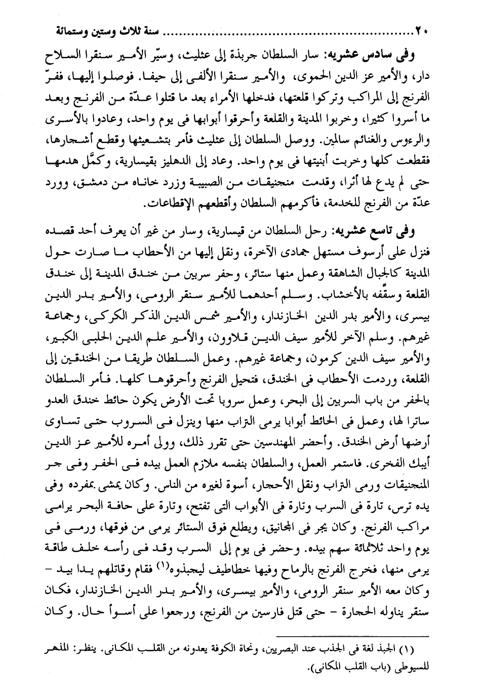 وَفِي سادس عشريه: سَار السُّلْطَان جربذة إِلَى عثليث وسير الْأَمِير سنقرا السِّلَاح دَار والأمير عز الدّين الْحَمَوِيّ والأمير سنقرا الألفي إِلَى حيفا. فوصلوا إِلَيْهَا ففر الفرنج إِلَى المراكب وَتركُوا قلعتها فَدَخلَهَا الْأُمَرَاء بعد مَا قتلوا عدَّة من الفرنج وَبعد مَا أَسرُّوا كثيرا وخربوا الْمَدِينَة والقلعة وأحرقوا أَبْوَابهَا فِي يَوْم وَاحِد وعادوا بالأسري والرءوس والغنائم سَالِمين. وَوصل السُّلْطَان إِلَى عثليث فَأمر بتشعيثها وَقطع أشجارها فَقطعت كلهَا وَخَربَتْ أبنيتها فِي يَوْم وَاحِد. وَعَاد إِلَى الدهليز بقيسارية وكمل هدمها حَتَّى لم يدع لَهَا أثرا وقدمت منجنيقات من الصبيبة وزرد خاناه من دمشق وَورد عدَّة من الفرنج للْخدمَة فأكرمهم السُّلْطَان وأقطعهم الإقطاعات. وَفِي تَاسِع عشريه: رَحل السُّلْطَان من قيسارية وَسَار من غير أَن يعرف أحد قَصده فَنزل على أرسوف مستهل جُمَادَى الْآخِرَة وَنقل إِلَيْهَا من الأحطاب مَا صَارَت حول الْمَدِينَة كالجبال الشاهقة وَعمل مِنْهَا ستائر وحفر سربين من خَنْدَق الْمَدِينَة إِلَى خَنْدَق القلعة وسقفه بالأخشاب. وَسلم أَحدهمَا للأمير سنقر الرُّومِي والأمير بدر الدّين بيسري والأمير بدر الدّين الخازندار والأمير شمس الدّين الذّكر الكركي وَجَمَاعَة غَيرهم. وَسلم الآخر للأمير سيف الدّين قلاوون والأمير علم الدّين الْحلَبِي الْكَبِير والأمير سيف الدّين كرمون وَجَمَاعَة غَيرهم. وَعمل السُّلْطَان طَرِيقا من الخندقين إِلَى القلعة وردمت الأحطاب فِي الخَنْدَق فتحيل الفرنج وأحرقوها كلهَا. فَأمر السُّلْطَان بِالْحفرِ من بَاب السربين إِلَى الْبَحْر وَعمل سروبا تَحت الأَرْض يكون حَائِط خَنْدَق الْعَدو ساترا لَهَا وَعمل فِي الْحَائِط أبوابا يَرْمِي التُّرَاب مِنْهَا وَينزل فِي السروب حَتَّى تَسَاوِي أرْضهَا أَرض الخَنْدَق. وأحضر المهندسين حَتَّى تقرر ذَلِك وَولي أمره للأمير عز الدّين أيبك الفخري. فاستمر الْعَمَل وَالسُّلْطَان بِنَفسِهِ ملازم الْعَمَل بِيَدِهِ فِي الْحفر وَفِي جر المنجنيقات وَرمي التُّرَاب وَنقل الْأَحْجَار أُسْوَة لغيره من النَّاس. وَكَانَ يمشي. بمفرده وَفِي يَده ترس تَارَة فِي السرب وَتارَة فِي الْأَبْوَاب الَّتِي تفتح وَتارَة على حافة الْبَحْر يرامي مراكب الفرنج. وَكَانَ يجر فِي المجانيق ويطلع فَوق الستائر يَرْمِي من فَوْقهَا وَرمي فِي يَوْم وَاحِد ثَلَاثمِائَة سهم بِيَدِهِ. وَحضر فِي يَوْم إِلَى السرب وَقد فِي رَأسه خلف طَاقَة يَرْمِي مِنْهَا فَخرج الفرنج بِالرِّمَاحِ وفيهَا خطاطيف ليجبذوه فَقَامَ وَقَاتلهمْ يدا بيد وَكَانَ مَعَه الْأَمِير سنقر الرُّومِي والأمير بيسري والأمير بدر الدّين الخازندار فَكَانَ سنقر يناوله الْحِجَارَة حَتَّى قتل فارسين من الفرنج وَرَجَعُوا على أَسْوَأ حَال. وَكَانَ