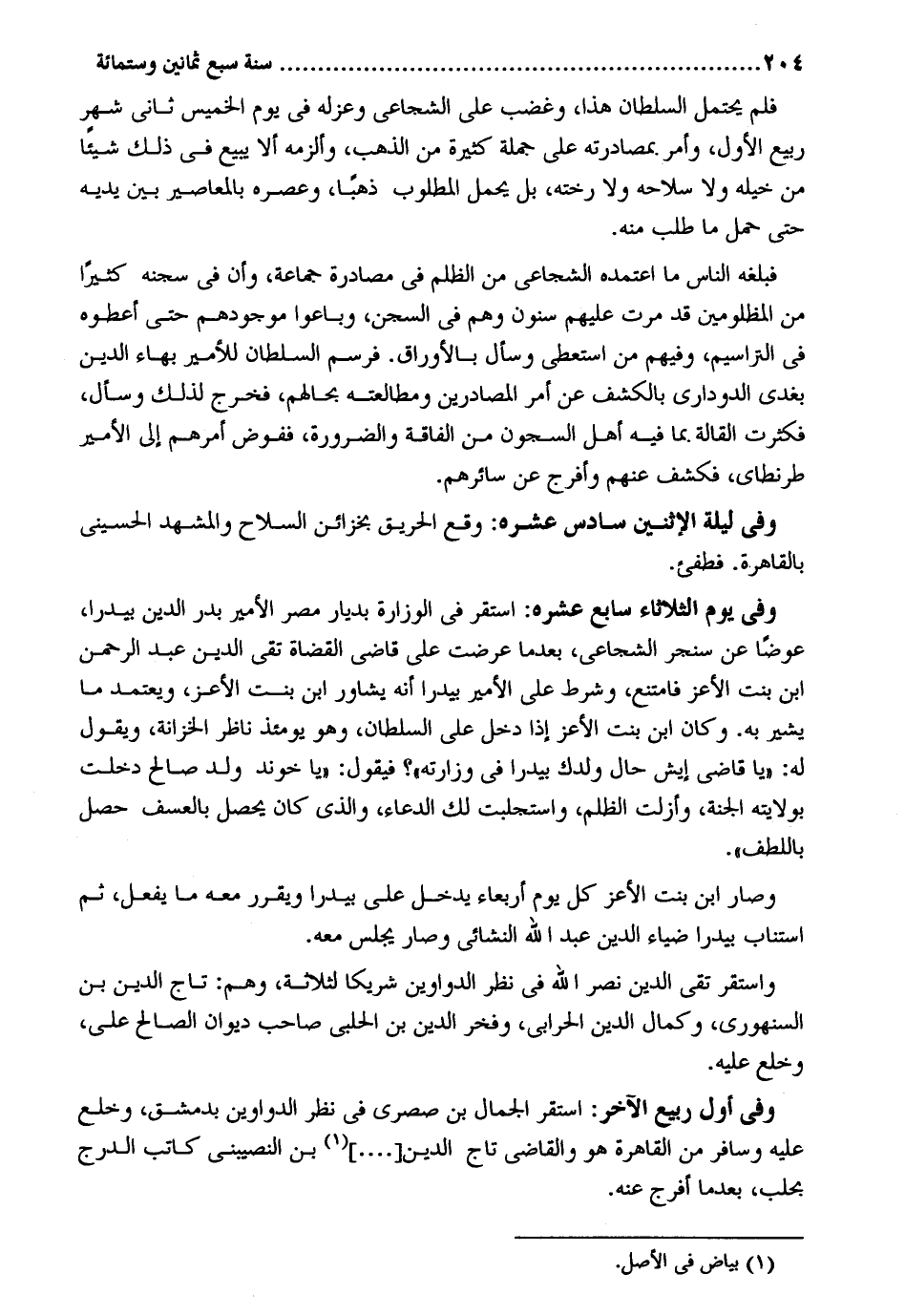 فَلم يحْتَمل السُّلْطَان هَذَا وَغَضب على الشجاعي وعزله فِي يَوْم الْخَمِيس ثَانِي شهر ربيع الأول وَأمر. بمصادرته على جملَة كَثِيرَة من الذَّهَب وألزمه أَلا يَبِيع فِي ذَلِك شَيْئا من خيله وَلَا سلاحه فَبَلغهُ النَّاس مَا اعْتَمدهُ الشجاعي من الظُّلم فِي مصادرة جمَاعَة وَأَن فِي سجنه كثيرا من المظلومين قد مرت عَلَيْهِم سنُون وهم فِي السجْن وَبَاعُوا موجودهم حَتَّى أَعْطوهُ فِي التراسيم وَفِيهِمْ من استعلى وسال بالأوراق. فرسم السُّلْطَان للأمير بهاء الدّين بغدي الدوداري بالكشف عَن أَمر المصادرين ومطالعته بحالهم فَخرج لذَلِك وَسَأَلَ فكثرت القالة. بِمَا فِيهِ أهل السجون من الْفَاقَة والضرورة ففوض أَمرهم إِلَى الْأَمِير طرنطاي فكشف عَنْهُم وَأَفْرج عَن سَائِرهمْ. وَفِي لَيْلَة الِاثْنَيْنِ سادس عشره: وَقع الْحَرِيق بخزائن السِّلَاح والمشهد الْحُسَيْنِي بِالْقَاهِرَةِ. فطفئ. وَفِي يَوْم الثُّلَاثَاء سَابِع عشره: اسْتَقر فِي الوزارة بديار مصر الْأَمِير بدر الدّين بيدرا عوضا عَن سنجر الشجاعي بَعْدَمَا عرضت على قَاضِي الْقُضَاة تَقِيّ الدّين عبد الرَّحْمَن ابْن بنت الْأَعَز فَامْتنعَ وَشرط على الْأَمِير بيدرا أَنه يشاور ابْن بنت الْأَعَز ويعتمد مَا يُشِير بِهِ. وَكَانَ ابْن بنت الْأَعَز إِذا دخل على السُّلْطَان وَهُوَ يَوْمئِذٍ نَاظر الخزانة وَيَقُول لَهُ: يَا قَاضِي إيش حَال ولدك بيدرا فِي وزارته فَيَقُول: يَا خوند ولد صَالح دخلت بولايته الْجنَّة وأزلت الظُّلم واستجلبت لَك الدُّعَاء وَالَّذِي كَانَ يحصل بالعسف حصل باللطف. وَصَارَ ابْن بنت الْأَعَز كل يَوْم أربعاء يدْخل على بيدرا ويقرر مَعَه مَا يفعل ثمَّ استناب بيدرا ضِيَاء الدّين عبد الله النشائي وَصَارَ يجلس مَعَه. وَاسْتقر تَقِيّ الدّين نصر الله فِي نظر الدَّوَاوِين شَرِيكا لثَلَاثَة وهم: تَاج الدّين بن السنهوري وَكَمَال الدّين الحرابي وفخر الدّين بن الْحلَبِي صَاحب ديوَان الصَّالح على وخلع عَلَيْهِ. وَفِي أول ربيع الآخر: اسْتَقر الْجمال بن صصرى فِي نظر الدَّوَاوِين بِدِمَشْق وخلع عَلَيْهِ وسافر من الْقَاهِرَة هُوَ وَالْقَاضِي تَاج الدّين بن النصيبني كَاتب الدرج بحلب بَعْدَمَا أفرج عَنهُ.