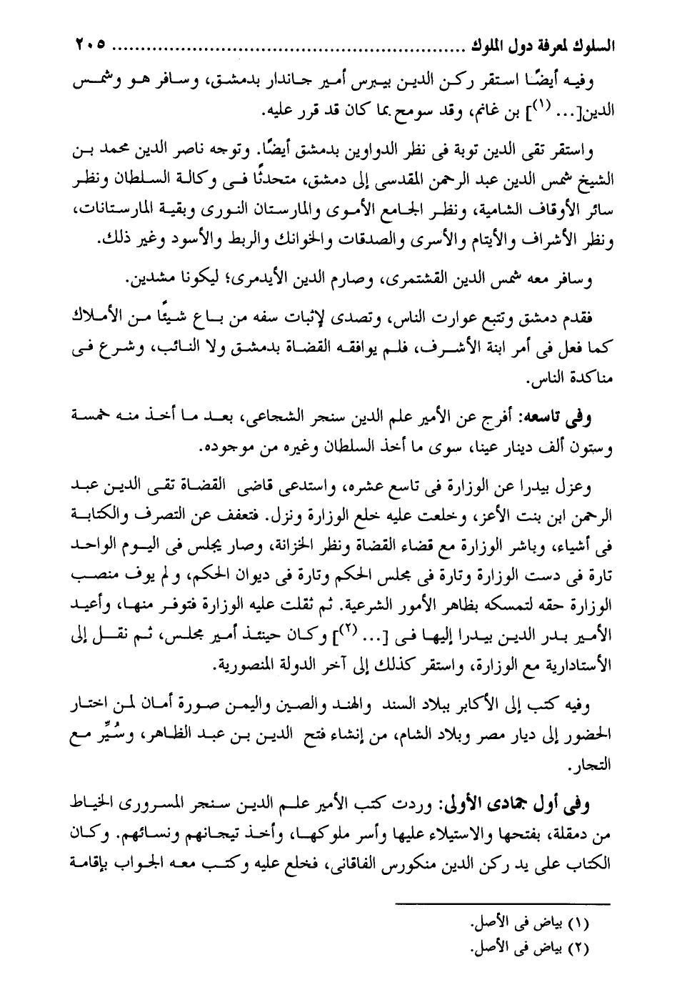 وَفِيه أَيْضا اسْتَقر ركن الدّين بيبرس أَمِير جاندار بِدِمَشْق وسافر هُوَ وشمس الدّين بن غَانِم وَقد سومح. بِمَا كَانَ قد قرر عَلَيْهِ. وَاسْتقر تَقِيّ الدّين تَوْبَة فِي نظر الدَّوَاوِين بِدِمَشْق أَيْضا. وَتوجه نَاصِر الدّين مُحَمَّد بن الشَّيْخ شمس الدّين عبد الرَّحْمَن الْمَقْدِسِي إِلَى دمشق متحدثا فِي وكَالَة السُّلْطَان وَنظر سَائِر الْأَوْقَاف الشامية وَنظر الْجَامِع الْأمَوِي والمارستان النوري وَبَقِيَّة المارستانات وَنظر الْأَشْرَاف والأيتام والأسري وَالصَّدقَات والخوانك والربط وَالْأسود وَغير ذَلِك. وسافر مَعَه شمسي الدّين القشتمري وصارم الدّين الأيدمري ليكونا مشدين. فَقدم دمشق وتتبع عوارت النَّاس وتصدي لإِثْبَات سفه من بَاعَ شَيْئا من الْأَمْلَاك كَمَا فعل فِي أَمر ابْنة الْأَشْرَف فَلم يُوَافقهُ الْقُضَاة بِدِمَشْق وَلَا النَّائِب وَشرع فِي مناكدة النَّاس. وَفِي تاسعه: أفرج عَن الْأَمِير علم الدّين سنجر الشجاعي بعد مَا أَخذ مِنْهُ خَمْسَة وَسِتُّونَ ألف وعزل بيدرا عَن الوزارة فِي تَاسِع عشره واستدعى قَاضِي الْقُضَاة تَقِيّ الدّين عبد الرَّحْمَن ابْن بنت الْأَعَز وخلعت عَلَيْهِ خلع الوزارة وَنزل. فتعفف عَن التَّصَرُّف وَالْكِتَابَة فِي أَشْيَاء وباشر الوزارة مَعَ قَضَاء الْقُضَاة وَنظر الخزانة وَصَارَ يجلس فِي الْيَوْم الْوَاحِد تَارَة فِي دست الوزارة وَتارَة فِي مجْلِس الحكم وَتارَة فِي ديوَان الحكم وَلم يوف منصب الوزاره حَقه لتمسكه بِظَاهِر الْأُمُور الشَّرْعِيَّة. ثمَّ ثقلت عَلَيْهِ الوزارة فتوفر مِنْهَا وأعيد الْأَمِير بدر الدّين بيدرا إِلَيْهَا فِي وَكَانَ حِينَئِذٍ أَمِير مجْلِس ثمَّ نقل إِلَى الأستادارية مَعَ الوزارة وَاسْتقر كَذَلِك إِلَى آخر الدولة المنصورية. وَفِيه كتب إِلَى الأكابر بِبِلَاد السَّنَد والهند والصين واليمن صُورَة أَمَان لمن اخْتَار الْحُضُور إِلَى ديار مصر وبلاد الشَّام من إنْشَاء فتح الدّين بن عبد الظَّاهِر وسير مَعَ التُّجَّار. وَفِي أول جُمَادَى الأولى: وَردت كتب الْأَمِير علم الدّين سنجر المسروري الْخياط من دمقلة بِفَتْحِهَا والاستيلاء عَلَيْهَا وَأسر مُلُوكهَا وَأخذ تيجانهم وَنِسَائِهِمْ. وَكَانَ الْكتاب على يَد ركن الدّين منكورس الفاقاني فَخلع عَلَيْهِ وَكتب مَعَه الْجَواب بِإِقَامَة