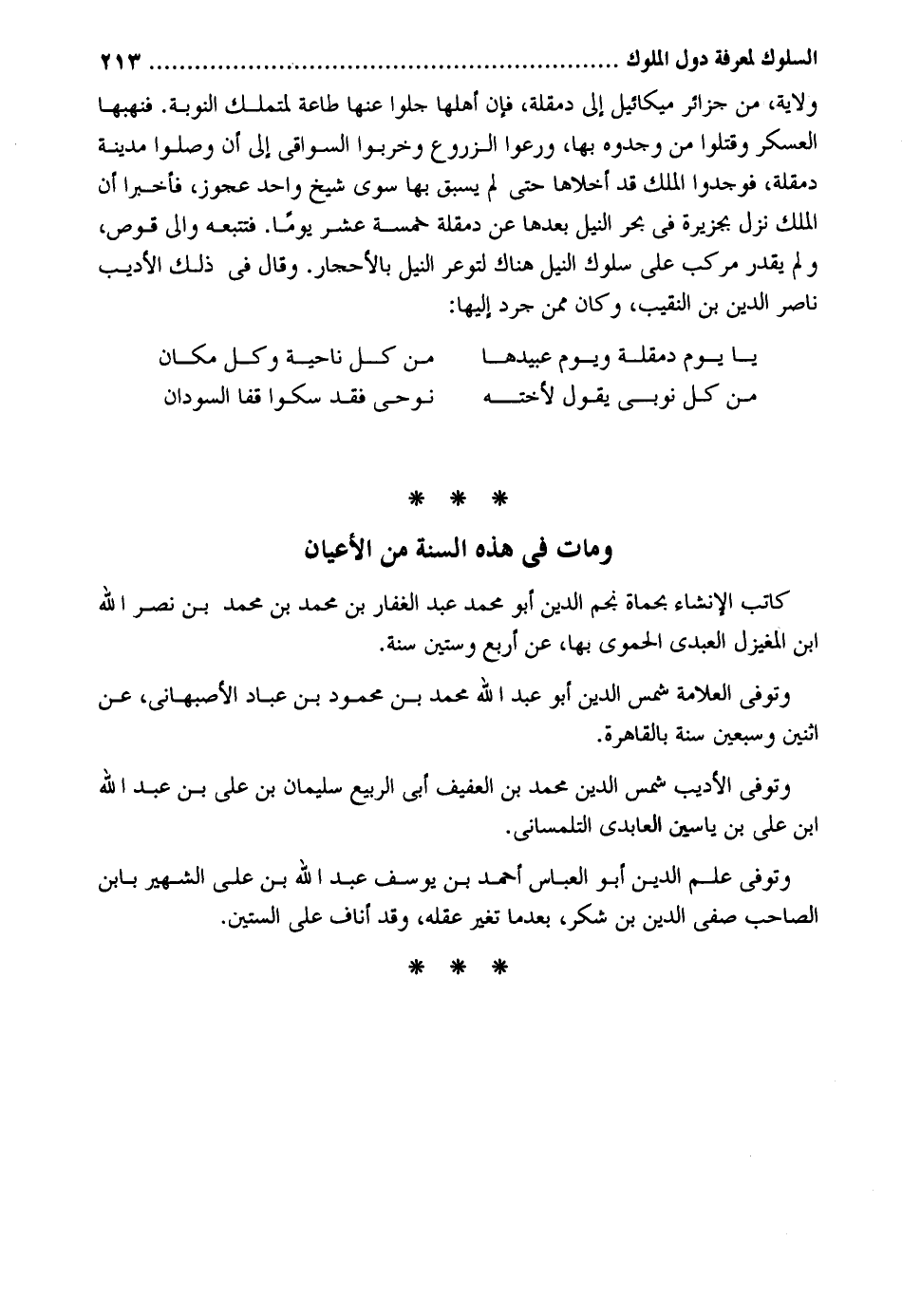 ولَايَة من جزائر مِيكَائِيل إِلَى دمقلة فَإِن أَهلهَا جلوا عَنْهَا طَاعَة لمتملك النّوبَة. فنهبها الْعَسْكَر وَقتلُوا من وجدوه بهَا ورعوا الزروع وخربوا السواقي إِلَى أَن وصلوا مَدِينَة دمقلة فوجدوا الْملك قد أخلاها حَتَّى لم يسْبق بهَا سوي شيخ وَاحِد عَجُوز فأخبرا أَن الْملك نزل بِجَزِيرَة فِي بَحر النّيل بعْدهَا عَن دمقلة خَمْسَة عشر يَوْمًا. فتتبعه وَإِلَى قوص وَلم يقدر مركب على سلوك النّيل هُنَاكَ لتوعر النّيل بالأحجار. وَقَالَ فِي ذَلِك الأديب نَاصِر الدّين بن النَّقِيب وَكَانَ مِمَّن جرد إِلَيْهَا: يَا يَوْم دمقلة وَيَوْم عبيدها من كل نَاحيَة وكل مَكَان من كل نوبي يَقُول لأخته نوحي قد سكوا قفا السودَان وَمَات فِي هَذِه السّنة من الْأَعْيَان كَاتب الْإِنْشَاء بحماة نجم الدّين أَبُو مُحَمَّد عبد الْغفار بن مُحَمَّد بن مُحَمَّد بن نصر الله ابْن المغيزل الْعَبْدي الْحَمَوِيّ بهَا عَن أَربع وَسِتِّينَ سنة. وَتُوفِّي الْعَلامَة شمس الدّين أَبُو عبد الله مُحَمَّد بن مَحْمُود بن عباد الْأَصْبَهَانِيّ عَن اثْنَيْنِ وَسبعين سنة بِالْقَاهِرَةِ. وَتُوفِّي الأديب شمس الدّين مُحَمَّد بن الْعَفِيف أبي الرّبيع سُلَيْمَان بن على بن عبد الله ابْن على بن ياسين العابدي التلمساني. وَتُوفِّي علم الدّين أَبُو الْعَبَّاس أَحْمد بن يُوسُف عبد الله بن على الشهير بِابْن الصاحب صفي الدّين بن شكر بَعْدَمَا تغير عقله وَقد أناف على السِّتين. (سقط: من صفحة 215 إِلَى 229)