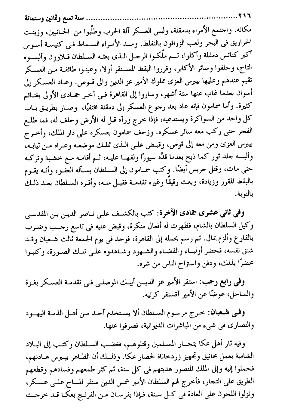 مَكَانَهُ. وَاجْتمعَ الْأُمَرَاء بدمقلة، وَلبس الْعَسْكَر آلَة الْحَرْب وطلبوا من الْجَانِبَيْنِ، وزينت الحراريق فِي الْبَحْر وَلعب الزراقون بالنفلط. وَمد الْأُمَرَاء السماط فِي كَنِيسَة أسوس أكبر كنائس دمقلة وأكلوا، ثمَّ ملكوا الرجل الَّذِي بَعثه السُّلْطَان قلاوون وألبسوه التَّاج، وحلفوا وَسَائِر الأكابر، وقرروا البقط المستقر أَولا، وعينوا طَائِفَة من الْعَسْكَر تقيم عِنْدهم وَعَلَيْهَا يببرس الْعُزَّى مَمْلُوك الْأَمِير عز الدّين وَإِلَى قوص. وَعَاد الْعَسْكَر إِلَى أسوان بَعْدَمَا غَابَ عَنْهَا سِتَّة أشهر، وَسَارُوا إِلَى الْقَاهِرَة فِي آخر جُمَادَى الأولى بغنائم كَثِيرَة. وَأما سمامون فَإِنَّهُ عَاد بعد رُجُوع الْعَسْكَر إِلَى دمقلة مختفياً، وَصَارَ بطرِيق بَاب كل وَاحِد من السواكرة ويستدعيه، فَإِذا خرج وَرَآهُ قبل لَهُ الأَرْض وَحلف لَهُ، فَمَا طلع الْفجْر حَتَّى ركب مَعَه سَائِر عسكره. وزحف سمامون بعسكر على دَار الْملك، وَأخرج يببرس الْعُزَّى وَمن مَعَه إِلَى قوص، وَقبض على الَّذين تملك مَوْضِعه وعراه ثِيَابه، وَألبسهُ جلد ثَوْر كَمَا ذبح بَعْدَمَا قده سيوراً ولفها عَلَيْهِ، ثمَّ أَقَامَهُ مَعَ خَشَبَة وَتَركه حَتَّى مَاتَ، وَقتل جريس أَيْضا. وَكتب سمامون إِلَى السُّلْطَان يسْأَله الْعَفو، وَأَنه يقوم بالبقط الْمُقَرّر وَزِيَادَة، وَبعث رَقِيقا وَغَيره تقدمه فَقبل مِنْهُ، وَأقرهُ السُّلْطَان بعد ذَلِك بالنوبة. وَفِي ثَانِي عشرى جُمَادَى الْآخِرَة: كتب بالكشف على نَاصِر الدّين بن الْمَقْدِسِي وَكيل السُّلْطَان بِالشَّام، فظهرت لَهُ أَفعَال مُنكرَة، وَقبض عَلَيْهِ فِي تَاسِع رَجَب وَضرب بالقارع وألزم بِمَال. ثمَّ رسم بحملة إِلَى الْقَاهِرَة، فَوجدَ فِي يَوْم الْجُمُعَة ثَالِث شعْبَان وَقد شنق نَفسه، فَحَضَرَ أَوْلِيَاء وَالْقَضَاء وَالشُّهُود وشاهدوه على تِلْكَ الصُّورَة، وَكَتَبُوا محضراً بذلك، وَدفن واستراح النَّاس من شَره. وَفِي رَابِع رَجَب: اسْتَقر الْأَمِير عز الدّين أيبك الموصلى فِي تقدمه الْعَسْكَر بغزة والساحل، عوضا عَن الْأَمِير آقسنقر كرتيه. وَفِي شعْبَان: خرج مرسوم السُّلْطَان أَلا يستخدم أحد من أهل الذِّمَّة الْيَهُود وَالنَّصَارَى فِي شَيْء من المباشرات الديوانية، فصرفوا عَنْهَا. وَفِيه ثار أهل عكا بتجار الْمُسلمين وقتلوها، فَغَضب السُّلْطَان وَكتب إِلَى الْبِلَاد الشامية بِعَمَل مجانيق وتجهيز زردخاناة لحصار عكا. وَذَلِكَ أَن الظَّاهِر بيبرس هادنهم، فحملوا إِلَيْهِ وَإِلَى الْملك الْمَنْصُور هديتهم فِي كل سنة، ثمَّ كثر طمعهم وفسادهم وقطعهم الطَّرِيق على االتجار، فَأخْرج لَهُم السُّلْطَان الْأَمِير شمس الدّين سنقر المساح على عَسْكَر، ونزلوا اللجون على الْعَادة فِي كل سنة، فَإِذا بفرسان من الفرنج بعكا قد خرجت