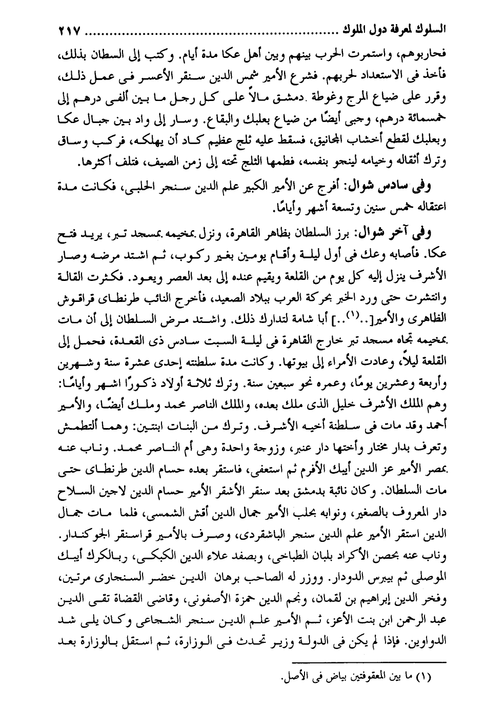 فحاربوهم، واستمرت الْحَرْب بَينهم وَبَين أهل عكا مُدَّة أَيَّام. وَكتب إِلَى السُّلْطَان بذلك، فَأخذ فِي الاستعداد لحربهم. فشرع الْأَمِير شمس الدّين سنقر الأعسر فِي عمل ذَلِك، وَقرر على ضيَاع المرج وغوطه دمشق مَالا على كل رجل مَا بَين ألفي دِرْهَم إِلَى خَمْسمِائَة دِرْهَم، وجبى أَيْضا من ضيَاع بعلبك وَالْبِقَاع. وَسَار إِلَى وَاد بَين جبال عكا وبعلبك لقطع أخشاب المجانيق، فَسقط عَلَيْهِ ثلج عَظِيم كَاد أَن يهلكه، فَركب وسَاق وَترك أتقاله وخيامه لينجو بِنَفسِهِ، فطمها الثَّلج تَحْتَهُ إِلَى زمن الصَّيف، فَتلف أَكْثَرهَا. وَفِي سادس شَوَّال: أفرج عَن الْأَمِير الْكَبِير علم الدّين سنجر الْحلَبِي، فَكَانَت مُدَّة اعتقاله خمس سِنِين وَتِسْعَة أشهر وأياماً. وَفِي آخر شَوَّال: برز السُّلْطَان بِظَاهِر الْقَاهِرَة، وَنزل بمخيمه بِمَسْجِد تبر، يُرِيد فتح عكا. فَأَصَابَهُ وعك فِي أول لَيْلَة وَأقَام يَوْمَيْنِ بِغَيْر ركُوب، ثمَّ اشْتَدَّ مَرضه وَصَارَ الْأَشْرَف ينزل إِلَيْهِ كل يَوْم من القلعة وَيُقِيم عِنْده إِلَى بعد الْعَصْر وَيعود. فكثرت القالة وانتشرت حَتَّى ورد الْخَبَر بحركة الْعَرَب بِبِلَاد الصَّعِيد، فَأخْرج النَّائِب طرنطاي قراقوش الظَّاهِرِيّ والأمير [ ... . .] أَبَا شامة لتدراك ذَلِك. وَاشْتَدَّ مرض السُّلْطَان إِلَى أَن مَاتَ بمخيمة تجاه مَسْجِد تبر خَارج الْقَاهِرَة فِي لَيْلَة السبت سادس ذِي الْقعدَة، فَحمل إِلَى القلعة لَيْلًا، وعادت الْأُمَرَاء إل بيوتها. وَكَانَت مُدَّة سلطنته إِحْدَى عشرَة سنة وشهرين وَأَرْبَعَة وَعشْرين يَوْمًا، وعمره نَحْو سبعين سنة. وَترك ثَلَاثَة أَوْلَاد ذُكُورا اشهر وأياماً: وهم الْملك الْأَشْرَف خَلِيل الَّذِي ملك بعده، وَالْملك الناصار مُحَمَّد وَملك أَيْضا، والأمير أَحْمد وَقد مَاتَ فِي سلطنة أَخِيه الْأَشْرَف. وَترك من الْبَنَات ابْنَتَيْن: وهما ألتطمش وتعرف بدار مُخْتَار وَأُخْتهَا دَار عنبر، وَزَوْجَة وَاحِدَة وَهِي أم النَّاصِر مُحَمَّد. وناب عَنهُ بِمصْر الْأَمِير عز الدّين أيبك الأفرم ثمَّ استعفى. فاستقر بعده حسام الدّين طرنطاي حَتَّى مَاتَ السُّلْطَان. وَكَانَ نائبة بِدِمَشْق بعد سنقر الْأَمِير حسام الدّين لاجين السِّلَاح دَار الْمَعْرُوف بالصغير، ونوابه بحلب الْأَمِير جمال الدّين أقش الشمسي، فَلَمَّا مَاتَ جمال الدّين اسْتَقر الْأَمِير علم الدّين سنجر الباشقردي، وَصرف بالأمير قراسنقر الجو كندار. وناب عَنهُ بحضن الأكراد بلبان الطباخي، وبصفد عَلَاء الدّين الكلبلي، وبالكرك أيبك الموصلى اثم بيبرس الدودار. ووزر لَهُ الصاحب برهَان الدّين خضر السنجاري مرَّتَيْنِ، وفخر الدّين إِبْرَاهِيم بن لُقْمَان، وَنجم الدّين حَمْزَة الأصفوني، وقاضي الْقُضَاة تَقِيّ الدّين عبد الرَّحْمَن ابْن بنت الْأَعَز، ثمَّ الْأَمِير علم الدّين سنجر الشجاعي وَكَانَ يَلِي شدّ الدَّوَاوِين. فَإِذا لم يكن فِي الدولة وَزِير تحدث فِي الوزارة، ثمَّ اسْتَقل بالوزارة بعد