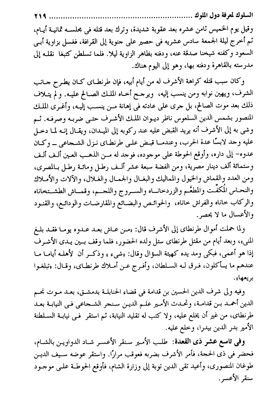 وَقيل يَوْم الْخَمِيس ثامن عشرَة بعد عُقُوبَة شَدِيدَة، وَترك بعد قَتله فِي قَتله فِي مَجْلِسه ثَمَانِيَة أَيَّام، ثمَّ أخرج لَيْلَة الْجُمُعَة سادس عشريه فِي حَصِير على جنوبة إِلَى الفراقة، فَغسل بزاوية أبي السُّعُود وكفنه شَيخنَا صَدَقَة عَنهُ، وَدَفنه بِظَاهِر الزاوية لَيْلًا. فَلَمَّا تسلطن كتبغا نَقله إِلَى مدرسته بِالْقَاهِرَةِ وَدَفنه بهَا، وَهُوَ إِلَى الْيَوْم هُنَاكَ. وَكَانَ سَبَب قَتله كَرَاهَة الْأَشْرَف لَهُ من أَيَّام أَبِيه، فَإِن طرنطاي كَانَ يطْرَح الشّرف، ويهين نوابه وَمن ينْسب غليه، ويرجح أَخَاهُ الْملك الصَّالح عَلَيْهِ. وَلم يتلاف ذَلِك بعد موت الصَّالح، بل جرى على عَادَته فِي إهانة من ينْسب غليه، وأغرى الْملك الْمَنْصُور بشمس الدّين السلعوس نَاظر ديوَان الْملك الْأَشْرَف حَتَّى ضربه وَصَرفه. ثمَّ وشى بِهِ إِلَى الْأَشْرَف أَنه يُرِيد الْقَبْض عَلَيْهِ عِنْد ركُوبه إِلَى الميدان، وَيُقَال إِنَّه لما دخل عَلَيْهِ وجد لابساً عدَّة الْحَرْب، وعندما قبض على طرنطاي نزل الشجاعي - وَكَانَ عدوه - إِلَى دَاره، وأوقع الحوطة على مَوْجُودَة، فَوجدَ لَهُ من الذَّهَب الْعين ألف ألف وسِتمِائَة ألف دِينَار مصرية، وَمن الْفضة سَبْعَة عشر ألف رَطْل وَمِائَة رَطْل بالمصري، وَمن الْعدَد والقماش والخيول والمماليك وَالْبِغَال وَالْجمال والغلال، والآلات والأملاك والنحاس المكفت والمطعم والزردخاناه والسروج واللجم، وقماتش الطشتخاناه والركاب خاناه والفراش خاناه، والحوائص والبضائع والمقاوضات والودائع، والقنود والأعسال مَا لَا يحضر. وَلما حملت أَمْوَال طرنطاي إِلَى الْأَشْرَف قَالَ: ((من عَاشَ بعد عدوه يَوْمًا فقد بلغ المنى)) ، وَبعد أَيَّام من مقتل طرنطاي سُئِلَ وَلَده الْحُضُور، فَلَمَّا وَقع بَين يَدي الْأَشْرَف إِذْ هُوَ أعمي، فَبكى وَمد يَده كَهَيئَةِ السُّؤَال وَقَالَ: ((شَيْء)) وَذكر أَن لأَهله أَيَّامًا مَا عِنْدهم مَا يَأْكُلُون، فرق لَهُ السُّلْطَان، وَأَفْرج عَن أَمْلَاك طرنطاي، وَقَالَ: ((تبلغوا بريعها)) . وَفِيه ولي وَشرف الدّين الْحُسَيْن بن قدامَة فِي قَضَاء الْحَنَابِلَة بِدِمَشْق، بعد موت نجم الدّين أَحْمد بن قدامَة، وتحدث الْأَمِير علم الدّين سنجر الشجاعي فِي النِّيَابَة بعد طرنطاي، من غير أَن يخلع عَلَيْهِ، وَلَا كتب لَهُ تَقْلِيد النِّيَابَة، ثمَّ اسْتَقر فِي نِيَابَة السلطنة الْأَمِير بدر الدّين بيدرا، وخلع عَلَيْهِ. وَفِي تَاسِع عشر ذِي الْقعدَة: طلب الْأَمِير سنقر الأعسر شاد الدواوينك بِالشَّام، فَحَضَرَ فِي ذِي الْحجَّة، فَأمر الْأَشْرَف بضربه فَعُوقِبَ مرَارًا. وَاسْتقر عوضه سيف الدّين طوغان المنصوري، وأعيد تَقِيّ الدّين تَوْبَة إِلَى وزارة الشَّام، فأوقع الحوطة على مَوْجُود سنقر الأعسر.