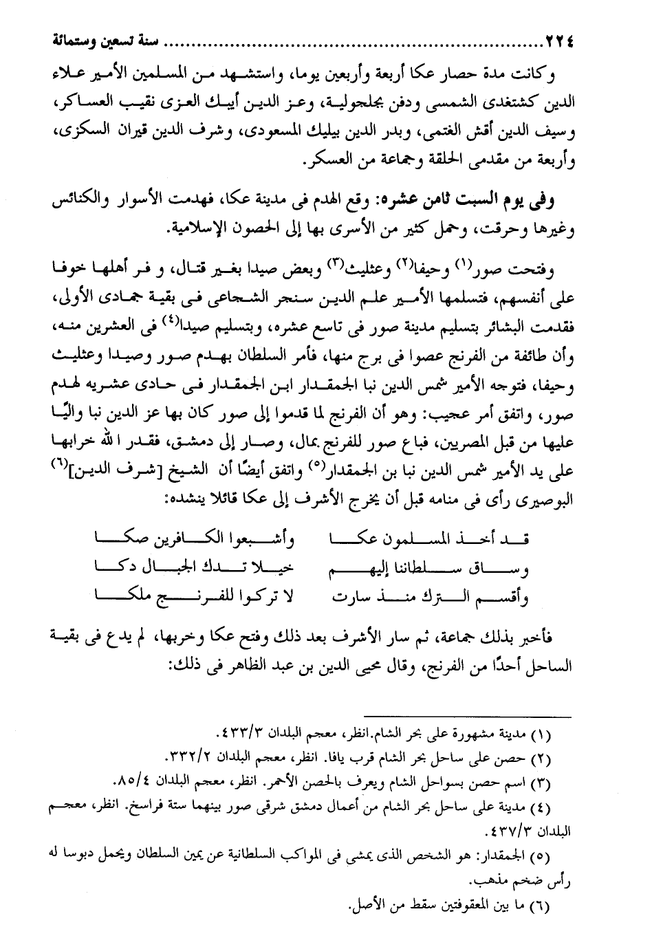 وَكَانَت مُدَّة حِصَار عكا أَرْبَعَة وَأَرْبَعين يَوْمًا، وَاسْتشْهدَ من الْمُسلمين الْأَمِير عَلَاء الدّين كشتغدى الشمسى وَدفن بجلجولية، وَعز الدّين أيبك الْعُزَّى نقيب العساكر، وَسيف الدّين أقش الغتمى، وَبدر الدّين بيليك المَسْعُودِيّ، وَشرف الدّين قيران السكزي، وَأَرْبَعَة من مقدمى الْحلقَة وَجَمَاعَة من الْعَسْكَر. وَفِي يَوْم السبت ثامن عشرَة: وَقع الْهدم فِي مَدِينَة عكا، فهدمت الأسوار والكنائسي وَغَيرهَا وَحرقت، وَحمل كثير من الأسرى بهَا إلحصون الإسلامية. وَفتحت صور وحيفا وعثليت وَبَعض صيدا بِغَيْر قتال، وفر أَهلهَا خوفًا على أنفسهم، فتسلمها الْأَمِير علم الدّين سنجر الشجاعي فِي بَقِيَّة جمادي الأولى، فَقدمت البشائر بِتَسْلِيم مَدِينَة صور فِي تَاسِع عشرَة، وبتسليم صيدا فِي الْعشْرين مِنْهُ، وَأَن طَائِفَة من الفرنج عصوا فِي برج مِنْهَا، فَأمر السُّلْطَان بهدم صور وصيدا وعثليث وحيفاً، فَتوجه الْأَمِير شمس الدّين نبا الجمقدار ابْن الجمقدار فِي حادي عشرِيَّة لهدم صور، وَاتفقَ أَمر عَجِيب: وَهُوَ أَن الفرنج لما قدمُوا إِلَى صور كَانَ بهَا عز الدّين نبا والياً عَلَيْهَا من قبل المصريين، فَبَاعَ صور للفرنج بِمَال، وَصَارَ إِلَى دمشق، فَقدر الله خرابها على يَد الْأَمِير شمس الدّين نبا بن الجمقدار وَاتفقَ أَيْضا أَن الشَّيْخ [شرف الدّين] البوصيري رأى فِي مَنَامه قبل أَن يخرج الْأَشْرَف إِلَى عكا قَائِلا ينشده: