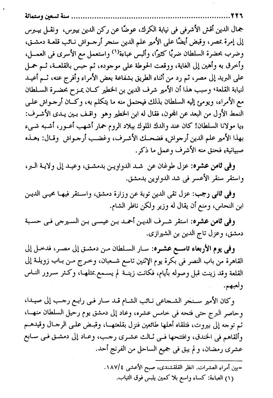 جمال الدّين أقش الأشرفي فِي نِيَابَة الكرك، عوضا عَن ركن الدّين بيبرس، وَنقل بيبرس إِلَى أمره بِمصْر، وَقبض أَيْضا على الْأَمِير علم الدّين سنجر أرجواش نَائِب قلعة دمشق، وَضرب بِحَضْرَة السُّلْطَان ضربا كثيرا، وألبس عباءة وَاسْتعْمل مَعَ الأسرى فِي الْعَمَل، وأخرق بِهِ وأهين إِلَى الْغَايَة، وَوَقعت الحوطة على مَوْجُودَة، ثمَّ حبس بالقلعة، ثمَّ حمل على الْبَرِيد إِلَى مصر، ثمَّ رد من أثْنَاء الطَّرِيق بشفاعة بعض الْأُمَرَاء وَأَفْرج عَنهُ، ثمَّ أُعِيد لنيابة القلعة، وَسبب هَذَا أَن الْأَمِير شرف الدّين بن الخطير كَانَ يمزح بِحَضْرَة السُّلْطَان مَعَ الْأُمَرَاء، ويومئ إِلَيْهِ السُّلْطَان بذلك فَيحْتَمل مِنْهُ مَا يتَكَلَّم بِهِ، وَكَانَ أرجواش على النمط الأول من الْبعد عَن المجون، فَقَالَ لَهُ ابْن الخطير وَهُوَ وَاقِف بَين يَدي الْأَشْرَف: ((يَا مَوْلَانَا السُّلْطَان! كَانَ عِنْد والدك الْمُلُوك بِبِلَاد الرّوم حمَار أَشهب أَعور، أشبه شَيْء بِهَذَا الْأَمِير علم الدّين أرجواش)) فَضَحِك الْأَشْرَف، وَغَضب أرجواش وَقَالَ: هَذِه صبيانية)) فحنق مِنْهُ الْأَشْرَف وَعمل مَا ذكر. وَفِي ثامن عشرَة: عزل طوغان عَن شدّ الدَّوَاوِين بِدِمَشْق، وَعِيد إِلَى ولَايَة الْبر، وَاسْتقر سنقر الأعسر فِي شدّ الدَّوَاوِين بِدِمَشْق. وَفِي ثَانِي رَجَب: عزل تَقِيّ الدّين تَوْبَة عَن وزارة دمشق، وَاسْتقر فِيهَا محيي الدّين ابْن النّحاس، وَمنع أَن يُقَال لَهُ وَزِير وَلَكِن نَاظر الشَّام. وَفِي ثامن عشرَة: اسْتَقر شرف الدّين أَحْمد بن عِيسَى بن السيرجي فِي حسبَة دمشق، وعزل تَاج الدّين بن الشِّيرَازِيّ. وَفِي يَوْم الْأَرْبَعَاء تَاسِع عشرَة: سَار السُّلْطَان من دمشق إِلَى مصر، فَدخل إِلَى الْقَاهِرَة من بَاب النَّصْر فِي بكرَة يَوْم الْإِثْنَيْنِ تَاسِع شعْبَان، وَخرج من بَاب زويلة إِلَى القلعة وَقد زَيْنَب قبل وُصُوله بأيام، فَكَانَت زِينَة لم يسمع بِمِثْلِهَا، وَكثر سرُور النَّاس ولعبهم. وَكَانَ الْأَمِير سنجر الشجاعي نَائِب الشَّام قد سَار فِي رَابِع رَجَب إِلَى صيدا، وحاصر البرج حَتَّى فَتحه فِي خَامِس عشرَة، وَعَاد إِلَى دمشق يَوْم رحيل السُّلْطَان مِنْهَا، ثمَّ توجه إِلَى بيروت، فَتَلقاهُ أَهلهَا طائعين فَنزل بقلعتها، وفبض على الرِّجَال وقيدهم وألقاهم فِي الخَنْدَق، وافتتحها فِي ثَالِث عشرى رَجَب، وَعَاد إِلَى دمشق فِي سَابِع عشرى رَمَضَان، وَلم يبْق فِي جَمِيع السَّاحِل من الفرنج أحد.