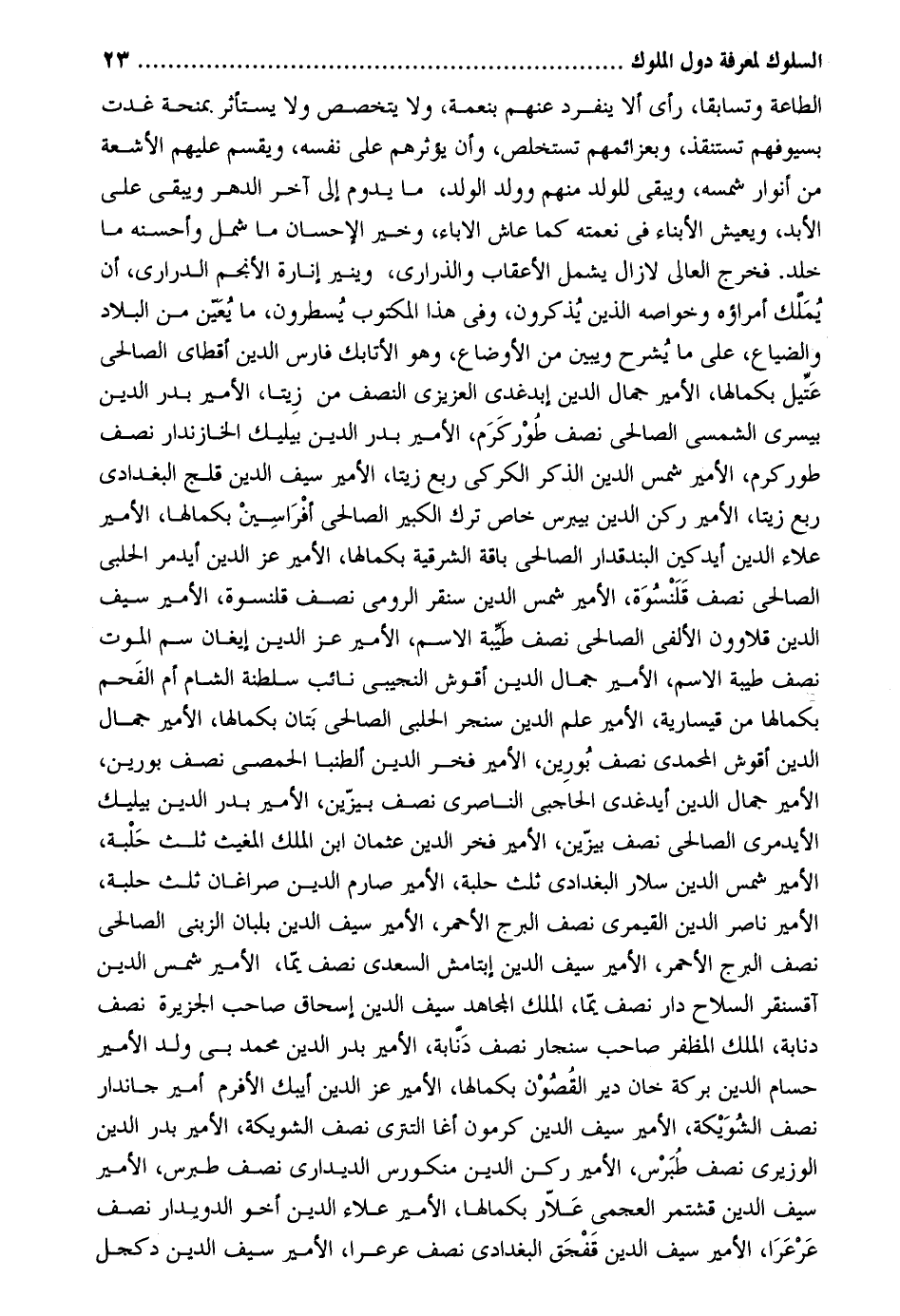 الطَّاعَة وتسابقا رَأْي أَلا ينْفَرد عَنْهُم بِنِعْمَة وَلَا يتخصص وَلَا يستأثر. بمنحة غَدَتْ بسيوفهم تستنقذ وبعزائمهم تستخلص وَأَن يؤثرهم على نَفسه وَيقسم عَلَيْهِم الأشعة من أنوار شمسه ويبقي للْوَلَد مِنْهُم وَولد الْوَلَد مَا يَدُوم إِلَى آخر الدَّهْر ويبقي على الْأَبَد ويعيش الْأَبْنَاء فِي نعْمَته كَمَا عَاشَ الْآبَاء وَخير الْإِحْسَان مَا شَمل وَأحسنه مَا خلد. فَخرج العالي لَا زَالَ يَشْمَل الأعقاب والذراري وينير إنارة الأنجم الدراري أَن يملك أمراؤه وخواصه الَّذين يذكرُونَ وَفِي هَذَا الْمَكْتُوب يسطرون مَا يعين من الْبِلَاد والضياع على مَا يشْرَح وَيبين من الأوضاع وَهُوَ الأتابك فَارس الدّين أقطاي الصَّالِحِي عتيل بكمالها الْأَمِير جمال الدّين إيدغدي العزيزي النّصْف من زيتا الْأَمِير بدر الدّين بيسري الشمسي الصَّالِحِي نصف طور كرم الْأَمِير بدر الدّين بيليك الخازندار نصف طوركرم الْأَمِير شمس الدّين الذّكر الكركي ربع زيتا الْأَمِير سيف الدّين قلج الْبَغْدَادِيّ ربع زيتا الْأَمِير ركن الدّين بيبرس خَاص ترك الْكَبِير الصَّالِحِي أفراسين بكمالها الْأَمِير عَلَاء الدّين أيدكين البندقدار الصَّالِحِي باقة الشرقية بكمالها الْأَمِير عز الدّين أيدمر الْحلَبِي الصَّالِحِي نصف قلنسوة الْأَمِير شمس الدّين سنقر الرُّومِي نصف قلنسوة الْأَمِير سيف الدّين قلاوون الألفي الصَّالِحِي نصف طيبَة الِاسْم الْأَمِير عز الدّين إيغان سم الْمَوْت نصف طيبَة الِاسْم الْأَمِير جمال الدّين أقوش النجيبي نَائِب سلطة الشَّام أم الفحم بكمالها من قيسارية الْأَمِير علم الدّين سنجر الْحلَبِي الصَّالِحِي بتان بكمالها الْأَمِير جمال الدّين أقوش المحمدي نصف بورين الْأَمِير فَخر الدّين ألطنبا الْحِمصِي نصف بورين الْأَمِير جمال الدّين أيدغدي الحاجبي الناصري نصف بيزين الْأَمِير بدر الدّين بيليك الأيدمري الصَّالِحِي نصف بيزين الْأَمِير فَخر الدّين عُثْمَان ابْن الْملك المغيث ثلث حلبة الْأَمِير شمس الدّين سلار الْبَغْدَادِيّ ثلث حلبة الْأَمِير صارم الدّين صراغان ثلث حلبة الْأَمِير نَاصِر الدّين القيمري نصف البرج الْأَحْمَر الْأَمِير سيف الدّين بلبان الزيني الصَّالِحِي نصف البرج الْأَحْمَر الْأَمِير سيف الدّين إبتامش السَّعْدِيّ نصف يما الْأَمِير شمس الدّين آقسنقر السِّلَاح دَار نصف يما الْملك الْمُجَاهِد سيف الدّين إِسْحَاق صَاحب الجزيرة نصف دنابة الْملك المظفر صَاحب سنجار نصف دنابة الْأَمِير بدر الدّين مُحَمَّد بن ولد الْأَمِير حسام الدّين بركَة خَان دير القصون بكمالها الْأَمِير عز الدّين أيبك الأفرم أَمِير جاندار نصف الشويكة الْأَمِير سيف الدّين كرمون أغا التتري نصف الشويكة الْأَمِير بدر الدّين الوزيري نصف طبرس الْأَمِير ركن الدّين منكورس الديداري نصف طبرس الْأَمِير سيف الدّين قشتمر العجمي علار بكمالها الْأَمِير عَلَاء الدّين أَخُو الدويدار نصف عرعرا الْأَمِير سيف الدّين قفجق الْبَغْدَادِيّ نصف عرعرا الْأَمِير سيف الدّين دكجل