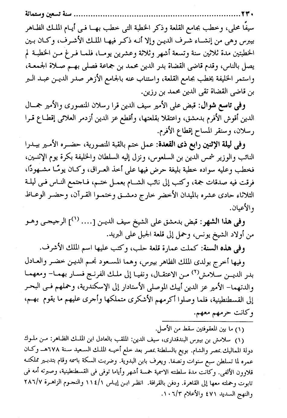 سَيْفا محلي وخطب بِجَامِع القلعة وَذكر الْخطْبَة الَّتِي خطب بهَا فِي أَيَّام الْملك الظَّاهِر بيبرس وَهِي من إنْشَاء شرف الدّين وَإِلَّا إِنَّه ذكر فِيهَا الْملك الْأَشْرَف وَكَانَ بَين الخطتين مُدَّة ثَلَاثِينَ سنة وَتِسْعَة أشهر وَثَلَاثَة وَعشْرين يَوْمًا فَلَمَّا فرغ من الْخطْبَة لم يصل بِالنَّاسِ وَقدم قَاضِي الْقُضَاة بدر الدّين مُحَمَّد بن جمَاعَة فَصلي بهم صَلَاة الْجُمُعَة وَاسْتمرّ الْخَلِيفَة يخْطب بِجَامِع القلعة واستناب عَنهُ بالجامع الْأَزْهَر صدر الدّين وَفِي تَاسِع شَوَّال: قبض على الْأَمِير سيف الدّين قرا رسْلَان المنصوري والأمير جمال الدّين أقوش الأفرم بِدِمَشْق واعتقلا بقلعتها وأقطع عز الدّين أزدمر العلائي إقطاع قرا رسْلَان وسنقر المساح إقطاع الأفرم. وَفِي لَيْلَة الِاثْنَيْنِ رَابِع ذِي الْقعدَة: عمل ختم بالقبة المنصورية حَضَره الْأَمِير بيدرا النَّائِب والوزير شمس الدّين بن السلعوس وَنزل إِلَيْهِ السُّلْطَان والخليفة بكرَة يَوْم الْإِثْنَيْنِ فَخَطب وَعَلِيهِ سوَاده خطْبَة بليغة حرض فِيهَا على أَخذ الْعرَاق وَكَانَ يَوْمًا مشهوداً فرقت فِيهِ صدقَات وَكتب إِلَى نَائِب الشَّام بِعَمَل ختم فَاجْتمع النَّاس فِي لَيْلَة الثُّلَاثَاء حادي عشره بالميدان الْأَخْضَر خَارج دمشق وختموا الْقُرْآن وَحضر الوعاظ والأعيان. وَفِي هَذَا الشَّهْر: قبض بِدِمَشْق على الشَّيْخ سيف الدّين الرجيجي وَهُوَ من أَوْلَاد الشَّيْخ يُونُس وَحمل إِلَى قلعة الْجَبَل على الْبَرِيد. وَفِي هَذِه السّنة: كملت عمَارَة قلعة حلب وَكتب عَلَيْهَا اسْم الْملك الْأَشْرَف. وفيهَا أخرج بولدي الْملك الظَّاهِر بيبرس وهما المسعود نجم الدّين خضر والعادل بدر الدّين سلامش من الاعتقال ونفيا إِلَى ملك الفرنج فَسَار بهما - ومعهما والدتهما - الْأَمِير عز الدّين أيبك الْموصِلِي الأستادار إِلَى الْإسْكَنْدَريَّة وَحَملهمْ فِي الْبَحْر إِلَى الْقُسْطَنْطِينِيَّة فَلَمَّا وصلوا أكْرمهم الأشكري متملكها وأجرى عَلَيْهِم مَا تقوم بهم، وَكَانَت حرمهم مَعَهم.