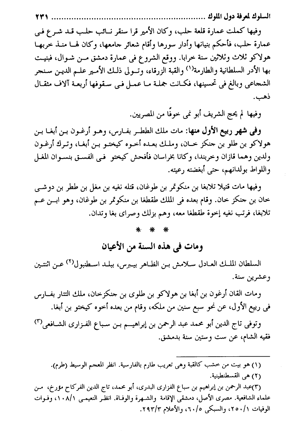 وفيهَا كملت عمَارَة قلعة حلب وَكَانَ الْأَمِير قرا سنقر نَائِب حلب قد شرع فِي عمَارَة حلب فأحكم بنيانها وأدار سورها وَأقَام شَعَائِر جَامعهَا وَكَانَ لَهَا مُنْذُ خربها هولاكو ثَلَاث وَثَلَاثِينَ سنة خراباه وَوَقع الشُّرُوع فِي عمَارَة دمشق من شَوَّال فبنيت بهَا الأدر السُّلْطَانِيَّة والطارمة والقبة الزَّرْقَاء وَتُوفِّي ذَلِك الْأَمِير علم الدّين سنجر الشجاعي وَبَالغ فِي تحسينها فَكَانَت جملَة مَا عمل فِي سقوفها أَرْبَعَة آلَاف مِثْقَال ذهب. وفيهَا لم يحجّ الشريف أَبُو نمي خوفًا من المصريين. وَفِي شهر ربيع الأول مِنْهَا: مَاتَ ملك الططر بِفَارِس وَهُوَ أرغون بن أبغا بن هولاكو بن طلو بن جنكزخان وَملك بعده أَخُوهُ كيختو بن أبغا وَترك أرغون وَلدين وهما قازان وخربندا وَكَانَا بخراسان فأفحش كيختو فِي الْفسق بنسوان الْمغل واللواط بولدانهم حَتَّى أبغضته رَعيته وفيهَا مَاتَ قَتِيلا تلابغا بن منكوتمر بن طوغان قَتله نغيه بن معل بن ططر بن دوشي خَان بن جنكزخان. وَقَامَ بعده فِي الْملك طقطغا بن منكوتمر بن طوخان وَهُوَ ابْن عَم تلابغا فرتب نغيه إخْوَة طقطغا مَعَه وهم بزلك وصراي بغا وتدان. وَمَات فِي هَذِه السّنة من الْأَعْيَان السُّلْطَان الْملك الْعَادِل سلامش بن الظَّاهِر بيبرس بِبَلَد اسطنبول عَن اثْنَتَيْنِ وَعشْرين سنة وَمَات القان أرغون بن أبغا بن هولاكو بن طلوي بن جنكزخان ملك التتار بِفَارِس فِي ربيع الأول عَن نَحْو سبع سِنِين من ملكه وَقَامَ من بعده أَخُوهُ كيختو بن أبغا. وَتُوفِّي تَاج الدّين أَبُو مُحَمَّد عبد الرَّحْمَن بن إِبْرَاهِيم بن سِبَاع الْفَزارِيّ الشَّافِعِي فَقِيه الشَّام عَن سِتّ وَسِتِّينَ سنة بِدِمَشْق.