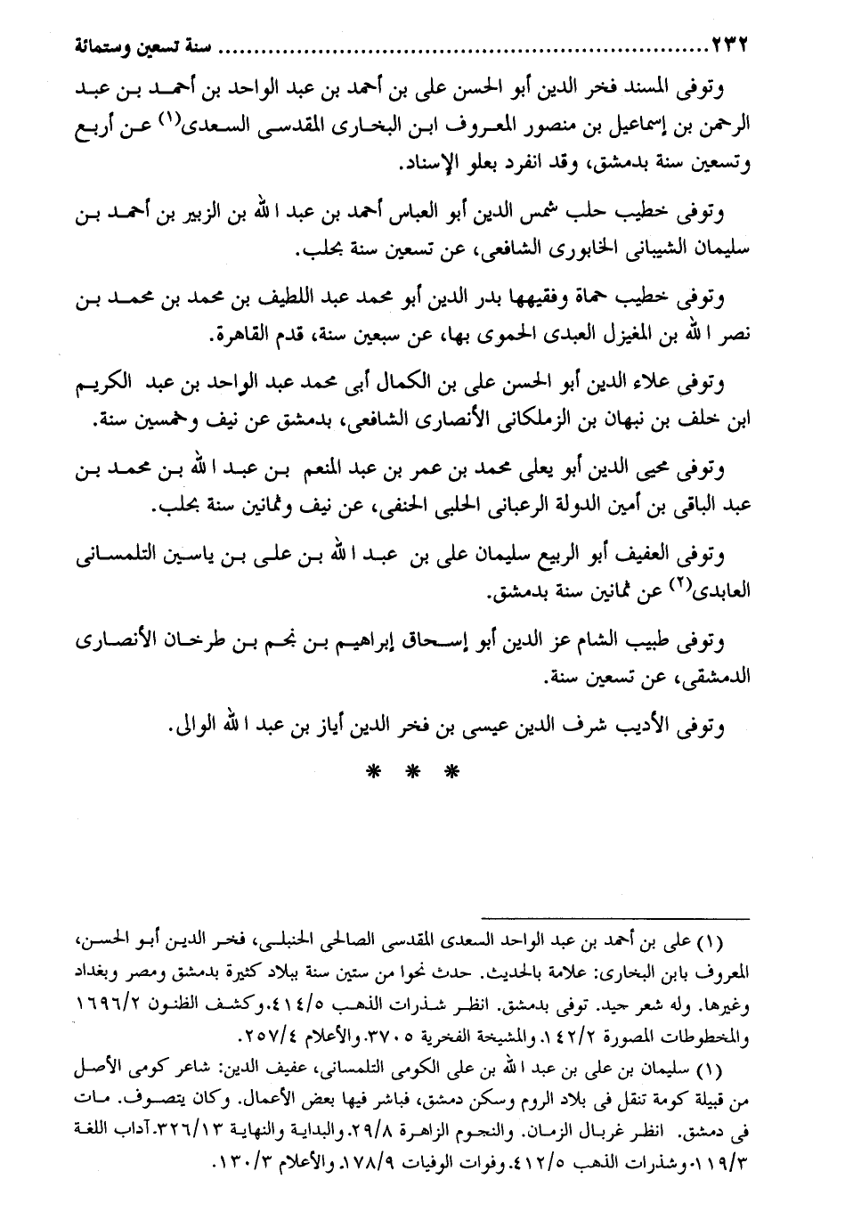 وَتُوفِّي الْمسند فَخر الدّين أَبُو الْحسن على بن أَحْمد بن عبد الْوَاحِد بن أَحْمد بن عبد الرَّحْمَن بن إِسْمَاعِيل بن مَنْصُور الْمَعْرُوف ابْن البُخَارِيّ الْمَقْدِسِي السَّعْدِيّ عَن أَربع وَتِسْعين سنة بِدِمَشْق وَقد انْفَرد بعلو الْإِسْنَاد. وَتُوفِّي خطيب حلب شمس الدّين أَبُو الْعَبَّاس أَحْمد بن عبد الله بن الزبير بن أَحْمد بن سُلَيْمَان الشَّيْبَانِيّ الخابوري الشَّافِعِي عَن تسعين سنة بحلب. وَتُوفِّي خطيب حماة وفقيهها بدر الدّين أَبُو مُحَمَّد عبد اللَّطِيف بن مُحَمَّد بن مُحَمَّد بن نصر الله بن المغيزل الْعَبْدي الْحَمَوِيّ بهَا عَن سبعين سنة قدم الْقَاهِرَة. وَتُوفِّي عَلَاء الدّين أَبُو الْحسن على بن الْكَمَال أبي مُحَمَّد عبد الْوَاحِد بن عبد الْكَرِيم ابْن خلف بن نَبهَان بن الزملكاني الْأنْصَارِيّ الشَّافِعِي بِدِمَشْق عَن نَيف وَخمسين سنة. وَتُوفِّي محيي الدّين أَبُو يعلى مُحَمَّد بن عمر بن عبد الْمُنعم بن عبد الله بن مُحَمَّد بن عبد الْبَاقِي بن أَمِين الدولة الرعباني الْحلَبِي الْحَنَفِيّ عَن نَيف وَثَمَانِينَ سنة بحلب. وَتُوفِّي الْعَفِيف أَبُو الرّبيع سُلَيْمَان على بن عبد الله بن على بن ياسين التلمساني العابدي عَن ثَمَانِينَ سنة بِدِمَشْق. وَتُوفِّي طَبِيب الشَّام عز الدّين أَبُو إِسْحَاق إِبْرَاهِيم بن نجم بن طرخان الْأنْصَارِيّ الدِّمَشْقِي عَن تسعين سنة. وَتُوفِّي الأديب شرف الدّين عيسي بن فَخر الدّين أياز بن عبد الله الْوَالِي.