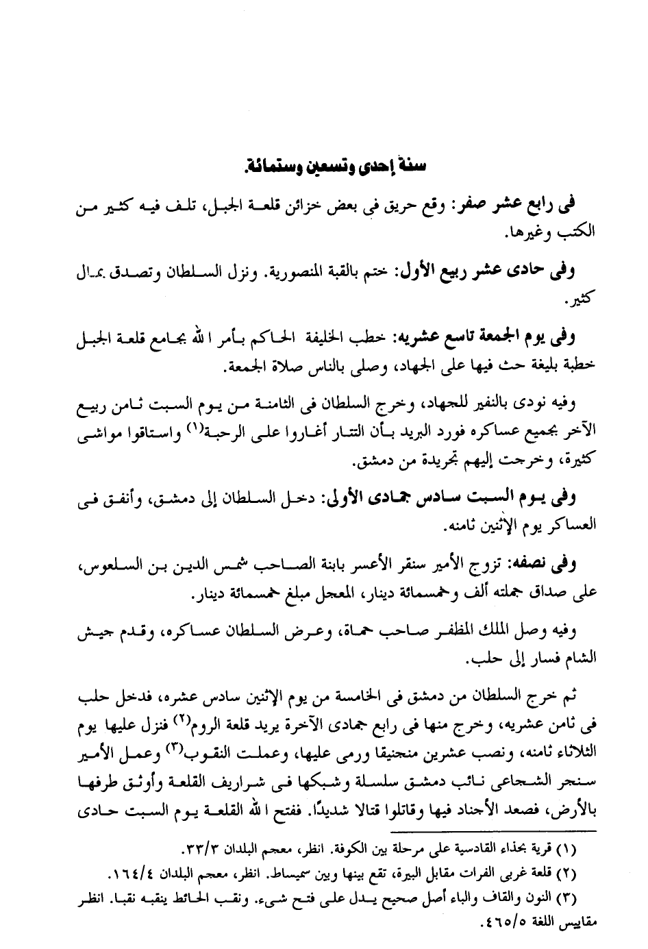 سنة إِحْدَى وَتِسْعين وسِتمِائَة فِي رَابِع عشر صفر: وَقع حريق فِي بعض خَزَائِن قلعه الْجَبَل تلف فِيهِ كثير من الْكتب وَغَيرهَا. وَفِي جُمَادَى عشر ربيع الأول: ختم بالقبة المنصورية. وَنزل السُّلْطَان وَتصدق بِمَال كثير. وَفِي يَوْم الْجُمُعَة تَاسِع عشريه: خطب الْخَلِيفَة الْحَاكِم بِأَمْر الله بِجَامِع قلعة الْجَبَل خطة بليغة حث فِيهَا على الْجِهَاد وَصلي بِالنَّاسِ صَلَاة الْجُمُعَة. وَفِيه نُودي بالنفير للْجِهَاد وَخرج السُّلْطَان فِي الثَّامِنَة من يَوْم السبت ثامن ربيع الآخر بِجَمِيعِ عساكره فورد الْبَرِيد بِأَن التتار أَغَارُوا على الرحبة وَاسْتَاقُوا مواشي كَثِيرَة وَخرجت إِلَيْهِم تجريدة من دمشق. وَفِي يَوْم السبت سادس جُمَادَى الأولى: دخل السُّلْطَان إِلَى دمشق وَأنْفق فِي العساكر يَوْم الِاثْنَيْنِ ثامنه. وَفِي نصفه: تزوج الْأَمِير سنقر الأعسر بِابْنِهِ الصاحب شمس الدّين بن السلعوس على صدَاق جملَته ألف وَخَمْسمِائة دِينَار الْمُعَجل مبلغ خَمْسمِائَة دِينَار. وَفِيه وصل الْملك المظفر صَاحب حماة وَعرض السُّلْطَان عساكره وَقدم جَيش الشَّام فَسَار إِلَى حلب. ثمَّ خرج السُّلْطَان من دمشق فِي الْخَامِسَة من يَوْم الْإِثْنَيْنِ سادس عشره فَدخل حلب فِي ثامن عشريه وَخرج مِنْهَا فِي رَابِع جُمَادَى الْآخِرَة يُرِيد قلعة الرّوم فَنزل عَلَيْهَا يَوْم الثُّلَاثَاء ثامنه وَنصب عشْرين منجنيقا وَرمي عَلَيْهَا وعملت النقوب وَعمل الْأَمِير سنجر الشجاعي نَائِب دمشق سلسلة وشبكها فِي شراريف القلعة وأوثق طرفها بِالْأَرْضِ فَصَعدَ الأجناد فِيهَا وقاتلوا قتالاً شَدِيدا فَفتح الله القلعة يَوْم السبت حادي