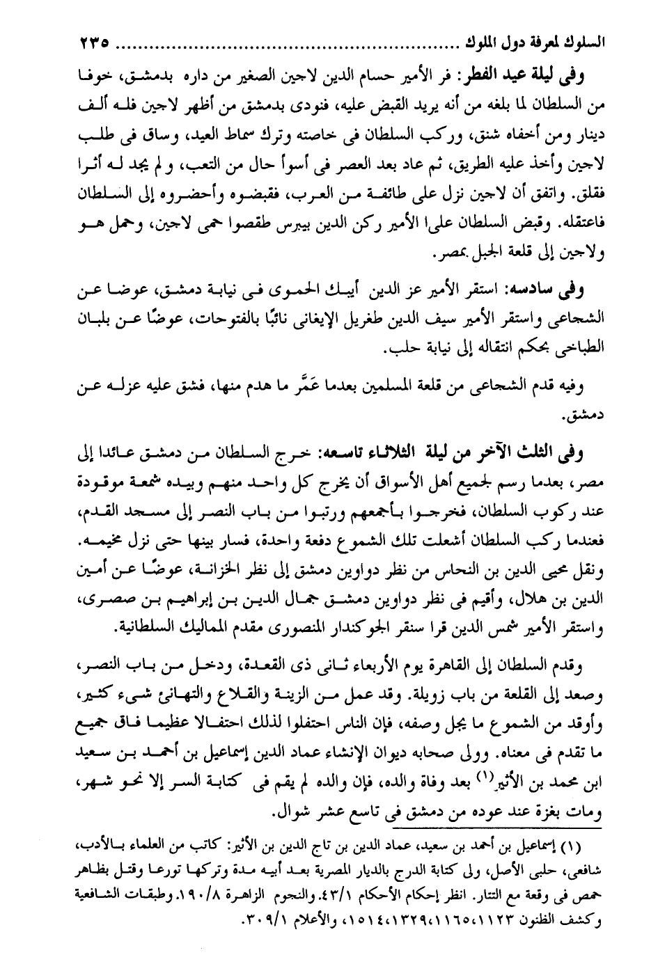 وَفِي لَيْلَة عيد الْفطر: فر الْأَمِير حسام الدّين لاجين الصَّغِير من دَاره بِدِمَشْق خوفًا من السُّلْطَان لما بلغه من أَنه يُرِيد الْقَبْض عَلَيْهِ فَنُوديَ بِدِمَشْق من أظهر لاجين فَلهُ ألف دِينَار وَمن أخفاه شنق وَركب السُّلْطَان فِي خاصته وَترك سماط الْعِيد وسَاق فِي طلب لاجين وَأخذ عَلَيْهِ الطَّرِيق ثمَّ عَاد بعد الْعَصْر فِي أَسْوَأ حَال من التَّعَب وَلم يجد لَهُ أثرا فقلق. وَاتفقَ أَن لاحين نزل على طَائِفَة من الْعَرَب فقبضوه وأحضروه إِلَى السُّلْطَان فاعتقله. وَقبض السُّلْطَان على الْأَمِير ركن الدّين بيبرس طقصوا حمي لاجين وَحمل هُوَ ولاجين إِلَى قلعة الْجَبَل بِمصْر. وَفِي سادسه: اسْتَقر الْأَمِير عز الدّين أيبك الْحَمَوِيّ فِي نِيَابَة دمشق عوضا عَن الشجاعي وَاسْتقر الْأَمِير سيف الدّين طغريل الإيغاني نَائِبا بالفتوحات عوضا عَن بلبان الطباخي بِحكم انْتِقَاله إِلَى نِيَابَة حلب. وَفِيه قدم الشجاعي من قلعة الْمُسلمين بَعْدَمَا عمر مَا هدم مِنْهَا فشق عَلَيْهِ عَزله عَن دمشق. وَفِي الثُّلُث الآخر من لَيْلَة الثُّلَاثَاء تاسعه: خرج السُّلْطَان من دمشق عَائِدًا إِلَى مصر بَعْدَمَا رسم لجَمِيع أهل الْأَسْوَاق أَن يخرج كل وَاحِد مِنْهُم وَبِيَدِهِ شمعة موقودة عِنْد ركُوب السُّلْطَان فَخَرجُوا بأجمعهم ورتبوا من بَاب النَّصْر إِلَى مَسْجِد الْقدَم فعندما ركب السُّلْطَان أشعلت تِلْكَ الشموع دفْعَة وَاحِدَة فَسَار بَينهَا حَتَّى نزل مخيمه. وَنقل محيي الدّين بن النّحاس من نظر دواوين دمشق إِلَى نظر الخزانة عوضا عَن أَمِين الدّين بن هِلَال وأقيم فِي نظر دواوين دمشق جمال الدّين بن إِبْرَاهِيم بن صصرى وَاسْتقر الْأَمِير شمس الدّين قرا سنقر الجوكندار المنصوري مقدم المماليك السُّلْطَانِيَّة. وَقدم السُّلْطَان إِلَى الْقَاهِرَة يَوْم الْأَرْبَعَاء ثَانِي ذِي الْقعدَة وَدخل من بَاب النَّصْر وَصعد إِلَى القلعة من بَاب زويلة. وَقد عمل من الزِّينَة والقلاع والتهاني شَيْء كثير وأوقد من الشموع مَا يجل وَصفه فَإِن النَّاس احتفلوا لذَلِك احتفالا عَظِيما فاق جَمِيع مَا تقدم فِي مَعْنَاهُ. وَولي صحابه ديوَان الْإِنْشَاء عماد الدّين إِسْمَاعِيل بن أَحْمد بن سعيد ابْن مُحَمَّد بن الْأَثِير بعد وَفَاة وَالِده فَإِن وَالِده لم يقم فِي كِتَابَة السِّرّ إِلَّا نَحْو شهر، وَمَات بغرة عِنْد عوده من دمشق فِي تَاسِع عشر شَوَّال.