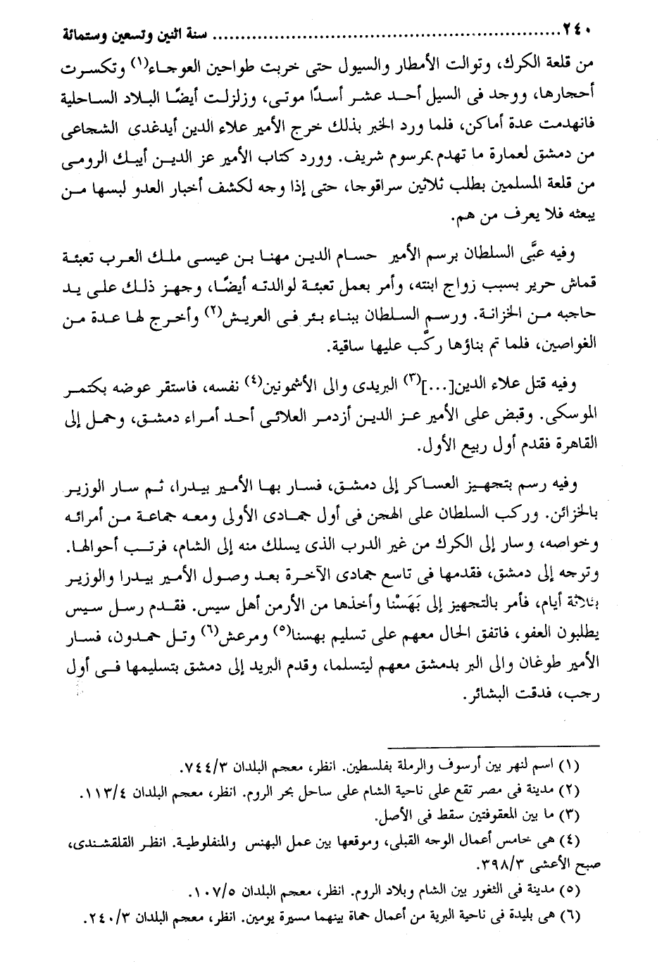 من قلعة الكرك وتوالت الأمطار والسيول حَتَّى خربَتْ طواحين العوجاء وتكسرت أحجارها وَوجد فِي السَّيْل أحد عشر أسداً موتِي وزلزلت أَيْضا الْبِلَاد الساحلية فانهدمت عدَّة أَمَاكِن فَلَمَّا ورد الْخَبَر بذلك خرج الْأَمِير عَلَاء الدّين أيدغدي الشجاعي من فِي دمشق لعمارة مَا تهدم بمرسوم شرِيف. وَورد كتاب الْأَمِير عز الدّين أيبك الرُّومِي من قلعة الْمُسلمين بِطَلَب ثَلَاثِينَ سراقوجا حَتَّى إِذا وَجه لكشف أَخْبَار الْعَدو لبسهَا من يَبْعَثهُ فَلَا يعرف من هم. وَفِيه عبي السُّلْطَان برسم الْأَمِير حسام الدّين مهنا بن عيسي ملك الْعَرَب تعبئة قماش حَرِير بِسَبَب زواج ابْنَته وَأمر بِعَمَل تعبئة لوالدته أَيْضا وجهز ذَلِك على يَد حَاجِبه من الخزانة. ورسم السُّلْطَان بِبِنَاء بِئْر فِي الْعَريش وَأخرج لَهَا عدَّة من الغواصين فَلَمَّا تمّ بناؤها ركب عَلَيْهَا ساقية. وَفِيه قتل عَلَاء الدّين البريدي وَإِلَى الأشمونين نَفسه فاستقر عوضه بكتمر الموسكي. وَقبض على الْأَمِير عز الدّين أزدمر العلائي أحد أُمَرَاء دمشق وَحمل إِلَى الْقَاهِرَة فَقدم أول ربيع الأول. وَفِيه رسم بتجهيز العساكر إِلَى دمشق فَسَار بهَا الْأَمِير بيدرا ثمَّ سَار الْوَزير بالخزائن. وَركب السُّلْطَان على الهجن فِي أول جُمَادَى الأولى وَمَعَهُ جمَاعه من أمرائه وخواصه وَسَار إِلَى الكرك من غير الدَّرْب الَّذِي يسْلك مِنْهُ إِلَى الشَّام فرتب أحوالها. وَتوجه إِلَى دمشق فَقَدمهَا فِي تَاسِع جُمَادَى الْآخِرَة بعد وُصُول الْأَمِير بيدرا والوزير بِثَلَاثَة أَيَّام فَأمر بالتجهيز إِلَى بهسنا وَأَخذهَا من الأرمن أهل سيس. فَقدم رسل سيس يطْلبُونَ الْعَفو فاتفق الْحَال مَعَهم على تَسْلِيم بهسنا ومرعش وتل حمدون فَسَار الْأَمِير طوغان وَإِلَى الْبر بِدِمَشْق مَعَهم ليتسلما وَقدم الْبَرِيد إِلَى دمشق بتسليمها فِي أول رَجَب فدقت البشائر.