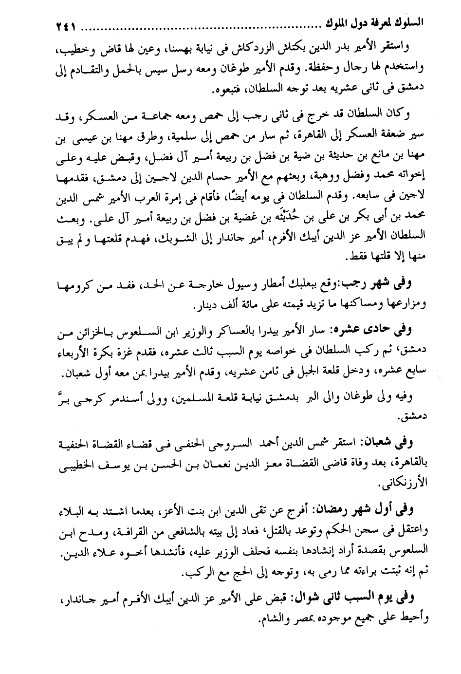 وَاسْتقر الْأَمِير بدر الدّين بكتاش فِي نِيَابَة بهسنا وَعين لَهَا قَاض وخطيب واستخدم لَهَا رجال وحفظة. وَقدم الْأَمِير طوغان وَمَعَهُ رسل سيس بِالْحملِ والتقادم إِلَى دمشق فِي ثَانِي عشريه بعد توجه السُّلْطَان فتبعوه. وَكَانَ السُّلْطَان قد خرج فِي ثَانِي رَجَب إِلَى حمص وَمَعَهُ جمَاعَة من الْعَسْكَر وَقد سير ضعفة الْعَسْكَر إِلَى الْقَاهِرَة ثمَّ سَار من حمص إِلَى سلمية وطرق مهنا بن عيسي بن مهنا بن مَانع بن حَدِيثَة بن غضية بن فضل بن ربيعَة أَمِير آل فضل وَقبض عَلَيْهِ وعَلى إخواته مُحَمَّد وَفضل ووهبة وبعثهم مَعَ الْأَمِير حسام الدّين لاجين إِلَى دمشق فَقَدمهَا لاجين فِي سابعه. وَقدم السُّلْطَان فِي يَوْمه أَيْضا فَأَقَامَ فِي إمرة الْعَرَب الْأَمِير شمس الدّين مُحَمَّد بن أبي بكر بن على بن حَدِيثه بن غضية بن فضل بن ربيعَة أَمِير آل على. وَبعث السُّلْطَان الْأَمِير عز الدّين أيبك الأفرم أَمِير جاندار إِلَى الشوبك فهدم قلعتها وَلم يبْق مِنْهَا إِلَّا قلتهَا فَقَط. وَفِي شهر رَجَب: وَقع ببعلبك أمطار وسيول خَارِجَة عَن الْحَد ففد من كرومها ومزارعها ومساكنها مَا تزيد قِيمَته على مائَة ألف دِينَار. وَفِي حادي عشره: سَار الْأَمِير بيدرا بالعساكر والوزير ابْن السلعوس بالخزائن من دمشق ثمَّ ركب السُّلْطَان فِي خواصه يَوْم السَّبَب ثَالِث عشره فَقدم غَزَّة بكرَة الْأَرْبَعَاء سَابِع عشره وَدخل قلعة الْجَبَل فِي ثامن عشريه وَقدم الْأَمِير بيدرا بِمن مَعَه أول شعْبَان. وَفِيه ولي طوغان وَإِلَى الْبر بِدِمَشْق نِيَابَة قلعة الْمُسلمين وَولي أسندمر كرجي بر دمشق. وَفِي شعْبَان: اسْتَقر شمس الدّين أَحْمد السرُوجِي الْحَنَفِيّ فِي قَضَاء الْقُضَاة الْحَنَفِيَّة بِالْقَاهِرَةِ بعد وَفَاة قَاضِي الْقُضَاة معز الدّين نعْمَان بن الْحسن بن يُوسُف الخطيبي الأرزنكاني. وَفِي أول شهر رَمَضَان: أفرج عَن تَقِيّ الدّين ابْن بنت الْأَعَز بَعْدَمَا اشْتَدَّ بِهِ الْبلَاء واعتقل فِي سجن الحكم وتوعد بِالْقَتْلِ فَعَاد إِلَى بَيته بالشافعي من القرافة ومدح ابْن السلعوس بقصدة أَرَادَ إنشادها بِنَفسِهِ فَحلف الْوَزير عَلَيْهِ فأنشدها أَخُوهُ عَلَاء الدّين. ثمَّ إِنَّه ثبتَتْ بَرَاءَته مِمَّا رمي بِهِ وَفِي يَوْم السبت ثَانِي شَوَّال: قبض على الْأَمِير عز الدّين أيبك الأفرم أَمِير جاندار وأحبط على جَمِيع موجوده بِمصْر وَالشَّام.