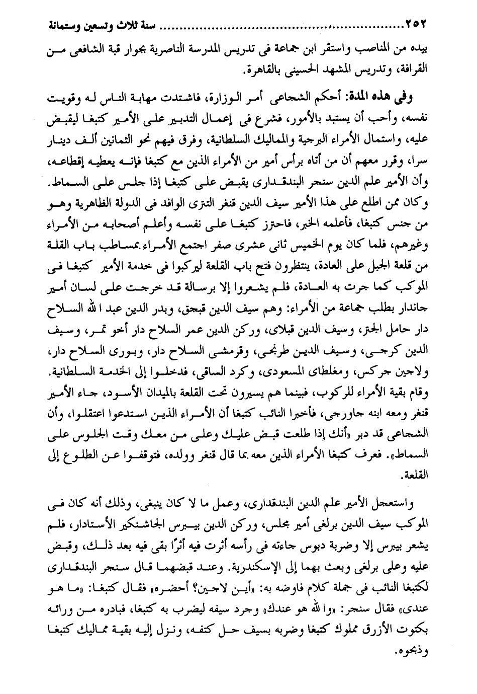 بِيَدِهِ من المناصب وَاسْتقر ابْن جمَاعَة فِي تدريس الْمدرسَة الناصرية بجوار قبَّة الشَّافِعِي من القرافة وتدريس المشهد الْحُسَيْنِي بِالْقَاهِرَةِ. وَفِي هَذِه الْمدَّة: أحكم الشجاعي أَمر الوزارة فاشتدت مهابة النَّاس لَهُ وقويت نَفسه وَأحب أَن يستبد بالأمور فشرع فِي إِعْمَال التَّدْبِير على الْأَمِير كتبغا ليقْبض عَلَيْهِ واستمال الْأُمَرَاء البرجية والمماليك السُّلْطَانِيَّة وَفرق فيهم نَحْو الثَّمَانِينَ ألف دِينَار سرا وَقرر مَعَهم أَن من أَتَاهُ بِرَأْس أَمِير من الْأُمَرَاء الَّذين مَعَ كتبغا فَإِنَّهُ يُعْطِيهِ إقطاعه وَأَن الْأَمِير علم الدّين سنجر البندقداري يقبض على كتبغا إِذا جلس على السماط. وَكَانَ مِمَّن اطلع على هَذَا الْأَمِير سيف الدّين قنغر التتري الْوَافِد فِي الدولة الظَّاهِرِيَّة وَهُوَ من جنس كتبغا فَأعلمهُ الْخَبَر فاحترز كتبغا على نَفسه وَأعلم أَصْحَابه من الْأُمَرَاء وَغَيرهم فَلَمَّا كَانَ يَوْم الْخَمِيس ثَانِي عشري صفر اجْتمع الْأُمَرَاء بمساطب بَاب الْقلَّة من قلعة الْجَبَل على الْعَادة ينتظرون فتح بَاب القلعة ليركبوا فِي خدمَة الْأَمِير كتبغا فِي الموكب كَمَا جرت بِهِ الْعَادة فَلم يشعروا إِلَّا برسالة قد خرجت على لِسَان أَمِير جاندار بِطَلَب جمَاعَة من الْأُمَرَاء: وهم سيف الدّين قبجق وَبدر الدّين عبد الله السِّلَاح دَار حَامِل الجتر وَسيف الدّين قبليي وركن الدّين عمر السِّلَاح دَار أَخُو تمر وَسيف الدّين كرجي وَسيف الدّين طرنجي وقرمشي السِّلَاح دَار وبوري السِّلَاح دَار ولاجين جركسي ومغلطاي المَسْعُودِيّ وكرد الساقي فَدَخَلُوا إِلَى الْخدمَة السُّلْطَانِيَّة. وَقَامَ بَقِيَّة الْأُمَرَاء للرُّكُوب فَبَيْنَمَا هم يَسِيرُونَ تَحت القلعة بالميدان الْأسود جَاءَ الْأَمِير قنغر وَمَعَهُ ابْنه جاورجي فأخبرا النَّائِب كتبغا أَن الْأُمَرَاء الَّذين استدعوا اعتقلوا وَأَن الشجاعي قد دبر أَنَّك إِذا طلعت قبض عَلَيْك وعَلى من مَعَك وَقت الْجُلُوس على السماط. فَعرف كتبغا الْأُمَرَاء الَّذين مَعَه بِمَا قَالَ قنغر وَولده فتوقفوا عَن الطُّلُوع إِلَى القلعة. واستعجل الْأَمِير علم الدّين البندقداري وَعمل مَا لَا كَانَ يَنْبَغِي وَذَلِكَ أَنه كَانَ فِي الموكب سيف الدّين برلغي أَمِير مجْلِس وركن الدّين بيبرس الجاشنكير الأستادار فَلم يشْعر بيبرس إِلَّا وضربة دبوس جَاءَتْهُ فِي رَأسه أثرت فِيهِ أثرا بَقِي فِيهِ بعد ذَلِك وَقبض عَلَيْهِ وعَلى برلغي وَبعث بهما إِلَى الْإسْكَنْدَريَّة. وَعند قبضهما قَالَ سنجر البندقداري لكتبغا النَّائِب فِي جملَة كَلَام فاوضه بِهِ: أَيْن لاجين أحضرهُ فَقَالَ كتبغا: مَا هُوَ عِنْدِي فَقَالَ سنجر: وَالله هُوَ عنْدك وجرد سَيْفه ليضْرب بِهِ كتبغا فبادره من وَرَائه بكتوت الْأَزْرَق مَمْلُوك كتبغا وضربه بِسيف حل كتفه وَنزل إِلَيْهِ بَقِيَّة مماليك كتبغا وذبحوه.