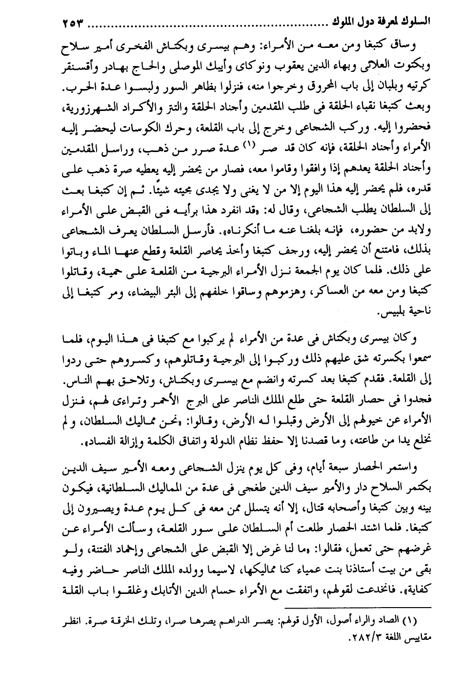 وسَاق كتبغا وَمن مَعَه من الْأُمَرَاء: وهم بيسري وبكتاش الفخري أَمِير سلَاح وبكتوت العلائي وبهاء الدّين يَعْقُوب ونوكاي وأيبك الْموصِلِي والحاج بهادر وأقسنقر كرتيه وبلبان إِلَى بَاب المحروق وَخَرجُوا مِنْهُ فنزلوا بِظَاهِر السُّور ولبسوا عدَّة الْحَرْب. وَبعث كتبغا نقباء الْحلقَة فِي طلب المقدمين وأجناد الْحلقَة والتتر والأكراد الشمهرزورية فَحَضَرُوا إِلَيْهِ. وَركب الشجاعي وَخرج إِلَى بَاب القلعة وحرك الكوسات ليحضر إِلَيْهِ الْأُمَرَاء وأجناد الْحلقَة فَإِنَّهُ كَانَ قد صر عدَّة صرر من ذهب وراسل المقدمين وأجناد الْحلقَة يعدهم إِذا وافقوا وَقَامُوا مَعَه فَصَارَ من يحضر إِلَيْهِ يُعْطِيهِ صرة ذهب على قدره فَلم يحضر إِلَيْهِ هَذَا الْيَوْم إِلَّا من لَا يُغني وَلَا يجدي مَجِيئه شَيْئا. ثمَّ إِن كتبغا بعث إِلَى السُّلْطَان يطْلب الشجاعي وَقَالَ لَهُ: قد انْفَرد هَذَا بِرَأْيهِ فِي الْقَبْض على الْأُمَرَاء ولابد من حُضُوره فَإِنَّهُ بلغنَا عَنهُ مَا أنكرناه. فَأرْسل السُّلْطَان يعرف الشجاعي بذلك فَامْتنعَ أَن يحضر إِلَيْهِ ورجف كتبغا وَأخذ يحاصر القلعة وَقطع عَنْهَا المَاء وَبَاتُوا على ذَلِك. فَلَمَّا كَانَ يَوْم الْجُمُعَة نزل الْأُمَرَاء البرجية من القلعة على حمية وقاتلوا كتبغا وَمن مَعَه من العساكر وهزموهم وَسَاقُوا خَلفهم إِلَى الْبِئْر الْبَيْضَاء وَمر كتبغا إِلَى نَاحيَة بلبيس. وَكَانَ بيسري وبكتاش فِي عدَّة من الْأُمَرَاء لم يركبُوا مَعَ كتبغا فِي هَذَا الْيَوْم فَلَمَّا سمعُوا بكسرته شقّ عَلَيْهِم ذَلِك وركبوا إِلَى البرجية وقاتلوهم وكسروهم حَتَّى ردوا إِلَى القلعة. فَقدم كتبغا بعد كَسرته وانضم مَعَ بيسري وبكتاش وتلاحق بهم النَّاس. فجدوا فِي حِصَار القلعة حَتَّى طلع الْملك النَّاصِر على البرج الْأَحْمَر وتراءى لَهُم فَنزل الْأُمَرَاء عَن خيولهم إِلَى الأَرْض وقبلوا لَهُ الأَرْض وَقَالُوا: نَحن مماليك السُّلْطَان وَلم تخلع يدا من طَاعَته وَمَا قصدنا إِلَّا حفظ نظام الدولة واتفاق الْكَلِمَة وَإِزَالَة الْفساد. وَاسْتمرّ الْحصار سَبْعَة أَيَّام وَفِي كل يَوْم ينزل الشجاعي وَمَعَهُ الْأَمِير سيف الدّين بكتمر السِّلَاح دَار والأمير سيف الدّين طغجي فِي عدَّة من المماليك السُّلْطَانِيَّة فَيكون بَينه وَبَين كتبغا وَأَصْحَابه قتال إِلَّا أَنه يتسلل مِمَّن مَعَه فِي كل يَوْم عدَّة ويصيرون إِلَى كتبغا. فَلَمَّا اشْتَدَّ الْحصار طلعت أم السُّلْطَان على سور القلعة وَسَأَلت الْأُمَرَاء عَن غرضهم حَتَّى تعْمل فَقَالُوا: مَا لنا غَرَض إِلَّا الْقَبْض على الشجاعي وإخماد الْفِتْنَة وَلَو بَقِي من بَيت أستاذنا بنت عمياء كُنَّا مماليكها لاسيما وَولده الْملك النَّاصِر حَاضر وَفِيه كِفَايَة. فانخدعت لقَولهم واتفقت مَعَ الْأُمَرَاء حسام الدّين الأتابك وغلقوا بَاب الْقلَّة