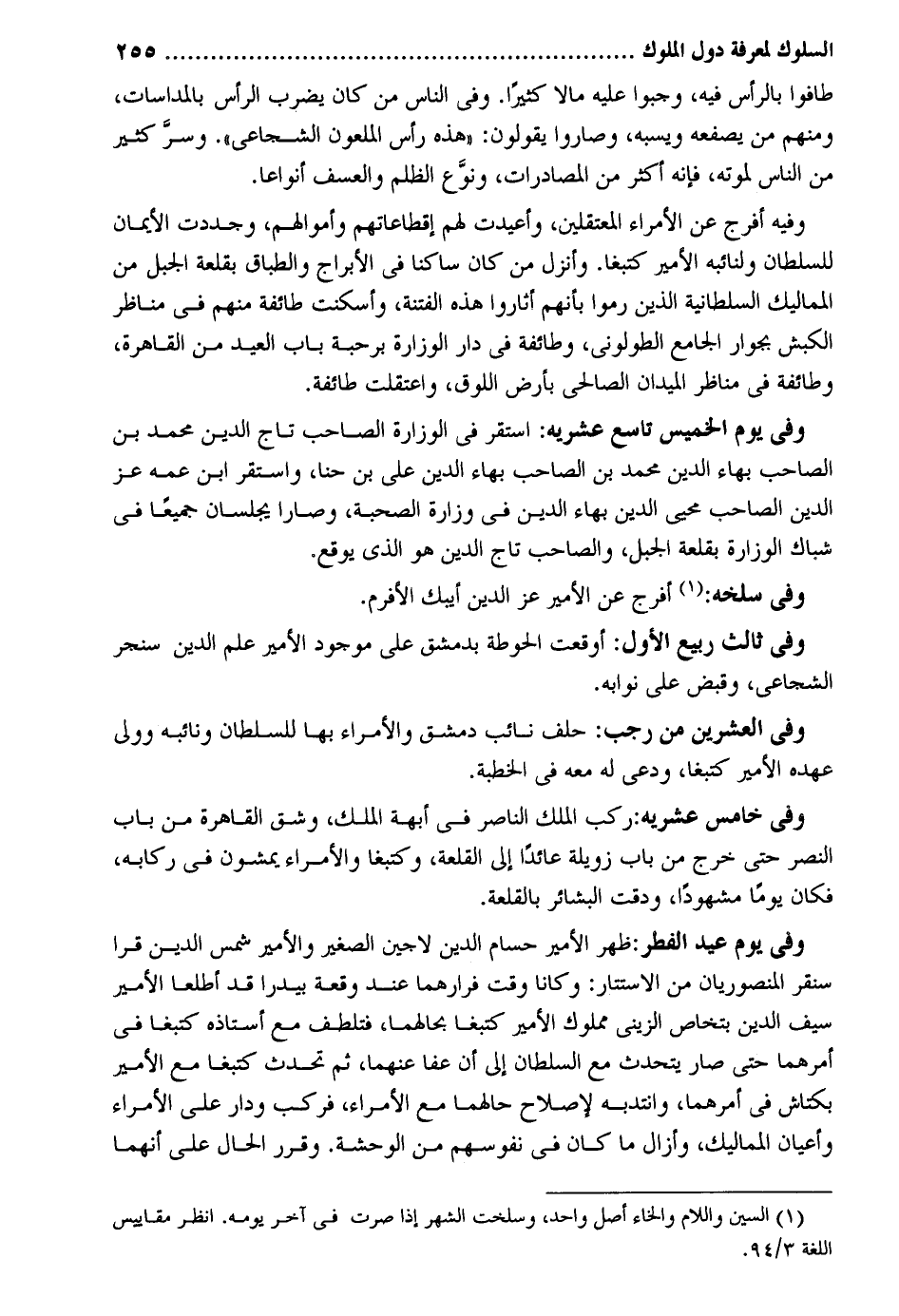 طافوا بِالرَّأْسِ فِيهِ وجبوا عَلَيْهِ مَالا كثيرا. وَفِي النَّاس من كَانَ يضْرب الرَّأْس بالمداسات وَمِنْهُم من يصفعه ويسبه وصاروا يَقُولُونَ: هَذِه رَأس الملعون الشجاعي. وسر كثير من النَّاس لمَوْته فَإِنَّهُ أَكثر من المصادرات وَنَوع الظُّلم والعسف أنواعا. وَفِيه أفرج عَن الْأُمَرَاء المعتقلين وأعيدت لَهُم إقطاعاتهم وَأَمْوَالهمْ وجددت الْأَيْمَان للسُّلْطَان ولنائبه الْأَمِير كتبغا. وَأنزل من كَانَ سَاكِنا فِي الأبراج والطباق بقلعة الْجَبَل من المماليك السُّلْطَانِيَّة الَّذين رموا بِأَنَّهُم أثاروا هَذِه الْفِتْنَة وأسكنت طَائِفَة مِنْهُم فِي مناظر الْكَبْش بجوار الْجَامِع الطولوني وَطَائِفَة فِي دَار الوزارة برحبة بَاب الْعِيد من الْقَاهِرَة وَطَائِفَة فِي مناظر الميدان الصَّالِحِي بِأَرْض اللوق واعتقلت طَائِفَة. وَفِي يَوْم الْخَمِيس تَاسِع عشريه: اسْتَقر فِي الوزارة الصاحب تَاج الدّين مُحَمَّد بن الصاحب بهاء الدّين مُحَمَّد بن الصاحب بهاء الدّين على بن حنا وَاسْتقر ابْن عَمه عز الدّين الصاحب محيي الدّين بهاء الدّين فِي وزارة الصُّحْبَة وصارا يجلسان جَمِيعًا فِي شباك الوزارة بقلعة الْجَبَل والصاحب تَاج الدّين هُوَ الَّذِي يُوقع. وَفِي سلخه: أفرج عَن الْأَمِير عز الدّين أيبك الأفرم. وَفِي ثَالِث ربيع الأول: أوقعت الحوطة بِدِمَشْق على مَوْجُود الْأَمِير علم الدّين سنجر الشجاعي وَفِي الْعشْرين من رَجَب: حلف نَائِب دمشق والأمراء بهَا للسُّلْطَان ونائبه وَولي عَهده الْأَمِير كتبغا ودعي لَهُ مَعَه فِي الْخطْبَة. وَفِي خَامِس عشريه: ركب الْملك النَّاصِر فِي أبهة الْملك وشق الْقَاهِرَة من بَاب النَّصْر حَتَّى خرج من بَاب زويلة عَائِدًا إِلَى القلعة وكتبغا والأمراء يَمْشُونَ فِي ركابه فَكَانَ يَوْمًا مشهوداً ودقت البشائر بالقلعة. وَفِي يَوْم عيد الْفطر: ظهر الْأَمِير حسام الدّين لاحين الصَّغِير والأمير شمس الدّين قرا سنقر المنصوريان من الاستتار: وَكَانَا وَقت فرارهما عِنْد وقْعَة بيدرا قد أطلعا الْأَمِير سيف الدّين بتخاص الزيني مَمْلُوك الْأَمِير كتبغا بحالهما فتلطف مَعَ أستاذه كتبغا فِي أَمرهمَا حَتَّى صَار يتحدث مَعَ السُّلْطَان إِلَى أَن عَفا عَنْهُمَا ثمَّ تحدث كتبغا مَعَ الْأَمِير بكتاش فِي أَمرهمَا وانتدبه لإِصْلَاح حَالهمَا مَعَ الْأُمَرَاء فَركب وَدَار على الْأُمَرَاء وأعيان المماليك وأزال مَا كَانَ فِي نُفُوسهم من الوحشة. وَقرر الْحَال على أَنَّهُمَا