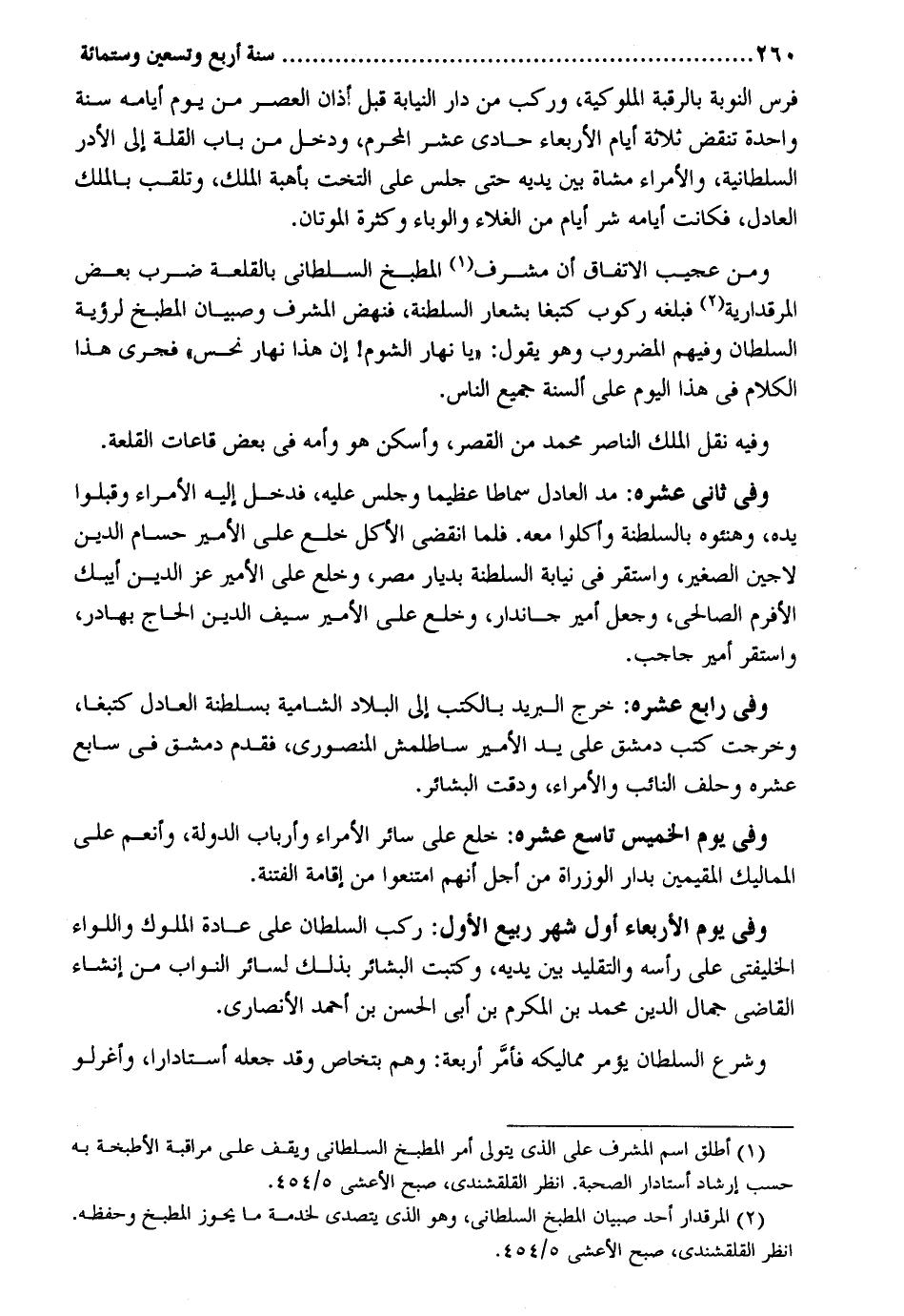 فرس النّوبَة بِالرَّقَبَةِ الملوكية وَركب من دَار النِّيَابَة قبلي أَذَان الْعَصْر من يَوْم أَيَّامه سنة وَاحِدَة تنقض ثَلَاثَة أَيَّام الْأَرْبَعَاء حادي عشر الْمحرم وَدخل من بَاب الْقلَّة إِلَى الأدر السُّلْطَانِيَّة والأمراء مشَاة بَين يَدَيْهِ حَتَّى جلس على التخت بأهبة الْملك وتلقب بِالْملكِ الْعَادِل فَكَانَت أَيَّامه شَرّ أَيَّام من الغلاء والوباء وَكَثْرَة الموتان. وَمن عَجِيب الِاتِّفَاق أَن مشرف المطبخ السلطاني بالقلعة ضرب بعض المرقدارية فَبَلغهُ ركُوب كتبغا بشعار السلطنة فَنَهَضَ المشرف وصبيان المطبخ لرؤية السُّلْطَان وَفِيهِمْ الْمَضْرُوب وَهُوَ يَقُول: يَا نَهَار الشوم! إِن هَذَا نَهَار نحس فجري هَذَا الْكَلَام فِي هَذَا الْيَوْم على أَلْسِنَة جَمِيع النَّاس. وَفِيه نقل الْملك النَّاصِر مُحَمَّد من الْقصر وأسكن هُوَ وَأمه فِي بعض قاعات القلعة. وَفِي ثَانِي عشره: مد الْعَادِل سماطا عَظِيما وَجلسَ عَلَيْهِ فَدخل إِلَيْهِ الْأُمَرَاء وقبلوا يَده وهنئوه بالسلطنة وأكلوا مَعَه. فَلَمَّا انْقَضى الْأكل خلع على الْأَمِير حسام الدّين لاجين الصَّغِير وَاسْتقر فِي نِيَابَة السلطنة بديار مصر وخلع على الْأَمِير عز الدّين أيبك الأفرم الصَّالِحِي وَجعل أَمِير جاندار وخلع على الْأَمِير سيف الدّين الْحَاج بهادر وَاسْتقر أَمِير جاجب. وَفِي رَابِع عشره: خرج الْبَرِيد بالكتب إِلَى الْبِلَاد الشامية بسلطنة الْعَادِل كتبغا وَخرجت كتب دمشق على يَد الْأَمِير ساطلمش المنصوري فَقدم دمشق فِي سَابِع عشره وَحلف النَّائِب والأمراء ودقت البشائر. وَفِي يَوْم الْخَمِيس تَاسِع عشره: خلع على سَائِر الْأُمَرَاء وأرباب الدولة وأنعم على المماليك المقيمين بدار الوزراة من أجل أَنهم امْتَنعُوا من إِقَامَة الْفِتْنَة. وَفِي يَوْم الْأَرْبَعَاء أول شهر ربيع الأول: ركب السُّلْطَان على عَادَة الْمُلُوك واللواء الخليفتي على رَأسه والتقليد بَين يَدَيْهِ وكتبت البشائر بذلك لسَائِر النواب من إنْشَاء القَاضِي جمال الدّين مُحَمَّد بن المكرم بن أبي الْحسن بن أَحْمد الْأنْصَارِيّ. وَشرع السُّلْطَان يُؤمر مماليكه فَأمر أَرْبَعَة: وهم بتخاص وَقد جعله أستادارا وأغرلو