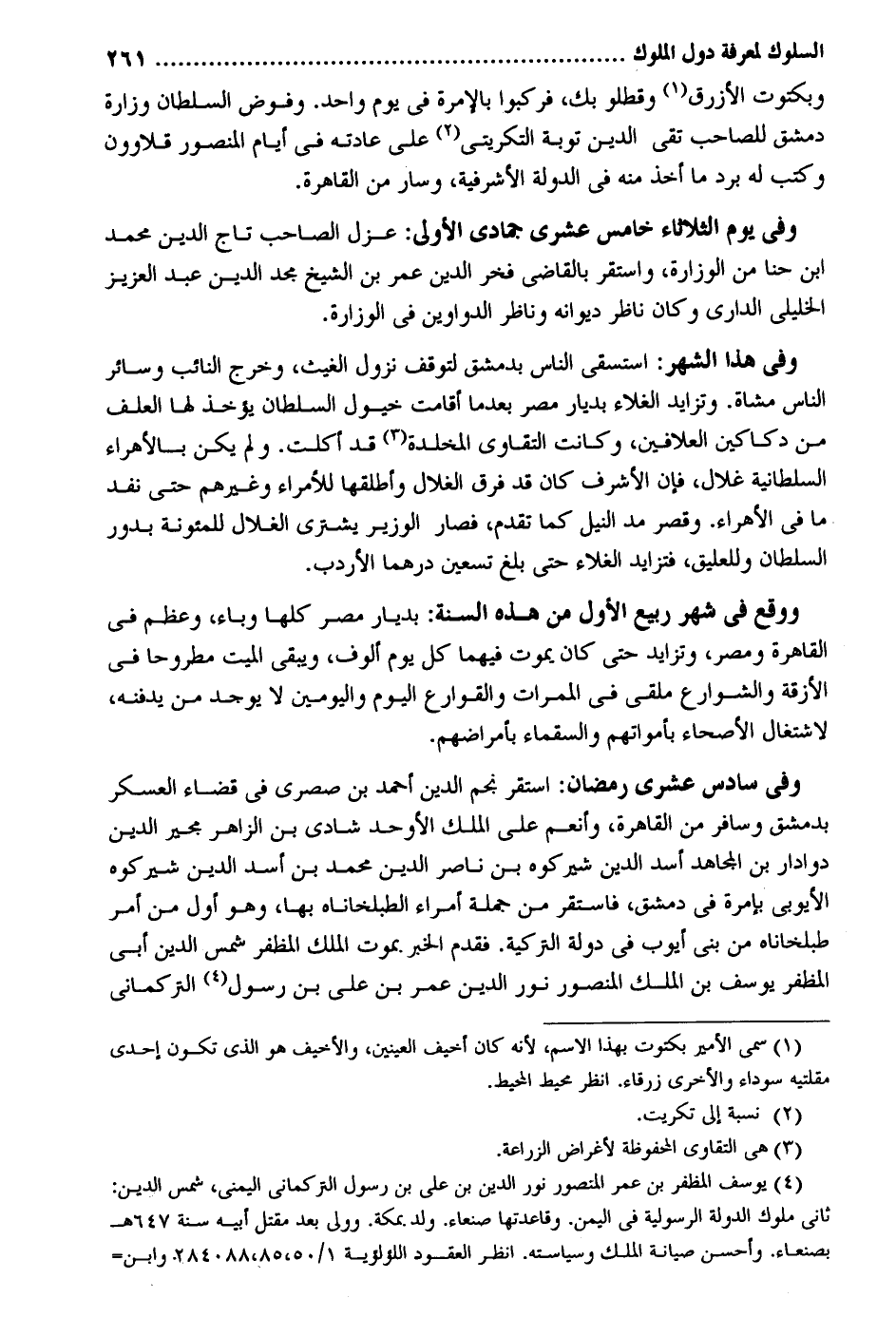 وبكتوت الْأَزْرَق وقطلو بك فَرَكبُوا بالإمرة فِي يَوْم وَاحِد. وفوض السُّلْطَان وزارة دمشق للصاحب تَقِيّ الدّين تَوْبَة التكريتي على عَادَته فِي أَيَّام الْمَنْصُور قلاوون وَكتب لَهُ برد مَا أَخذ مِنْهُ فِي الدولة الأشرفية وَسَار من الْقَاهِرَة. وَفِي يرم الثُّلَاثَاء خَامِس عشري جُمَادَى الأولى: عزل الصاحب تَاج الدّين مُحَمَّد ابْن حنا من الوزارة وَاسْتقر بِالْقَاضِي فَخر الدّين عمر بن الشَّيْخ مجد الدّين عبد الْعَزِيز الخليلي الدَّارِيّ وَكَانَ نَاظر ديوانه وناظر الدَّوَاوِين فِي الوزارة. وَفِي هَذَا الشَّهْر: استسقى النَّاس بِدِمَشْق لتوقف نزُول الْغَيْث وَخرج النَّائِب وَسَائِر النَّاس مشَاة. وتزايد الغلاء بديار مصر بَعْدَمَا أَقَامَت خُيُول السُّلْطَان يُؤْخَذ لَهَا الْعلف من دكاكين العلافين وَكَانَت التقاوي المخلدة قد أكلت. وَلم يكن بالأهراء السُّلْطَانِيَّة غلال فَإِن الْأَشْرَف كَانَ قد فرق الغلال وأطلقها لِلْأُمَرَاءِ وَغَيرهم حَتَّى نفد مَا فِي الأهراء. وَقصر مد النّيل كَمَا تقدم فَصَارَ الْوَزير يَشْتَرِي الغلال للمئونة بدور السُّلْطَان وللعليق فتزايد الغلاء حَتَّى بلغ تسعين درهما الأردب. وَوَقع فِي شهر ربيع الأول من هَذِه السّنة: بديار مصر كلهَا وباء وَعظم فِي الْقَاهِرَة ومصر وتزايد حَتَّى كَانَ يَمُوت فيهمَا كل يَوْم أُلُوف ويبقي الْمَيِّت مطروحا فِي الْأَزِقَّة والشوارع ملقى فِي الممرات والقوارع الْيَوْم واليومين لَا يُوجد من يدفنه لاشتغال الأصحاء بأمواتهم والسقماء بأمراضهم. وَفِي سادس عشري رَمَضَان: اسْتَقر نجم الدّين أَحْمد بن صصرى فِي قَضَاء الْعَسْكَر بِدِمَشْق وسافر من الْقَاهِرَة وأنعم على الْملك الأوحد شادي بن الزَّاهِر مجير الدّين دوادار بن الْمُجَاهِد أَسد الدّين شيركوه بن نَاصِر الدّين مُحَمَّد بن أَسد الدّين شيركوه الأيوبي بإمرة فِي دمشق فاستقر من جملَة أُمَرَاء الطبلخاناه بهَا وَهُوَ أول من أَمر طبلخاناه من بني أَيُّوب فِي دولة التركية. فَقدم الْخَبَر بِمَوْت الْملك المظفر شمس الدّين أبي المظفر يُوسُف بن الْملك الْمَنْصُور نور الدّين عمر بن عَليّ بن رَسُول التركماني