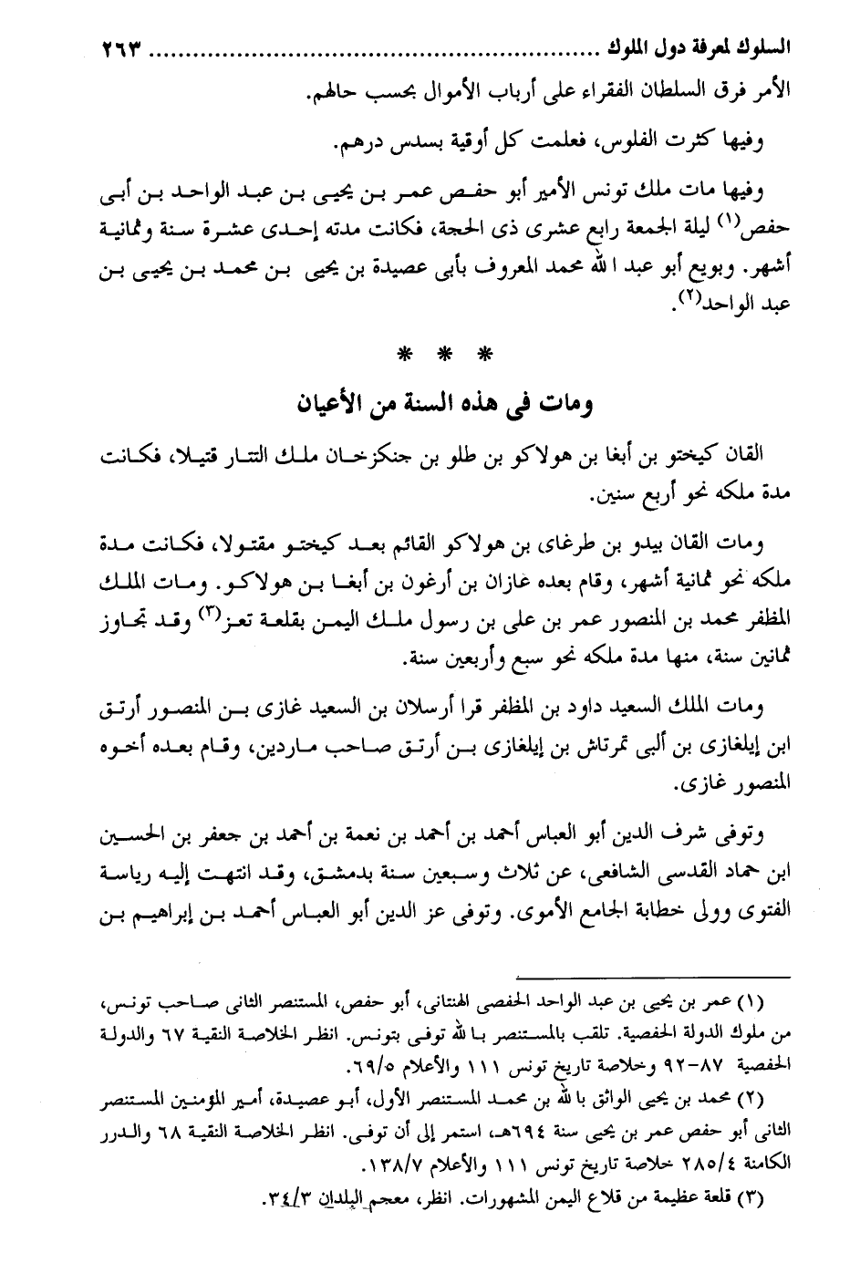 الْأَمر فرق السُّلْطَان الْفُقَرَاء على أَرْبَاب الْأَمْوَال بِحَسب حَالهم. وفيهَا مَاتَ ملك تونس الْأَمِير أَبُو حَفْص عمر بن يحيى بن عبد الْوَاحِد لَهُنَّ أبي حَفْص لَيْلَة الْجُمُعَة رَابِع عشري ذِي الْحجَّة فَكَانَت مدَّته إِحْدَى عشرَة سنة وَثَمَانِية أشهر. وبويع أَبُو عبد الله مُحَمَّد الْمَعْرُوف بِأبي عصيدة بن يحيى بن مُحَمَّد بن يحيى بن عبد الْوَاحِد. وَمَات فِي هَذِه السّنة من الْأَعْيَان القان كيختو بن أبغا بن هولاكو بن طلو بن جنكزخان ملك التتار قَتِيلا فَكَانَت مُدَّة ملكه نَحْو أَربع سِنِين. وَمَات القان بيدو بن طرغاي بن هولاكو الْقَائِم بعد كيختو مقتولا فَكَانَت مُدَّة ملكه نَحْو ثَمَانِيَة أشهر وَقَامَ بعده عازان بن أرغون بن أبغا بن هولاكو. وَمَات الْملك المظفر مُحَمَّد بن الْمَنْصُور عمر بن عَليّ بن رَسُول ملك الْيمن بقلعة تعز وَقد تجَاوز ثَمَانِينَ سنة مِنْهَا مُدَّة ملكه نَحْو سبع وَأَرْبَعين سنة. وَمَات الْملك السعيد دَاوُد بن المظفر قرا أرسلان بن السعيد غَازِي بن الْمَنْصُور أرتق ابْن إيلغازي بن ألبى تمرتاش بن إيلغازي بن أرتق صَاحب ماردين وَقَامَ بعده أَخُوهُ الْمَنْصُور غَازِي. وَتُوفِّي شرف الدّين أَبُو الْعَبَّاس أَحْمد بن أَحْمد بن نعدة بن أَحْمد بن جَعْفَر بن الْحُسَيْن ابْن حَمَّاد الْقُدسِي الشَّافِعِي عَن ثَلَاث وَسبعين سنة بِدِمَشْق وَقد انْتَهَت إِلَيْهِ رياسة الفتوي وَولي خطابة الْجَامِع الْأمَوِي. وَتُوفِّي عز الدّين أَبُو الْعَبَّاس أَحْمد بن إِبْرَاهِيم بن
