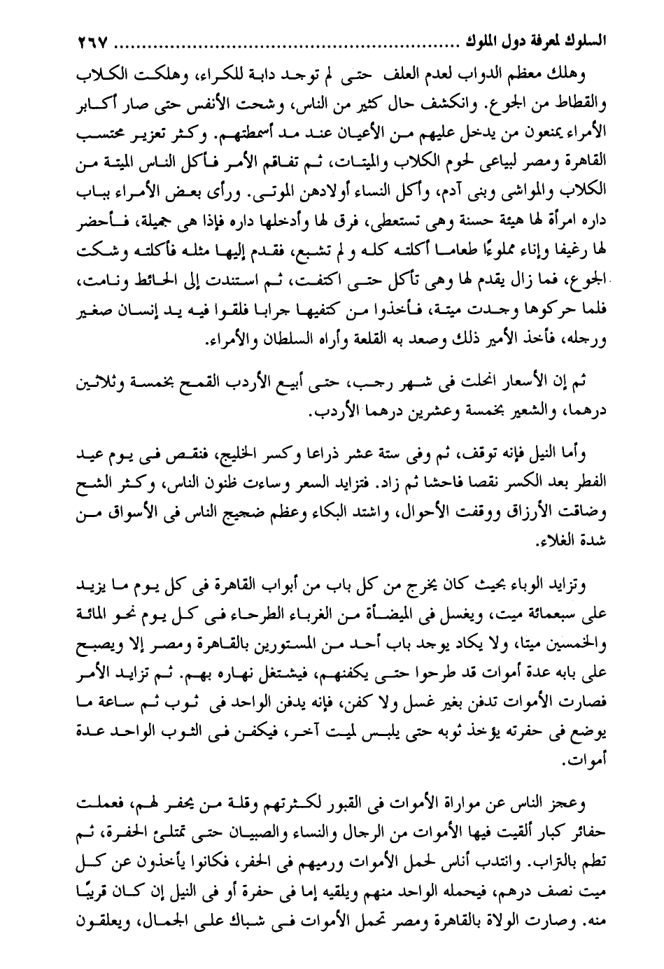 وَهلك مُعظم الدَّوَابّ لعدم الْعلف حَتَّى لم تُوجد دَابَّة للكراء وَهَلَكت الْكلاب والقطاط من الْجُوع. وانكشف حَال كثير من النَّاس وشحت الأنفسي حَتَّى صَار أكَابِر الْأُمَرَاء يمْنَعُونَ من يدْخل عَلَيْهِم من الْأَعْيَان عِنْد مد أسمطتهم. وَكثر تَعْزِير محتسب الْقَاهِرَة ومصر لبياعي لُحُوم الْكلاب وَالْمَيتَات ثمَّ تفاقم الْأَمر فَأكل النَّاس الْميتَة من الْكلاب والمواشي وَبني آدم وَأكل النِّسَاء أَوْلَادهنَّ الْمَوْتَى. ورأي بعض الْأُمَرَاء بِبَاب دَاره امْرَأَة لَهَا هَيْئَة حَسَنَة وَهِي تستعطي فرق لَهَا وأدخلها دَاره فَإِذا هِيَ جميلَة فأحضر لَهَا رغيفا وإناء مملوءاً طَعَاما أَكلته كُله وَلم تشبع فَقدم إِلَهًا مثله فأكلته وَشَكتْ الْجُوع فَمَا زَالَ يقدم لَهَا وَهِي تَأْكُل حَتَّى اكتفت ثمَّ استندت إِلَى الْحَائِط ونامت فَلَمَّا حركوها وجدت ميتَة فاخذوا من كتفيها جرابا فلفوا فِيهِ يَد إِنْسَان صَغِير وَرجله فَأخذ الْأَمِير ذَلِك وَصعد بِهِ القلعة وَأرَاهُ السُّلْطَان والأمراء. ثمَّ إِن الأسعار انْحَلَّت فِي شهر رَجَب حَتَّى أبيع الأردب الْقَمْح بِخَمْسَة وَثَلَاثِينَ درهما وَالشعِير بِخَمْسَة وَعشْرين درهما الأردب. وَأما النّيل فَإِنَّهُ توقف ثمَّ وَفِي سِتَّة عشر ذِرَاعا وَكسر الخليج فنقص فِي يَوْم عيد الْفطر بعد الْكسر نقصا فَاحِشا ثمَّ زَاد. فتزايد السّعر وَسَاءَتْ ظنون النَّاس وَكثر الشُّح وَضَاقَتْ الأرزاق ووقفت الْأَحْوَال وَاشْتَدَّ الْبكاء وَعظم ضجيج النَّاس فِي الْأَسْوَاق من شدَّة الغلاء. وتزايد الوباء بِحَيْثُ كَانَ يخرج من كل بَاب من أَبْوَاب الْقَاهِرَة فِي كل يَوْم مَا يزِيد على سَبْعمِائة ميت وَيغسل فِي الميضأة من الغرباء الطرحاء فِي كل يَوْم نَحْو الْمِائَة وَالْخمسين مَيتا وَلَا يكَاد يُوجد بَاب أحد من المستورين بِالْقَاهِرَةِ ومصر إِلَّا وَيُصْبِح على بَابه عدَّة أموات قد طرحوا حَتَّى يكفنهم فيشتغل نَهَاره. ثمَّ تزايد الْأَمر فَصَارَت الْأَمْوَات تدفن بِغَيْر غسل وَلَا كفن فَإِنَّهُ يدْفن الْوَاحِد فِي ثوب ثمَّ سَاعَة مَا يوضع فِي حفرته يُؤْخَذ ثَوْبه حَتَّى يلبس لمَيت آخر فيكفن فِي الثَّوْب الْوَاحِد عدَّة أموات. وَعجز النَّاس عَن مواراة الْأَمْوَات فِي الْقُبُور لكثرتهم وَقلة من يحْفر لَهُم فَعمِلت حفائر كبار ألقيت فِيهَا الْأَمْوَات من الرِّجَال وَالنِّسَاء وَالصبيان حَتَّى تمتلئ الحفرة ثمَّ تطم بِالتُّرَابِ. وانتدب أنَاس لحمل الْأَمْوَات ورميهم فِي الْحفر فَكَانُوا يَأْخُذُونَ عَن كل ميت نصف دِرْهَم فيحمله الْوَاحِد مِنْهُم وَيُلْقِيه إِمَّا فِي حُفْرَة أَو فِي النّيل إِن كَانَ قَرِيبا مِنْهُ. وَصَارَت الْوُلَاة بِالْقَاهِرَةِ ومصر تحمل الْأَمْوَات فِي شباك على الْجمال ويعلقون