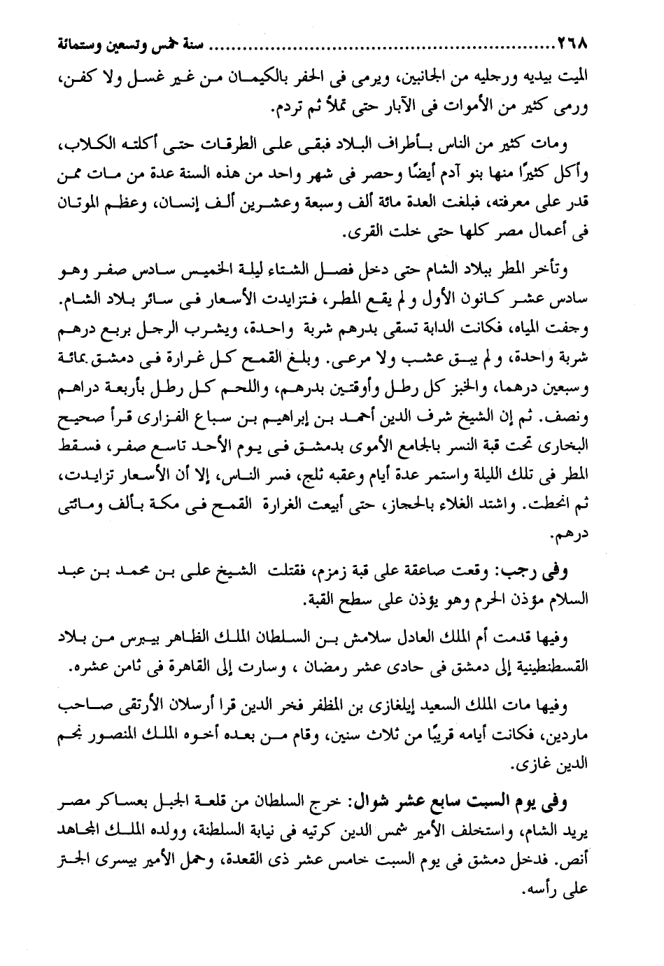 الْمَيِّت بيدَيْهِ ورحليه من الْجَانِبَيْنِ وَيَرْمِي فِي الْحفر بالكيمان من غير غسل وَلَا كفن وَرمي كثير من الْأَمْوَات فِي الْآبَار حَتَّى تملأ ثمَّ تردم. وَمَات كثير من النَّاس بأطراف الْبِلَاد فَبَقيَ على الطرقات حَتَّى أَكلته الْكلاب وَأكل كثيرا مِنْهَا بَنو آدم أَيْضا وَحصر فِي شهر وَاحِد من هَذِه السّنة عدَّة من مَاتَ مِمَّن قدر على مَعْرفَته فبلغت الْعدة مائَة ألف وَسَبْعَة وَعشْرين ألف إِنْسَان وَعظم الموتان فِي أَعمال مصر كلهَا حَتَّى خلت الْقرى. وَتَأَخر الْمَطَر بِبِلَاد الشَّام حَتَّى دخل فصل الشتَاء لَيْلَة الْخَمِيس سادس صفر وَهُوَ سادس عشر كانون الأول وَلم يَقع الْمَطَر فتزايدت الأسعار فِي سَائِر بِلَاد الشَّام. وجفت الْمِيَاه فَكَانَت الدَّابَّة تَسْقِي بدرهم شربة وَاحِدَة وَيشْرب الرجل بِربع دِرْهَم شربة وَاحِدَة وَلم يبْق عشب وَلَا مرعي. وَبلغ الْقَمْح كل غرارة فِي دمشق بِمِائَة وَسبعين درهما وَالْخبْز كل رَطْل وأوقتين بدرهم وَاللَّحم كل رَطْل بأَرْبعَة دَرَاهِم وَنصف ثمَّ إِن الشَّيْخ شرف الدّين أَحْمد بن إِبْرَاهِيم بن سِبَاع الْفَزارِيّ قَرَأَ صَحِيح البُخَارِيّ تَحت قبَّة النسْر بالجامع الْأمَوِي بِدِمَشْق فِي يَوْم الْأَحَد تَاسِع صفر فَسقط الْمَطَر فِي تِلْكَ اللَّيْلَة وَاسْتمرّ عدَّة أَيَّام وعقبه ثلج فسر النَّاس إِلَّا أَن الأسعار تزايدت ثمَّ انحطت وَاشْتَدَّ الغلاء بالحجاز حَتَّى أبيعت الغرارة الْقَمْح فِي مَكَّة بِأَلف ومائتي دِرْهَم. وَفِي رَجَب: وَقعت صَاعِقَة على قبَّة زَمْزَم فقتلت الشَّيْخ عَليّ بن مُحَمَّد بن عبد السَّلَام مُؤذن الْحرم وَهُوَ يُؤذن على سطح الْقبَّة. وفيهَا قدمت أم الْملك الْعَادِل سلامش بن السُّلْطَان الْملك الظَّاهِر بيبرس من بِلَاد الْقُسْطَنْطِينِيَّة إِلَى دمشق فِي حادي عشر رَمَضَان وسارت إِلَى الْقَاهِرَة فِي ثامن عشره. وفيهَا مَاتَ الْملك السعيد إيلغازي بن المظفر فَخر الدّين قرا أرسلان الأرتقي صَاحب ماردين فَكَانَت أَيَّامه قَرِيبا من ثَلَاث سِنِين وَقَامَ من بعده أَخُوهُ الْملك الْمَنْصُور نجم الدّين عازي. وَفِي يَوْم السبت سَابِع عشر شَوَّال: خرج السُّلْطَان من قلعة الْجَبَل بعساكر مصر يُرِيد الشَّام واستخلف الْأَمِير شمس الدّين كرتيه فِي نِيَابَة السلطنة وَولده الْملك الْمُجَاهِد أنص. فَدخل دمشق فِي يَوْم السبت خَامِس عشر ذِي الْقعدَة، وَحمل الْأَمِير بيسرى الجتر على رَأسه.