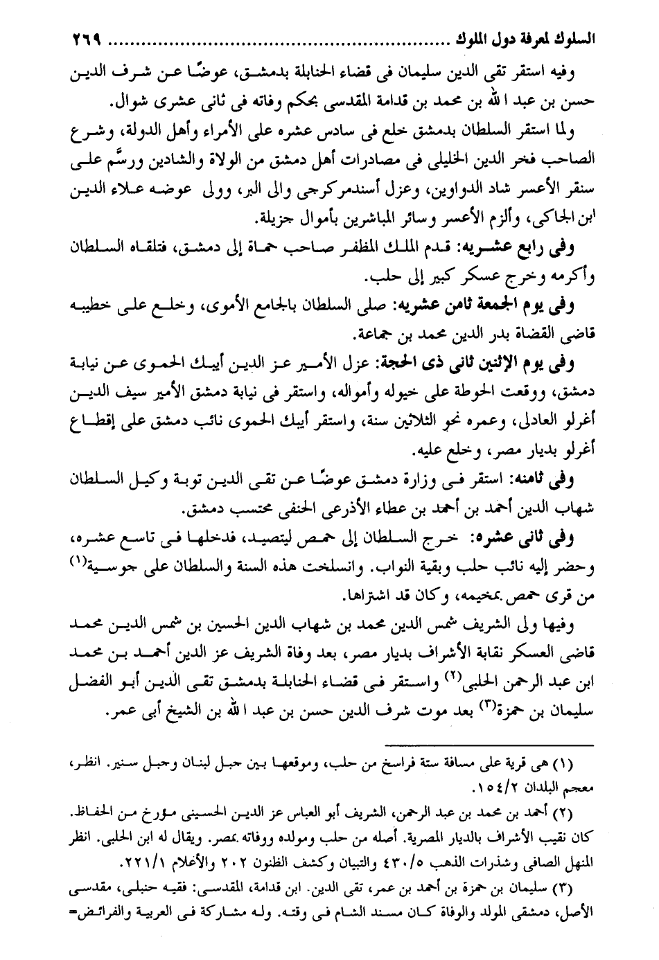 وَفِيه اسْتَقر تَقِيّ الدّين سُلَيْمَان فِي قَضَاء الْحَنَابِلَة بِدِمَشْق عوضا عَن شرف الدّين حسن بن عبد الله بن مُحَمَّد بن قدامَة الْمَقْدِسِي بِحكم وَفَاته فِي ثَانِي عشري شَوَّال. وَلما اسْتَقر السُّلْطَان بِدِمَشْق خلع فِي سادس عشره على الْأُمَرَاء وَأهل الدولة وَشرع الصاحب فَخر الدّين الخليلي فِي مصادرات أهل دمشق من الْوُلَاة والشادين ورسم على سنقر الأعسر شاد الدَّوَاوِين وعزل أسندمر كرجي وَإِلَى الْبر وَولي عوضه عَلَاء الدّين ابْن الجاكي وألزم الأعسر وَسَائِر المباشرين بأموال جزيلة. وَفِي رَابِع عشريه: قدم الْملك المظفر صَاحب حماة إِلَى دمشق فَتَلقاهُ السُّلْطَان وأكرمه وَخرج عَسْكَر كَبِير إِلَى حلب. وَفِي يَوْم الْجُمُعَة ثامن عشريه: صلى السُّلْطَان بالجامع الْأمَوِي وخلع على خَطِيبه قَاضِي الْقُضَاة بدر الدّين مُحَمَّد بن جمَاعَة. وَفِي يَوْم الْإِثْنَيْنِ ثَانِي ذِي الْحجَّة: عزل الْأَمِير عز الدّين أيبك الْحَمَوِيّ عَن نِيَابَة دمشق وَوَقعت الحوطة على خيوله وأمواله وَاسْتقر فِي نِيَابَة دمشق الْأَمِير سيف الدّين أغرلو العادلي وعمره نَحْو الثَّلَاثِينَ سنة وَاسْتقر أيبك الْحَمَوِيّ نَائِب دمشق على إقطاع أغرلو بديار مصر وخلع عَلَيْهِ وَفِي ثامنه: اسْتَقر فِي وزارة دمشق عوضا عَن تَقِيّ الدّين تَوْبَة وَكيل السُّلْطَان شهَاب الدّين وَفِي ثَانِي عشره: خرج السُّلْطَان إِلَى حمص ليتصيد فَدَخلَهَا فِي تَاسِع عشره وَحضر إِلَيْهِ نَائِب حلب وَبَقِيَّة النواب. وانسلخت هَذِه السّنة وَالسُّلْطَان على جوسية من قرى حمص بمخيمه وَكَانَ قد اشْتَرَاهَا. وفيهَا ولي الشريف شمس الدّين مُحَمَّد بن شهَاب الدّين الْحُسَيْن بن شمس الدّين مُحَمَّد قَاضِي الْعَسْكَر نقابة الْأَشْرَاف بديار مصر بعد وَفَاة الشريف عز الدّين أَحْمد بن مُحَمَّد ابْن عبد الرَّحْمَن الْحلَبِي وَاسْتقر فِي قَضَاء الحنابله بِدِمَشْق تَقِيّ الدّين أَبُو الْفضل ابْن عبد الرَّحْمَن الْحلَبِي سُلَيْمَان بن حَمْزَة بعد موت شرف الدّين حسن بن عبد الله بن الشَّيْخ أبي عمر.
