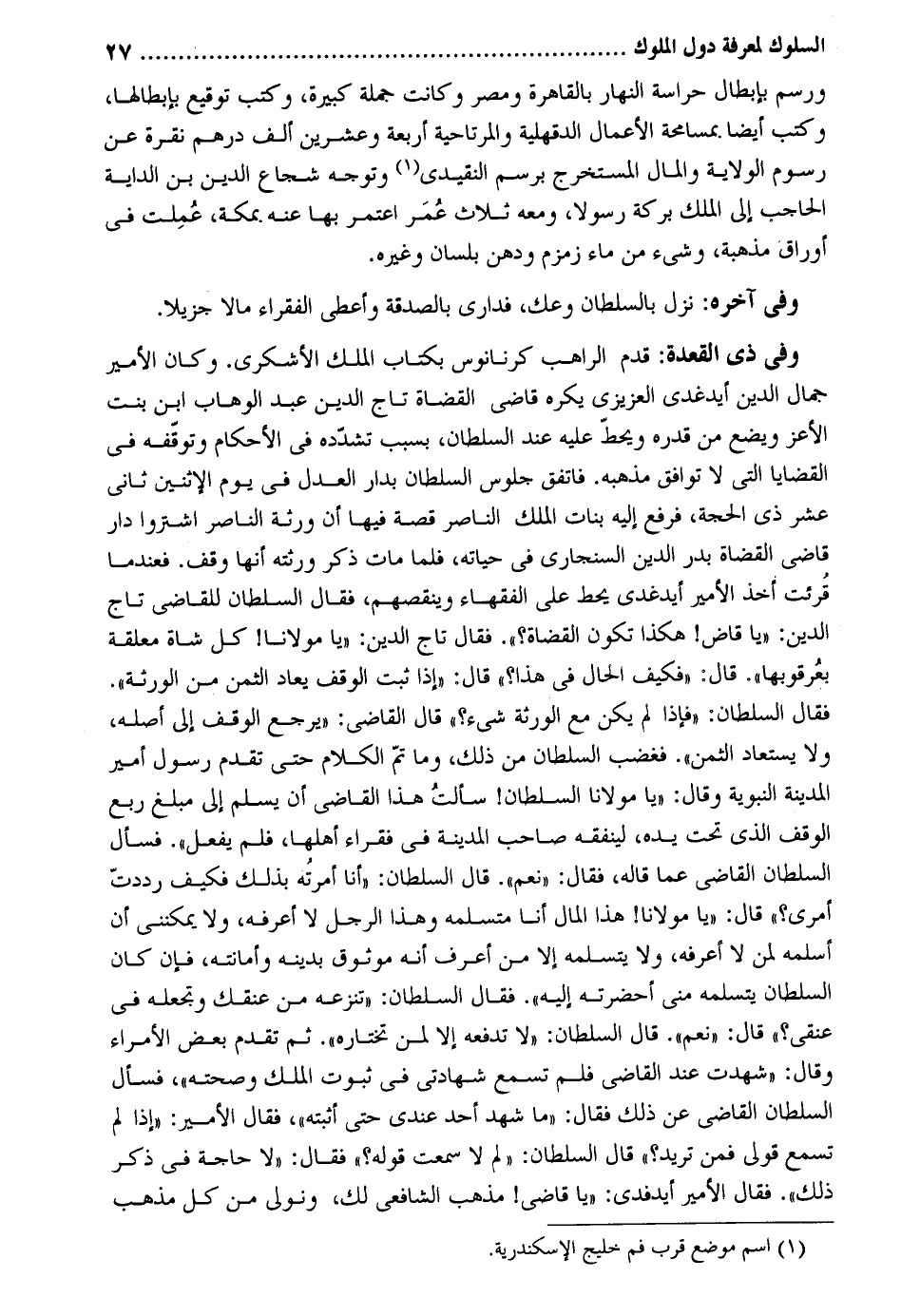 ورسم بِإِبْطَال حراسة النَّهَار بِالْقَاهِرَةِ ومصر وَكَانَت جملَة كَبِيرَة وَكتب توقيع بإبطالها وَكتب أَيْضا بمسامحة الْأَعْمَال الدقهلية والمرتاحية أَرْبَعَة وَعشْرين ألف دِرْهَم نقرة عَن رسوم الْولَايَة وَالْمَال الْمُسْتَخْرج برسم النقيدي وَتوجه شُجَاع الدّين بن الداية الْحَاجِب إِلَى الْملك بركَة رَسُولا وَمَعَهُ ثَلَاث عمر اعْتَمر بهَا عَنهُ بِمَكَّة عملت فِي أوراق مذهبَة وَشَيْء من مَاء زَمْزَم ودهن بِلِسَان وَغَيره. وَفِي آخِره: نزل بالسلطان وعك فدارى بِالصَّدَقَةِ وَأعْطى الْفُقَرَاء مَالا جزيلا. وَفِي ذِي الْقعدَة: قدم الراهب كرنانوس بِكِتَاب الْملك الأشكري. وَكَانَ الْأَمِير جمال الدّين أيدفدي العزيزي يكره قَاضِي الْقُضَاة تَاج الدّين عبد الْوَهَّاب ابْن بنت الْأَعَز وَيَضَع من قدره ويحط عَلَيْهِ عِنْد السُّلْطَان بِسَبَب تشدده فِي الْأَحْكَام وتوقفه فِي القضايا الَّتِي لَا توَافق مذْهبه. فاتفق جُلُوس السُّلْطَان بدار الْعدْل فِي يَوْم الْإِثْنَيْنِ ثَانِي عشر ذِي الْحجَّة فَرفع إِلَيْهِ بَنَات الْملك النَّاصِر قصَّة فِيهَا أَن وَرَثَة النَّاصِر اشْتَروا دَار قَاضِي الْقُضَاة بدر الدّين السنجاري فِي حَيَاته فَلَمَّا مَاتَ ذكر ورثته إِنَّهَا وقف. فعندما قُرِئت أَخذ الْأَمِير أيدغدي يحط على الْفُقَهَاء وينقصهم فَقَالَ السُّلْطَان للْقَاضِي تَاج الدّين: يَا قَاض {هَكَذَا تكون الْقُضَاة. فَقَالَ تَاج الدّين: يَا مَوْلَانَا} كل شَاة معلقَة بعرقوبها! قَالَ فَكيف الْحَال فِي هَذَا قَالَ إِذا ثَبت الْوَقْف يُعَاد الثّمن من الْوَرَثَة فَقَالَ السُّلْطَان. فَإِذا لم يكن مَعَ الْوَرَثَة شَيْء قَالَ القَاضِي: يرجع الْوَقْف إِلَى أَصله وَلَا يستعاد الثّمن. فَغَضب السُّلْطَان من ذَلِك وَمَا تمّ الْكَلَام حَتَّى تقدم رَسُول أَمِير الْمَدِينَة النَّبَوِيَّة وَقَالَ: يَا مَوْلَانَا السُّلْطَان سَأَلت هَذَا القَاضِي أَن يسلم إِلَى مبلغ ربع الْوَقْف الَّذِي تَحت يَده لينفقه صَاحب الْمَدِينَة فِي فُقَرَاء أَهلهَا فَلم يفعل. فَسَأَلَ السُّلْطَان القَاضِي عَمَّا قَالَه فَقَالَ: نعم. قَالَ السُّلْطَان: أَنا أَمرته بذلك فَكيف رددت أَمْرِي قَالَ: يَا مَوْلَانَا هَذَا المَال أَنا متسلمه وَهَذَا الرجل لَا أعرفهُ وَلَا يمكنني أَن أسلمه لمن لَا أعرفهُ وَلَا يتسلمه إِلَّا من أعرف إِنَّه موثوق بِدِينِهِ وأمانته فَإِن كَانَ السُّلْطَان يتسلمه مني أحضرته إِلَيْهِ. فَقَالَ السُّلْطَان: تنزعه من عُنُقك وتجعله فِي عنقِي قَالَ: نعم. قَالَ السُّلْطَان: لَا تَدْفَعهُ إِلَّا لمن تختاره. ثمَّ تقدم بعض الْأُمَرَاء وَقَالَ: شهِدت عِنْد القَاضِي فَلم تسمع شهادتي فِي ثُبُوت الْملك وَصِحَّته فَسَأَلَ السُّلْطَان القَاضِي عَن ذَلِك فَقَالَ: مَا شهد أحد عِنْدِي حَتَّى أثْبته فَقَالَ الْأَمِير: إِذا لم تسمع قولي فَمن تُرِيدُ قَالَ السُّلْطَان: لم لَا سَمِعت قَوْله فَقَالَ: لَا حَاجَة فِي ذكر ذَلِك. فَقَالَ الْأَمِير أيدغدي: يَا قَاضِي مَذْهَب الشَّافِعِي لَك ونولي من كل مَذْهَب