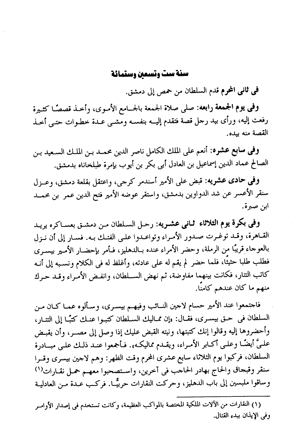 سنة سِتّ وَتِسْعين وسِتمِائَة فِي ثَانِي الْمحرم قدم السُّلْطَان من حمص إِلَى دمشق. وَفِي يَوْم الْجُمُعَة رابعه: صلى صَلَاة الْجُمُعَة بالجامع الْأمَوِي وَأخذ قصصاً كَثِيرَة رفعت إِلَيْهِ ورأي بيد رجل قصَّة فَتقدم إِلَيْهِ بِنَفسِهِ ومشي عدَّة خطوَات حَتَّى أَخذ الْقِصَّة مِنْهُ بِيَدِهِ. وَفِي سَابِع عشره: أنعم على الْملك الْكَامِل نَاصِر الدّين مُحَمَّد بن الْملك السعيد بن الصَّالح عماد الدّين إِسْمَاعِيل بن الْعَادِل أبي بكر بن أَيُّوب بإمرة طبلخاناه بِدِمَشْق. وَفِي حادي عشريه: قبض على الْأَمِير أسندمر كرجي واعتقل بقلعة دمشق وعزل سنقر الأعسر عَن شدّ الدَّوَاوِين بِدِمَشْق وَاسْتقر عوضه الْأَمِير فتح الدّين عمر بن مُحَمَّد ابْن صبرَة. وَفِي بكرَة يَوْم الثُّلَاثَاء ثَانِي عشريه: رَحل السُّلْطَان من دمشق بعساكره يُرِيد الْقَاهِرَة وَقد توغرت صُدُور الْأُمَرَاء وتواعدوا على الفتك بِهِ. فَسَار إِلَى أَن نزل بالعوجاء قَرِيبا من الرملة وَحضر الْأُمَرَاء عِنْده بالدهليز فَأمر بإحضار الْأَمِير بيسري فَطلب طلبا حثيثاً فَلَمَّا حضر لم يقم لَهُ على عَادَته وَأَغْلظ لَهُ فِي الْكَلَام وَنسبه إِلَى أَنه كَاتب التتار فَكَانَت بَينهمَا مُفَاوَضَة ثمَّ نَهَضَ السُّلْطَان وانفض الْأُمَرَاء وَقد حرك مِنْهُم مَا كَانَ عِنْدهم كامناً. فَاجْتمعُوا عِنْد الْأَمِير حسام لاجين النَّائِب وَفِيهِمْ بيسري وسألوه عَمَّا كَانَ من السُّلْطَان فِي حق فَقَالَ: إِن مماليك السُّلْطَان كتبُوا عَنْك كتبا إِلَى التتار وأحضروها إِلَيْهِ وَقَالُوا إِنَّك كتبتها وَنِيَّته الْقَبْض عَلَيْك إِذا وصل إِلَى مصر وَأَن يقبض على أَيْضا وعَلى أكَابِر الْأُمَرَاء وَيقدم مماليكه. فَأَجْمعُوا عِنْد ذَلِك على مبادرة السُّلْطَان فَرَكبُوا يَوْم الثُّلَاثَاء سَابِع عشري الْمحرم وَقت الظّهْر: وهم لاجين بيسري وقرا سنقر وقبجاق والحاج بهادر الْحَاجِب فِي آخَرين واستصحبوا مَعَهم حمل نقارات وَسَاقُوا ملبسين إِلَى بَاب الدهليز وحركت النقارات حَرْبِيّا. فَركب عدَّة من العادلية