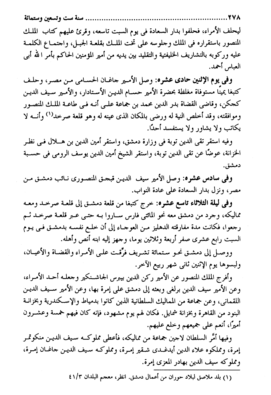 ليحلف الْأُمَرَاء فَحَلَفُوا بدار السَّعَادَة فِي يَوْم السبت تاسعه وَقُرِئَ عَلَيْهِم كتاب الْملك الْمَنْصُور باستقراره فِي الْملك وجلوسه على تخت الْملك بقلعة الْجَبَل واجتماع الْكَلِمَة عَلَيْهِ وركوبه بالتشاريف الخليفتية والتقليد بَين يَدَيْهِ من أَمِير الْمُؤمنِينَ الْحَاكِم بِأَمْر الله أبي الْعَبَّاس أَحْمد. وَفِي يَوْم الْإِثْنَيْنِ حادي عشره: وصل الْأَمِير جاغان الحسامي من مصر وَحلف كتبغا يَمِينا مستوفاة مُغَلّظَة بِحَضْرَة الْأَمِير حسام الدّين الأستادار والأمير سيف الدّين كجكن وقاضي الْقُضَاة بدر الدّين مُحَمَّد بن جمَاعَة على أَنه فِي طَاعَة الْملك الْمَنْصُور وموافقته وَقد أخْلص النِّيَّة لَهُ وَرَضي بِالْمَكَانِ الَّذِي عينه لَهُ وَهُوَ قلعة صرخد وَأَنه لَا يُكَاتب وَلَا يشاور وَلَا يستفسد أحدا. وَفِيه اسْتَقر تَقِيّ الدّين تَوْبَة فِي وزارة دمشق وَاسْتقر أَمِين الدّين بن هِلَال فِي نظر الخزانة عوضا عَن تَقِيّ الدّين توبه وَاسْتقر الشَّيْخ أَمِين الدّين يُوسُف الرُّومِي فِي حسبَة دمشق. وَفِي سادس عشره: وصل الْأَمِير سيف الدّين قبجق المنصوري نَائِب دمشق من مصر وَنزل بدار السَّعَادَة على عَادَة النواب. وَفِي لَيْلَة الثُّلَاثَاء تَاسِع عشره: خرج كتبغا من قلعة دمشق إِلَى قلعة صرخد وَمَعَهُ مماليكه وجرد من دمشق مَعَه نَحْو المائتي فَارس سَارُوا بِهِ حَتَّى عبر قلعة صرخد ثمَّ رجعُوا فَكَانَت مُدَّة مُفَارقَته الدهليز من العرجاء إِلَى أَن خلع نَفسه بِدِمَشْق فِي يَوْم السبت رَابِع عشري صفر أَرْبَعَة وَثَلَاثِينَ يَوْمًا وجهز إِلَيْهِ ابْنه أنص وَأَهله. وَوصل إِلَى دمشق نَحْو سِتّمائَة تشريف فرقت على الْأُمَرَاء والقضاة والأعيان ولبسوها يَوْم الْإِثْنَيْنِ ثَانِي شهر ربيع الآخر. وَأَفْرج الْملك الْمَنْصُور عَن الْأَمِير ركن الدّين بيبرس الجاشنكير وَجعله أحد الْأُمَرَاء وَعَن الْأَمِير سيف الدّين برلغي وَبَعثه إِلَى دمشق على إمرة بهَا وَعَن الْأَمِير سيف الدّين اللقماني وَعَن جمَاعَة من المماليك السُّلْطَانِيَّة الَّذين كَانُوا بدمياط والإسكندرية وبخزانة البنود من الْقَاهِرَة وبخزانة شمايل. فَكَانَ لَهُم يَوْم مشهود فَإِنَّهُ كَانَ فيهم خَمْسَة وَعِشْرُونَ أَمِيرا أنعم على جَمِيعهم وخلع عَلَيْهِم. وفيهَا أَمر السُّلْطَان لاجين جمَاعَة من مماليكه فَأعْطى مَمْلُوكه سيف الدّين منكوتمر إمرة ومملكوه عَلَاء الدّين أيدغدي شقير إمرة ومملوكه سيف الدّين جاغان إمرة ومملوكه سيف بهادر المعزي إمرة.