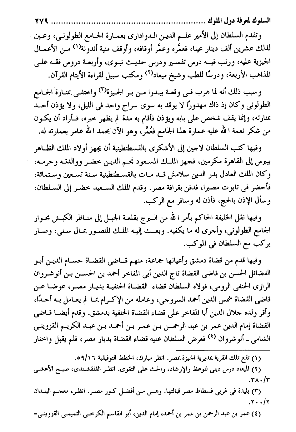 وَتقدم السُّلْطَان إِلَى الْأَمِير علم الدّين الدواداري بعمارة الْجَامِع الطولوني وَعين لذَلِك عشْرين ألف دِينَار عينا فعمره وَعمر أوقافه وأوقف منية أندونة من الْأَعْمَال الجيزية عَلَيْهِ ورتب فِيهِ درس تَفْسِير ودرس حَدِيث نبوي وَأَرْبَعَة دروس فقه على الْمذَاهب الْأَرْبَعَة ودرساً للطب وَشَيخ ميعاد ومكتب سَبِيل لقِرَاءَة الْأَيْتَام الْقُرْآن. وَسبب ذَلِك إِنَّه لما هرب فِي وقْعَة بيدرا من بر الجيزة واختفى بمنارة الْجَامِع الطولوني وَكَانَ إِذْ ذَاك مهدوراً لَا يُوقد بِهِ سوى سراج وَاحِد فِي اللَّيْل وَلَا يُؤذن أحد بمنارته وَإِنَّمَا يقف شخص على بَابه وَيُؤذن فَأَقَامَ بِهِ مُدَّة لم يظْهر خَبره فَأَرَادَ أَن يكون من شكر نعْمَة الله عَلَيْهِ عمَارَة هَذَا الْجَامِع فعمر وَهُوَ الْآن بِحَمْد الله عَامر بعمارته لَهُ. وفيهَا كتب السُّلْطَان لاجين إِلَى الأشكري بالقسطنطنية أَن يُجهز أَوْلَاد الْملك الظَّاهِر بيبرس إِلَى الْقَاهِرَة مكرمين فَجهز الْملك المسعود نجم الدّين خضر ووالدته وَحرمه وَكَانَ الْملك الْعَادِل بدر الدّين سلامش قد مَاتَ بالقسطنطنية سنة تسعين وسِتمِائَة فأحضر فِي تَابُوت مصبرا فَدفن بقرافة مصر. وَقدم الْملك السعيد خضر إِلَى السُّلْطَان وَسَأَلَ الْإِذْن بِالْحَجِّ فَأذن لَهُ وسافر مَعَ الركب. وفيهَا نقل الْخَلِيفَة الْحَاكِم بِأَمْر الله من البرج بقلعة الْجَبَل إِلَى مناظر الْكَبْش بجوار الْجَامِع الطولوني وأجرى لَهُ مَا يَكْفِيهِ. وَبعث إِلَيْهِ الْملك الْمَنْصُور بِمَال سني وَصَارَ يركب مَعَ السُّلْطَان فِي الموكب. وفيهَا قدم من قُضَاة دمشق وأعيانها جمَاعَة مِنْهُم قَاضِي الْقُضَاة حسام الدّين أَبُو الْفَضَائِل الْحسن بن قَاضِي الْقُضَاة تَاج الدّين أبي المفاخر أَحْمد بن الْحسن بن أنوشروان الرَّازِيّ الْحَنَفِيّ الرُّومِي فولاه السُّلْطَان قَضَاء الْقُضَاة الْحَنَفِيَّة بديار مصر عوضا عَن قَاضِي الْقُضَاة شمس الدّين أَحْمد السرُوجِي وعامله من الْإِكْرَام. مِمَّا لم يُعَامل بِهِ أحدا وَأقر وَلَده جلال الدّين أَبَا المفاخر على قَضَاء الْقُضَاة الْحَنَفِيَّة بِدِمَشْق. وَقدم أَيْضا قَاضِي الْقُضَاة إِمَام الدّين عمر بن عبد الرَّحْمَن بن عمر بن أَحْمد بن عبد الْكَرِيم الْقزْوِينِي الشَّامي - أنوشروان فَعرض السُّلْطَان عَلَيْهِ قَضَاء الْقُضَاة بديار مصر فَلم يقبل وَاخْتَارَ