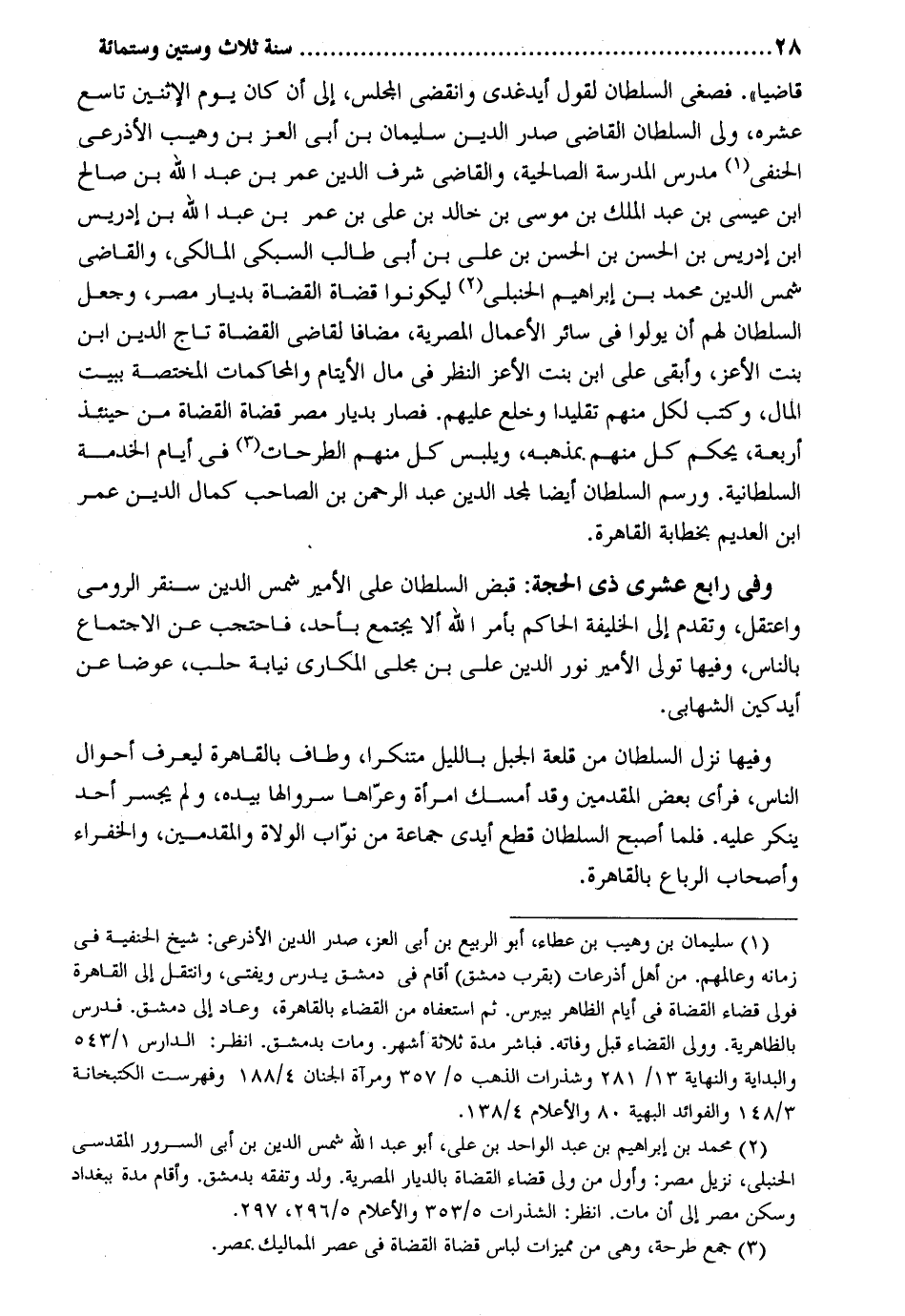 قَاضِيا. فصغي السُّلْطَان لقَوْل أيدغدي وانقضى الْمجْلس إِلَى أَن كَانَ يَوْم الْإِثْنَيْنِ تَاسِع عشره ولي السُّلْطَان القَاضِي صدر الدّين سُلَيْمَان بن أبي الْعِزّ بن وهيب الْأَذْرَعِيّ الْحَنَفِيّ مدرس الْمدرسَة الصالحية وَالْقَاضِي شرف الدّين عمر بن عبد الله بن صَالح ابْن عيسي بن عبد الْملك بن مُوسَى بن خَالِد بن على بن عمر بن عبد الله بن إِدْرِيس ابْن إِدْرِيس بن الْحسن بن الْحسن بن على بن أبي طَالب السُّبْكِيّ الْمَالِكِي وَالْقَاضِي شمس الدّين مُحَمَّد بن إِبْرَاهِيم الْحَنْبَلِيّ ليكونوا قُضَاة الْقُضَاة بديار مصر وَجعل السُّلْطَان لَهُم أَن يولوا فِي سَائِر الْأَعْمَال المصرية مُضَافا لقَاضِي الْقُضَاة تَاج الدّين ابْن بنت الْأَعَز وَأبقى على ابْن بنت الْأَعَز النّظر فِي مَال الْأَيْتَام والمحاكمات المختصة بِبَيْت المَال وَكتب لكل مِنْهُم تقليدا وخلع عَلَيْهِم. فَصَارَ بديار مصر قُضَاة الْقُضَاة من حِينَئِذٍ أَرْبَعَة يحكم كل مِنْهُم بمذهبه ويلبس كل مِنْهُم الطرحات فِي أَيَّام الْخدمَة السُّلْطَانِيَّة. ورسم السُّلْطَان أَيْضا لمجد الدّين عبد الرَّحْمَن بن الصاحب كَمَال الدّين عمر ابْن العديم بخطابة الْقَاهِرَة. وَفِي رَابِع عشري ذِي الْحجَّة: قبض السُّلْطَان على الْأَمِير شمس الدّين سنقر الرُّومِي واعتقل وَتقدم إِلَى الْخَلِيفَة الْحَاكِم بِأَمْر الله أَلا يجْتَمع بِأحد فاحتجب عَن الِاجْتِمَاع بِالنَّاسِ وفيهَا تولي الْأَمِير نور الدّين على بن مجلي المكاري نِيَابَة حلب عوضا عَن أيدكين الشهابي. وفيهَا نزل السُّلْطَان من قلعة الْجَبَل بِاللَّيْلِ متنكرا وَطَاف بِالْقَاهِرَةِ ليعرف أَحْوَال النَّاس فَرَأى بعض المقدمين وَقد أمسك امْرَأَة وعراها سروالها بِيَدِهِ وَلم يَجْسُر أحد يُنكر عَلَيْهِ. فَلَمَّا أصبح السُّلْطَان قطع أَيدي جمَاعَة من نواب الْوُلَاة والمقدمين والخفراء وَأَصْحَاب الرباع بِالْقَاهِرَةِ.