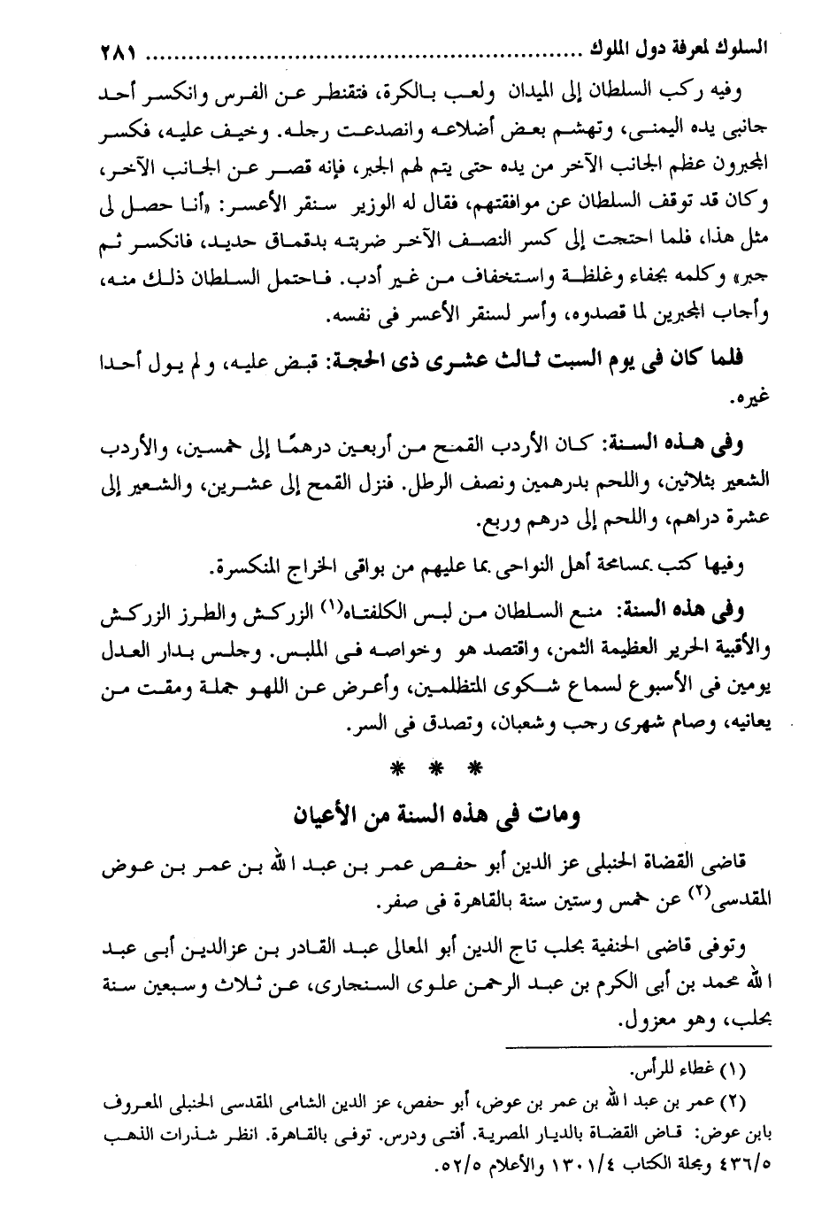 وَفِيه ركب السُّلْطَان إِلَى الميدان وَلعب بالكرة فتقنطر عَن الْفرس وانكسر أحد جَانِبي يَده اليمني وتهشم بعض أضلاعه وانصدعت رجله. وَخيف عَلَيْهِ فَكسر المجبرون عظم الْجَانِب الآخر من يَده حَتَّى يتم لَهُم الْجَبْر فَإِنَّهُ قصر عَن الْجَانِب الآخر وَكَانَ قد توقف السُّلْطَان عَن موافقتهم فَقَالَ الْوَزير سنقر الأعسر: أَنا حصل لي مثل هَذَا فَلَمَّا احتجت إِلَى كسر النّصْف الآخر ضَربته بدقماق حَدِيد فانكسر ثمَّ جبر وَكَلمه بجفاء وغلظة واستخفاف من غير أدب فَاحْتمل السُّلْطَان ذَلِك مِنْهُ وَأجَاب المجبرين لما قصدوه وَأسر لسنقر الأعسر فِي نَفسه. فَلَمَّا كَانَ فِي يَوْم السبت ثَالِث عشري ذِي الْحجَّة: قبض عَلَيْهِ وَلم يول أحدا غَيره. وَفِي هَذِه السّنة: كَانَ الأردب الْقَمْح من أَرْبَعِينَ درهما إِلَى خمسين والأردب الشّعير بِثَلَاثِينَ وَاللَّحم بِدِرْهَمَيْنِ وَنصف الرطل. فَنزل الْقَمْح إِلَى عشْرين وَالشعِير إِلَى عشرَة دَرَاهِم وَاللَّحم إِلَى دِرْهَم وَربع. وفيهَا كتب بمسامحة أهل النواحي. مِمَّا عَلَيْهِم من بواقي الْخراج المنكسرة. وَفِي هَذِه السّنة: منع السُّلْطَان من لبس الكلفتاه الزركش والطرز الزركش والأقبية الْحَرِير الْعَظِيمَة الثّمن واقتصد هُوَ وخواصه فِي الملبس. وَجلسَ بدار الْعدْل يَوْمَيْنِ فِي الْأُسْبُوع لسَمَاع شكوى المتظلمين وَأعْرض عَن اللَّهْو جملَة ومقت من يعاينه وَصَامَ شَهْري رَجَب وَشَعْبَان وَتصدق فِي السِّرّ. وَمَات فِي هَذِه السّنة من الْأَعْيَان قَاضِي الْقُضَاة الْحَنْبَلِيّ عز الدّين أَبُو حَفْص عمر بن عبد الله بن عمر بن عوض الْمَقْدِسِي عَن خمس وَسِتِّينَ سنة بِالْقَاهِرَةِ فِي صفر. وَتُوفِّي قَاضِي الْحَنَفِيَّة بحلب تَاج الدّين أَبُو الْمَعَالِي عبد الْقَادِر بن عز الدّين أبي عبد الله مُحَمَّد بن أبي الْكَرم بن عبد الرَّحْمَن علوي ثَلَاث وَسبعين سنة بحلب وَهُوَ مَعْزُول.