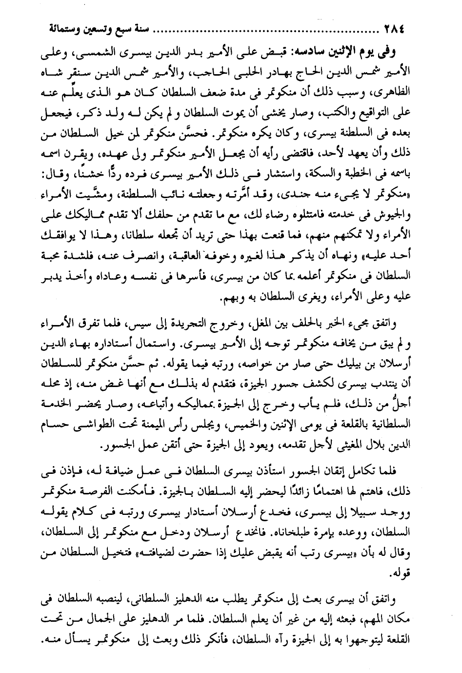 وَفِي يَوْم الْإِثْنَيْنِ سادسه: قبض على الْأَمِير بدر الدّين بيسري الشمسي وعَلى الْأَمِير شمس الدّين الْحَاج بهادر الْحلَبِي الْحَاجِب والأمير شمس الدّين سنقر شاه الظَّاهِرِيّ وَسبب ذَلِك أَن منكوتمر فِي مُدَّة ضعف السُّلْطَان كَانَ هُوَ الَّذِي يعلم عَنهُ على التواقيع والكتب وَصَارَ يخْشَى أَن يَمُوت السُّلْطَان وَلم يكن لَهُ ولد ذكر فَيجْعَل بعده فِي السلطنة بيسري وَكَانَ يكره منكوتمر. فَحسن منكوتمر لمن خيل السُّلْطَان من ذَلِك وَأَن يعْهَد لأحد فَاقْتضى رَأْيه أَن يَجْعَل الْأَمِير منكوتمر ولي عَهده ويقرن اسْمه باسمه فِي الْخطْبَة وَالسِّكَّة وَاسْتَشَارَ فِي ذَلِك الْأَمِير بيسري فَرده ردا خشناً وَقَالَ: منكوتمر لَا يَجِيء مِنْهُ جندي وَقد أَمرته وَجَعَلته نَائِب السلطة ومشيت الْأُمَرَاء والجيوش فِي خدمته فامتثلوه رِضَاء لَك مَعَ مَا تقدم من حلفك أَلا تقدم مماليكك على الْأُمَرَاء وَلَا تمكنهم مِنْهُم فَمَا قنعت بِهَذَا حَتَّى تُرِيدُ أَن تَجْعَلهُ سُلْطَانا وَهَذَا لَا يوافقك أحد عَلَيْهِ وَنَهَاهُ أَن يذكر هَذَا لغيره وخوفه الْعَاقِبَة وَانْصَرف عَنهُ فلشدة محبَّة السُّلْطَان فِي منكوتمر أعلمهُ بِمَا كَانَ من بيسري فأسرها فِي نَفسه وعاداه وَأخذ يدبر عَلَيْهِ وعَلى الْأُمَرَاء ويغري السُّلْطَان بِهِ وبهم. وَاتفقَ مَجِيء الْخَبَر بِالْحلف بَين الْمغل وَخُرُوج التجريدة إِلَى سيس فَلَمَّا تفرق الْأُمَرَاء وَلم يبْق من يخافه منكوتمر توجه إِلَى الْأَمِير بيسري. واستمال أستاداره بهاء الدّين أرسلان بن بيليك حَتَّى صَار من خواصه ورتبه فِيمَا يَقُوله. ثمَّ حسن منكوتمر للسُّلْطَان أَن ينتدب بيسري لكشف جسور الجيزة فَتقدم لَهُ بذلك مَعَ أَنَّهَا غض مِنْهُ إِذْ مَحَله أجل من ذَلِك فَلم يأب وَخرج إِلَى الجيزة بمماليكه وَأَتْبَاعه وَصَارَ يحضر الْخدمَة السُّلْطَانِيَّة بالقلعة فِي يومي الْإِثْنَيْنِ وَالْخَمِيس وَيجْلس رَأس الميمنة تَحت الطواشي حسام الدّين بِلَال المغيثي لأجل تقدمه وَيعود إِلَى الجيزة حَتَّى أتقن عمل الجسور. فَلَمَّا تَكَامل إتقان الجسور اسْتَأْذن بيسري السُّلْطَان فِي عمل ضِيَافَة لَهُ فَإِذن فِي ذَلِك فاهتم لَهَا اهتماماً زَائِدا ليحضر إِلَيْهِ السُّلْطَان بالجيزة. فأمكنت الفرصة منكوتمر وَوجد سَبِيلا إِلَى بيسري فخدع أرسلان استادار بيسري ورتبه فِي كَلَام يَقُوله السُّلْطَان ووعده بإمرة طبلخاناه. فانخدع أرسلان وَدخل مَعَ منكوتمر إِلَى السُّلْطَان وَقَالَ لَهُ بِأَن بيسري رتب أَنه يقبض عَلَيْك إِذا حضرت لضيافته فتخيل السُّلْطَان من قَوْله. وَاتفقَ أَن بيسري بعث إِلَى منكوتمر يطْلب مِنْهُ الدهليز السلطاني لينصبه السُّلْطَان فِي مَكَان المهم فَبَعثه إِلَيْهِ من غير أَن يعلم السُّلْطَان. فَلَمَّا مر الدهليز على الْجمال من تَحت القلعة ليتوجهوا بِهِ إِلَى الجيزة رَآهُ السُّلْطَان، فَأنْكر ذَلِك وَبعث ‘ لى منكوتمر يسْأَل مِنْهُ.