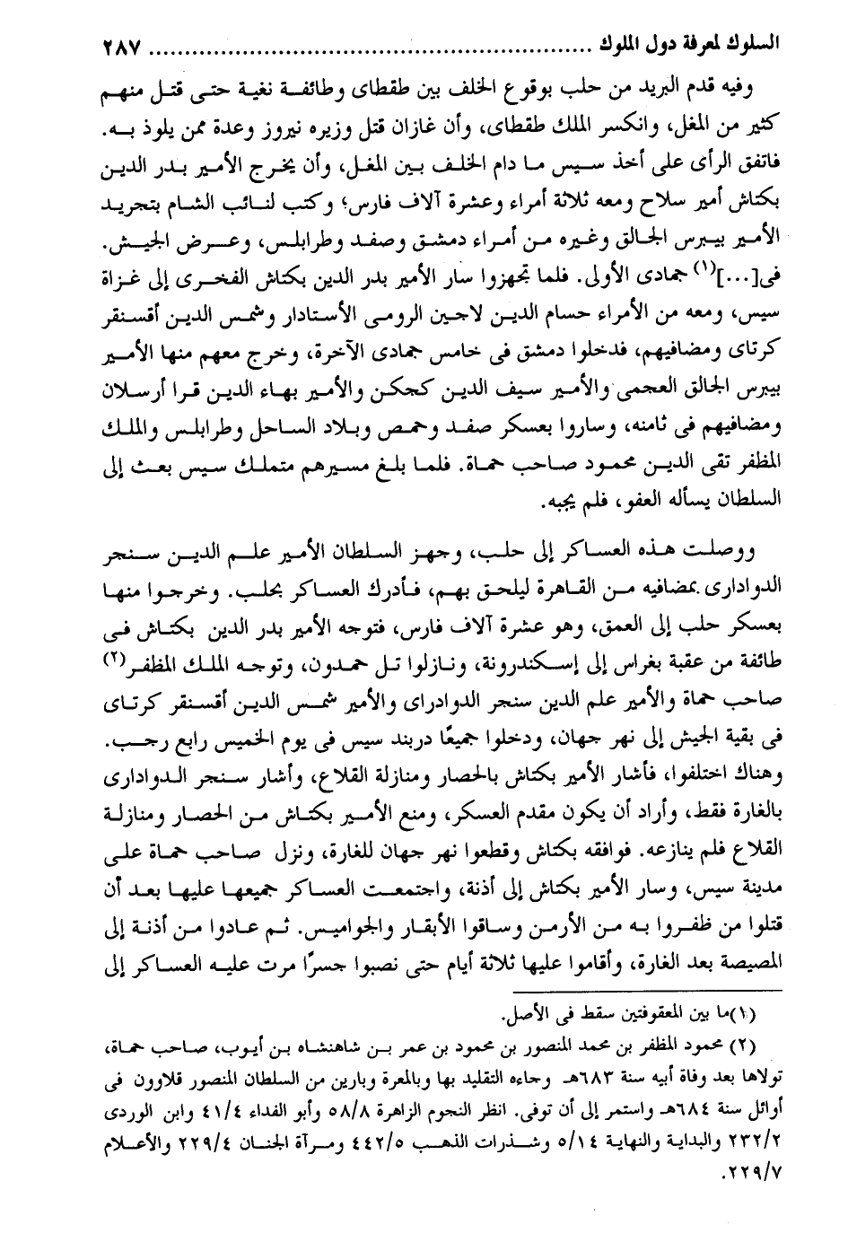 وَفِيه قدم الْبَرِيد من حلب بِوُقُوع الْخلف بَين طقطاي وَطَائِفَة نغية حَتَّى قتل مِنْهُم كثير من الْمغل وانكسر الْملك طقطاي وَأَن غازان قتل وزيره نيروز وعدة مِمَّن يلوذ بِهِ. فاتفق الرَّأْي على أَخذ سيس مَا دَامَ الْخلف بَين الْمغل وَأَن يخرج الْأَمِير بدر الدّين بكتاش أَمِير سلَاح وَمَعَهُ ثَلَاثَة أُمَرَاء وَعشرَة آلَاف فَارس وَكتب لنائب الشَّام بتجريد الْأَمِير بيبرس الجالق وَغَيره من أُمَرَاء دمشق وصفد وطرابلس وَعرض الْجَيْش. فِي جُمَادَى الأولى. فَلَمَّا تجهزوا سَار الْأَمِير بدر الدّين بكتاش الفخري إِلَى غزَاة سيس وَمَعَهُ من الْأُمَرَاء حسام الدّين لاجين الرُّومِي الأستادار وشمس الدّين أقسنقر كرتاي ومضافيهم فَدَخَلُوا دمشق فِي خَامِس جُمَادَى الْآخِرَة وَخرج مَعَهم مِنْهَا الْأَمِير بيبرس الجالق العجمي والأمير سيف الدّين كجكن والأمير بهاء الدّين قرا أرسلان ومضافيهم فِي ثامنه وَسَارُوا بعسكر صفد وحمص وبلاد السَّاحِل وطرابلس وَالْملك المظفر تَقِيّ الدّين مَحْمُود صَاحب حماة. فَلَمَّا بلغ مَسِيرهمْ متملك سيس بعث إِلَى السُّلْطَان يسْأَله الْعَفو فَلم يجبهُ. ووصلت هَذِه العساكر إِلَى حلب وجهز السُّلْطَان الْأَمِير علم الدّين سنجر الدواداري بمضافيه من الْقَاهِرَة ليلحق بهم فَأدْرك العساكر بحلب. وَخَرجُوا مِنْهَا بعسكر حلب إِلَى العمق وَهُوَ عشرَة آلَاف فَارس فَتوجه الْأَمِير بدر الدّين بكتاش فِي طَائِفَة من عقبَة بغراس إِلَى اسكندرونة ونازلوا تل حمدون وَتوجه الْملك المظفر صَاحب حماة والأمير علم الدّين سنجر الدوادراي والأمير شمس الدّين أقسنقر كرتاي فِي بَقِيَّة الْجَيْش إِلَى نهر جهان ودخلوا جَمِيعًا دربند سيس فِي يَوْم الْخَمِيس رَابِع رحب. وَهُنَاكَ اخْتلفُوا فَأَشَارَ الْأَمِير بكتاش بالحصار ومنازلة القلاع وَأَشَارَ سنجر الدواداري بالغارة فَقَط وَأَرَادَ أَن يكون مقدم الْعَسْكَر وَمنع الْأَمِير بكتاش من الْحصار ومنازلة القلاع فَلم ينازعه. فوافقه بكتاش وَقَطعُوا نهر جهان للغارة وَنزل صَاحب حماة على مَدِينَة سيس وَسَار الْأَمِير بكتاش إِلَى أذنة وَاجْتمعت العساكر جَمِيعهَا عَلَيْهَا بعد أَن قتلوا من ظفروا بِهِ من الأرمن وَسَاقُوا الأبقار والجواميس. ثمَّ عَادوا من أذنة إِلَى المصيصة بعد الْغَارة وَأَقَامُوا عَلَيْهَا ثَلَاثَة أَيَّام حَتَّى نصبوا جِسْرًا مرت عَلَيْهِ العساكر إِلَى