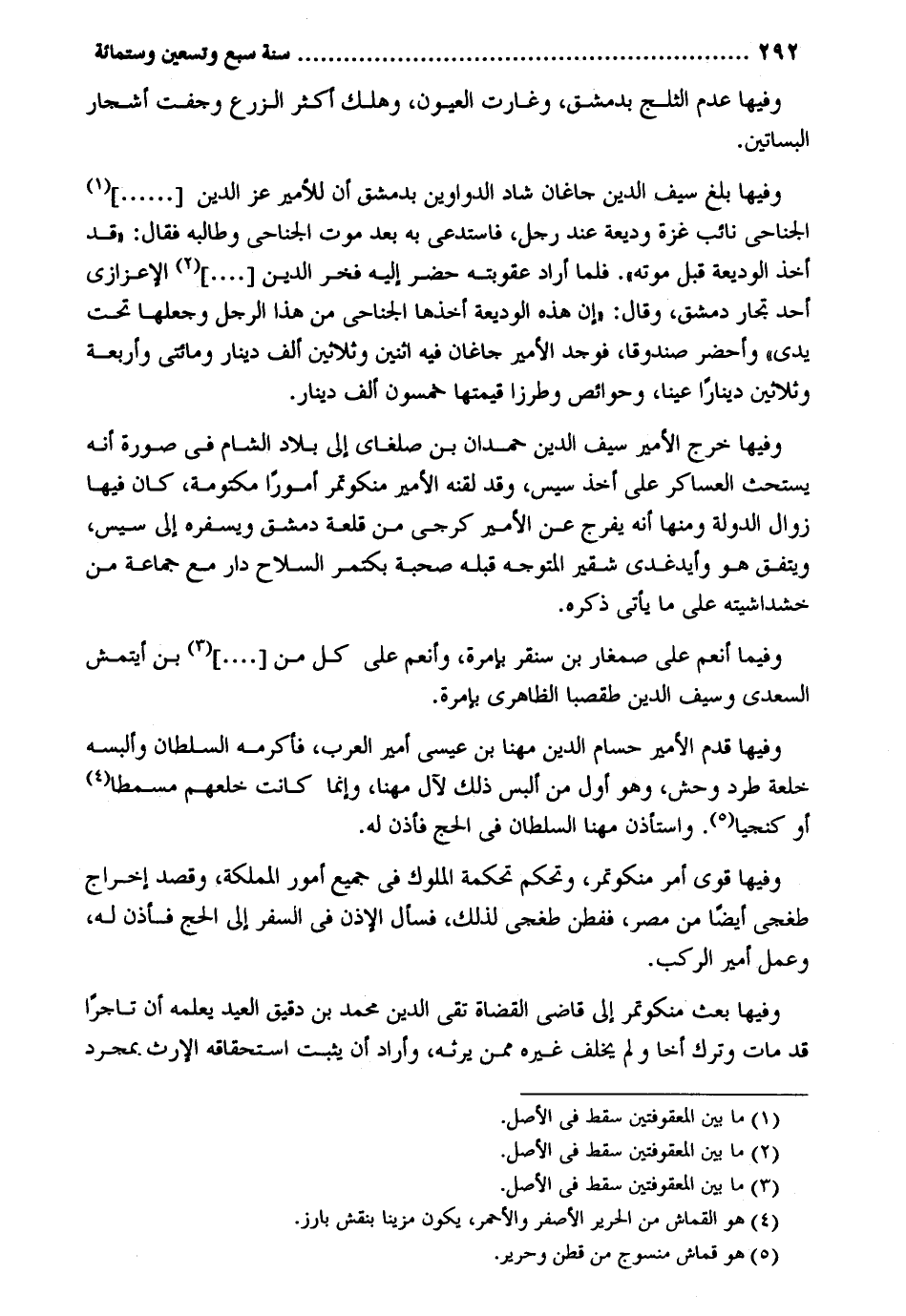 وفيهَا عدم الثَّلج بِدِمَشْق وَغَارَتْ الْعُيُون وَهلك أَكثر الزَّرْع وحفت أَشجَار الْبَسَاتِين. وفيهَا بلغ سيف الدّين جاغان شاد الدَّوَاوِين بِدِمَشْق أَن للأمير عز الدّين الجناحي نَائِب غَزَّة وَدِيعَة عِنْد رَحل فاستدعى بِهِ بعد موت الجناحي وطالبه فَقَالَ: قد أَخذ الْوَدِيعَة قبل مَوته. فَلَمَّا أَرَادَ عُقُوبَته حضر إِلَيْهِ فَخر الدّين الإعزازي أحد تجار دمشق وَقَالَ: إِن هَذِه الْوَدِيعَة أَخذهَا الجناحي من هَذَا الرجل وَجعلهَا تَحت يَدي وأحضر صندوقاً فَوحد الْأَمِير جاغان فِيهِ اثْنَيْنِ وَثَلَاثِينَ ألف دِينَار ومائتي وَأَرْبَعَة وَثَلَاثِينَ دِينَارا عينا وحوائص وطرزا قيمتهَا خَمْسُونَ ألف دِينَار. وفيهَا خرج الْأَمِير سيف الدّين حمدَان بن صلغاي إِلَى بِلَاد الشَّام فِي صُورَة أَنه يستحث العساكر على أَخذ سيس وَقد لقنه الْأَمِير منكوتمر أموراً مكتومة كَانَ فِيهَا زَوَال الدولة وَمِنْهَا أَنه يفرج عَن الْأَمِير كرجي من قلعة دمشق ويسفره إِلَى سيس ويتفق هُوَ وأيدغدي شقير المتوجه قبله صُحْبَة بكتمر السِّلَاح دَار مَعَ جمَاعَة من خشداشيته على مَا يَأْتِي ذكره. وَفِيمَا أنعم على صمغار بن سنقر بإمرة وأنعم على كل من بن أيتمش السَّعْدِيّ وَسيف الدّين طقصبا الظَّاهِرِيّ بإمرة. وفيهَا قدم الْأَمِير حسام الدّين مهنا بن عِيسَى أَمِير الْعَرَب فَأكْرمه السُّلْطَان وَألبسهُ خلعة طرد وَحش وَهُوَ أول من ألبس ذَلِك لآل مهنا وَإِنَّمَا كَانَت خلعهم مسمطا أَو كنجيا. وَاسْتَأْذَنَ مهنا وفيهَا قوي أَمر منكوتمر وتحكم تحكمة الْمُلُوك فِي جَمِيع أُمُور المملكة وَقصد إِخْرَاج طغجي أَيْضا من مصر فَفطن طغجي لذَلِك فَسَأَلَ الْإِذْن فِي السّفر إِلَى الْحَج فَأذن لَهُ وَعمل أَمِير الركب. وفيهَا بعث منكوتمر إِلَى قَاضِي الْقُضَاة تَقِيّ الدّين مُحَمَّد بن دَقِيق الْعِيد يُعلمهُ أَن تَاجِرًا قد مَاتَ وَترك أَخا وَلم يخلف غَيره مِمَّن يَرِثهُ وَأَرَادَ أَن يثبت اسْتِحْقَاقه الْإِرْث بِمُجَرَّد
