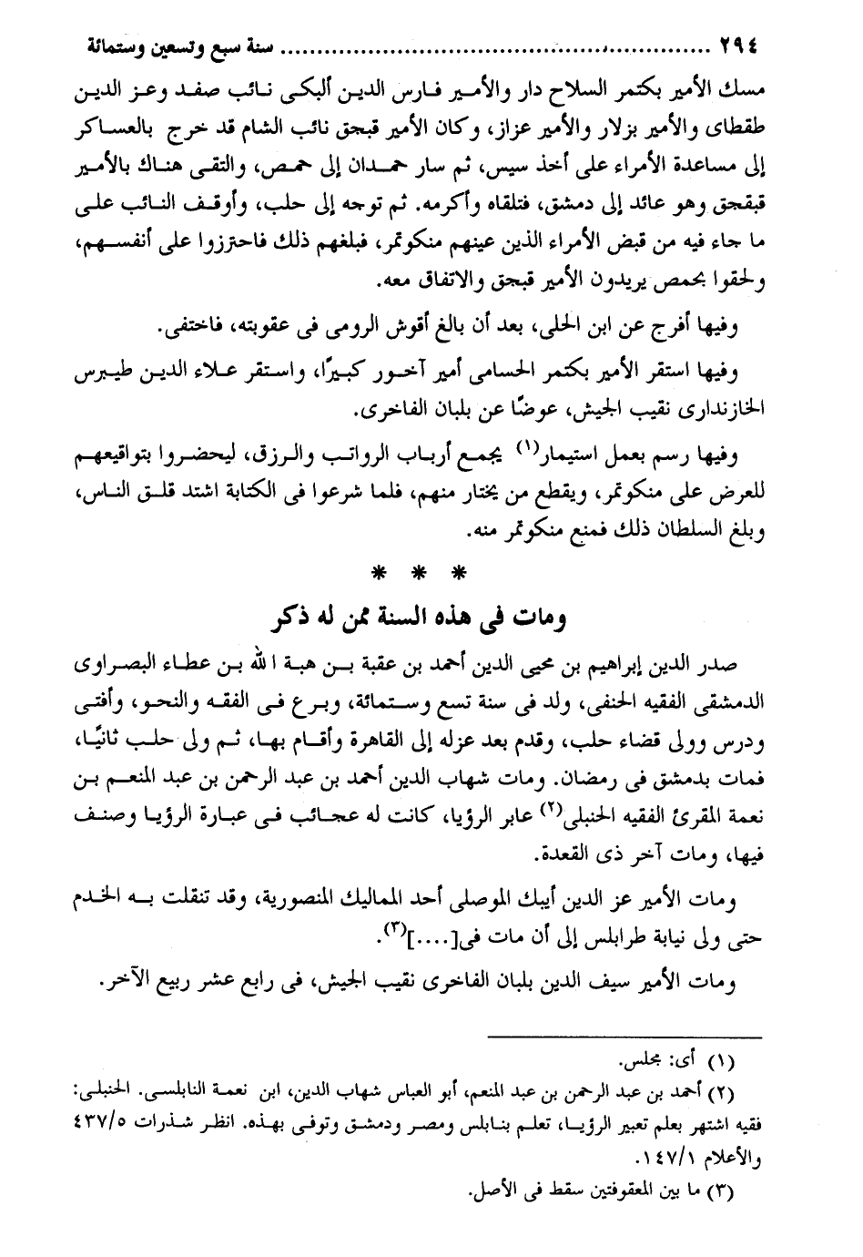 مسك الْأَمِير بكتمر السِّلَاح دَار والأمير فَارس الدّين ألبكي نَائِب صفد وَعز الدّين طقطاي والأمير بزلار والأمير عزاز وَكَانَ الْأَمِير قبجق نَائِب الشَّام قد خرج بالعساكر إِلَى مساعدة الْأُمَرَاء على أَخذ سيس ثمَّ سَار حمدَان إِلَى حمص والتقي هُنَاكَ بالأمير قبجق وَهُوَ عَائِد إِلَى دمشق فَتَلقاهُ وأكرمه. ثمَّ توجه إِلَى حلب وأوقف النَّائِب على مَا جَاءَ فِيهِ من قبض الْأُمَرَاء الَّذين عينهم منكوتمر فَبَلغهُمْ ذَلِك فاحترزوا على أنفسهم وَلَحِقُوا بحمص يُرِيدُونَ الْأَمِير قبجق والاتفاق مَعَه. وفيهَا أفرج عَن ابْن الْحلِيّ بعد أَن بَالغ أقوش الرُّومِي فِي عُقُوبَته فاختفى. وفيهَا اسْتَقر الْأَمِير بكتمر الحسامي أَمِير آخور كَبِيرا وَاسْتقر عَلَاء الدّين طيبرس الخازنداري نقيب الْجَيْش عوضا عَن بلبان الفاخري. وفيهَا رسم بِعَمَل استيمار يجمع أَرْبَاب الرَّوَاتِب والرزق ليحضروا بتواقيعه للعرض على منكوتمر وَيقطع من يخْتَار مِنْهُم فَلَمَّا شرعوا فِي الْكِتَابَة اشْتَدَّ قلق النَّاس وَبلغ السُّلْطَان ذَلِك فَمنع منكوتمر مِنْهُ. وَمَات فِي هَذِه السّنة مِمَّن لَهُ ذكر صدر الدّين إِبْرَاهِيم بن محيى الدّين أَحْمد بن عقبَة بن هبة الله بن عَطاء البصراوي الدِّمَشْقِي الْفَقِيه الْحَنَفِيّ ولد فِي سنة تسع وسِتمِائَة وبرع فِي الْفِقْه والنحو وَأفْتى ودرس وَولي قَضَاء حلب وَقدم بعد عَزله إِلَى الْقَاهِرَة وَأقَام بهَا ثمَّ ولي حلب ثَانِيًا فَمَاتَ بِدِمَشْق فِي رَمَضَان. وَمَات شهَاب الدّين أَحْمد بن عبد الرَّحْمَن بن عبد الْمُنعم بن نعْمَة الْمُقْرِئ الْفَقِيه الْحَنْبَلِيّ عَابِر الرُّؤْيَا كَانَت لَهُ عجائب فِي عبارَة الرُّؤْيَا وصنف فِيهَا وَمَات آخر ذِي الْقعدَة. وَمَات الْأَمِير عز الدّين أيبك الْموصِلِي أحد المماليك المنصورية وَقد تنقلت بِهِ الخدم حَتَّى ولي نِيَابَة طرابلس إِلَى أَن مَاتَ فِي. وَمَات الْأَمِير سيف الدّين بلبان الفاخري نقيب الْجَيْش فِي رَابِع عشر ربيع الآخر.