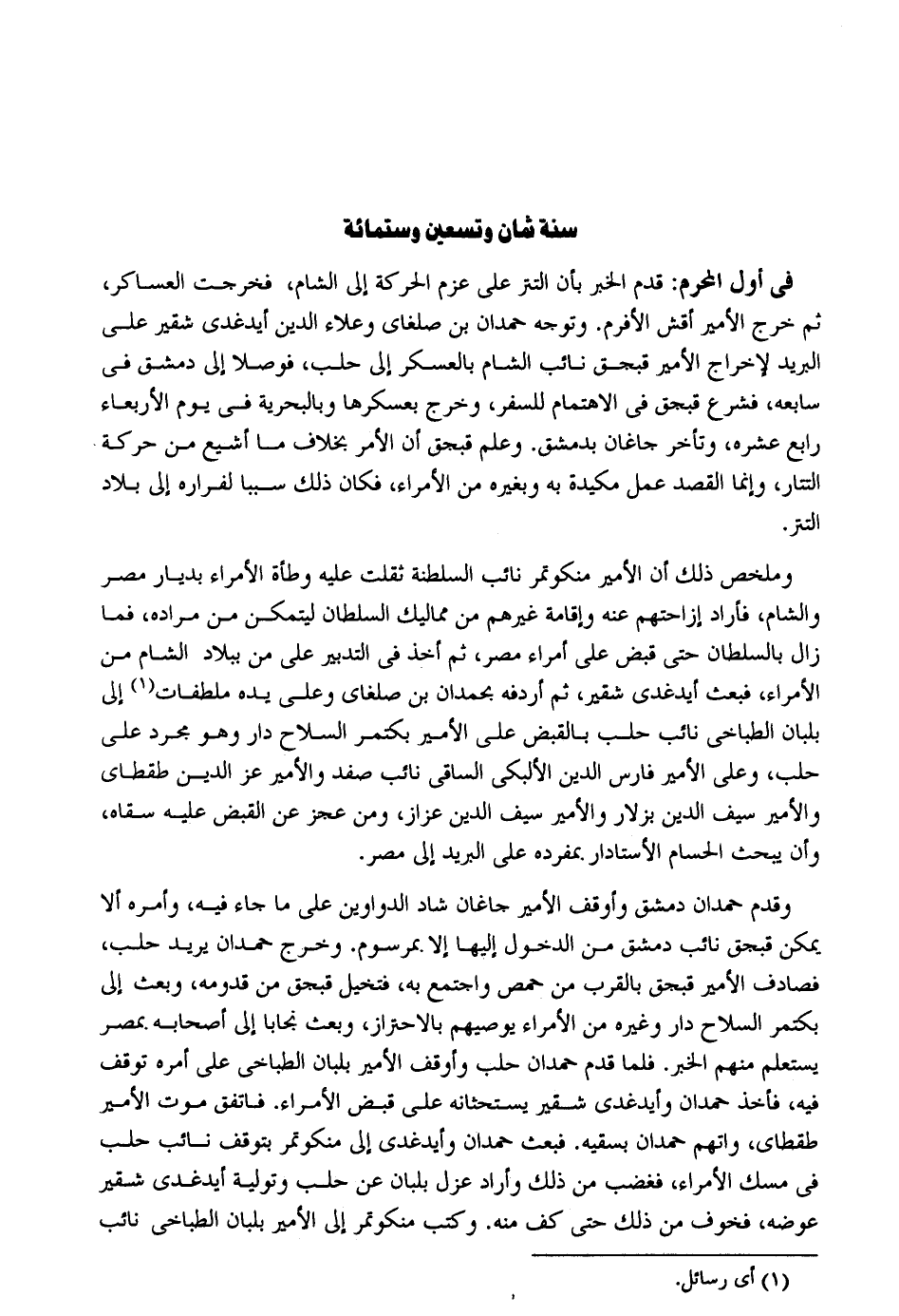 سنة ثَمَان وَتِسْعين وسِتمِائَة فِي أول الْمحرم: قدم الْخَبَر بِأَن التتر على عزم الْحَرَكَة إِلَى الشَّام فَخرجت العساكر ثمَّ خرج الْأَمِير أقش الأفرم. وَتوجه حمدَان بن صلغاي وعلاء الدّين أيدغدي شقير على الْبَرِيد لإِخْرَاج الْأَمِير قبجق نَائِب الشَّام بالعسكر إِلَى حلب فوصلا إِلَى دمشق فِي سابعه فشرع قبجق فِي الاهتمام للسَّفر وَخرج بعسكرها وبالبحرية فِي يَوْم الْأَرْبَعَاء رَابِع عشره وَتَأَخر جاغان بِدِمَشْق. وَعلم قبجق أَن الْأَمر بِخِلَاف مَا أشيع من حَرَكَة التتار وَإِنَّمَا الْقَصْد عمل مكيدة بِهِ وَبِغَيْرِهِ من الْأُمَرَاء فَكَانَ ذَلِك سَببا لفراره إِلَى بِلَاد التتر. وَمُلَخَّص ذَلِك أَن الْأَمِير منكوتمر نَائِب السلطنة ثقلت عَلَيْهِ وَطْأَة الْأُمَرَاء بديار مصر وَالشَّام فَأَرَادَ إزاحتهم عَنهُ وَإِقَامَة غَيرهم من مماليك السُّلْطَان ليتَمَكَّن من مُرَاده فَمَا زَالَ بالسلطان حَتَّى قبض على أُمَرَاء مصر ثمَّ أَخذ فِي التَّدْبِير على من بِبِلَاد الشَّام من الْأُمَرَاء فَبعث أيدغدي شقير ثمَّ أردفه بحمدان بن صلغاي وعَلى يَده ملطفات إِلَى بلبان الطاخي نَائِب حلب بِالْقَبْضِ على الْأَمِير بكتمر السِّلَاح دَار وَهُوَ مُجَرّد على حلب وعَلى الْأَمِير فَارس الدّين الألبكي الساقي نَائِب صفد والأمير عز الدّين طقطاي والأمير سيف الدّين بزلار والأمير سيف الدّين عزاز وَمن وَقدم حمدَان دمشق وأوقف الْأَمِير جاغان شاد الدَّوَاوِين على مَا جَاءَ فِيهِ وَأمره أَلا يُمكن قبجق نَائِب دمشق من الدُّخُول إِلَيْهَا إِلَّا بمرسوم. وَخرج حمدَان يُرِيد حلب فصادف الْأَمِير قبجق بِالْقربِ من حمص وَاجْتمعَ بِهِ فتخيل قبجق من قدومه وَبعث إِلَى بكتمر السِّلَاح دَار وَغَيره من الْأُمَرَاء يوصيهم بالاحتراز وَبعث نجابا إِلَى أَصْحَابه بِمصْر يستعلم مِنْهُم الْخَبَر. فَلَمَّا قدم حمدَان حلب وأوقف الْأَمِير بلبان الطباخي على أمره توقف فِيهِ فَأخذ حمدَان وأيدغدي شقير يستحثانه على قبض الْأُمَرَاء. فاتفق موت الْأَمِير طقطاي واتهم حمدَان بسقيه. فَبعث حمدَان وأيدغدي إِلَى منكوتمر بتوقف نَائِب حلب فِي مسك الْأُمَرَاء فَغَضب من ذَلِك وَأَرَادَ عزل بلبان عَن حلب وتولية أيدغدي شقير عوضه فخوف من ذَلِك حَتَّى كف مِنْهُ. وَكتب منكوتمر إِلَى الْأَمِير بلبان الطباخي نَائِب