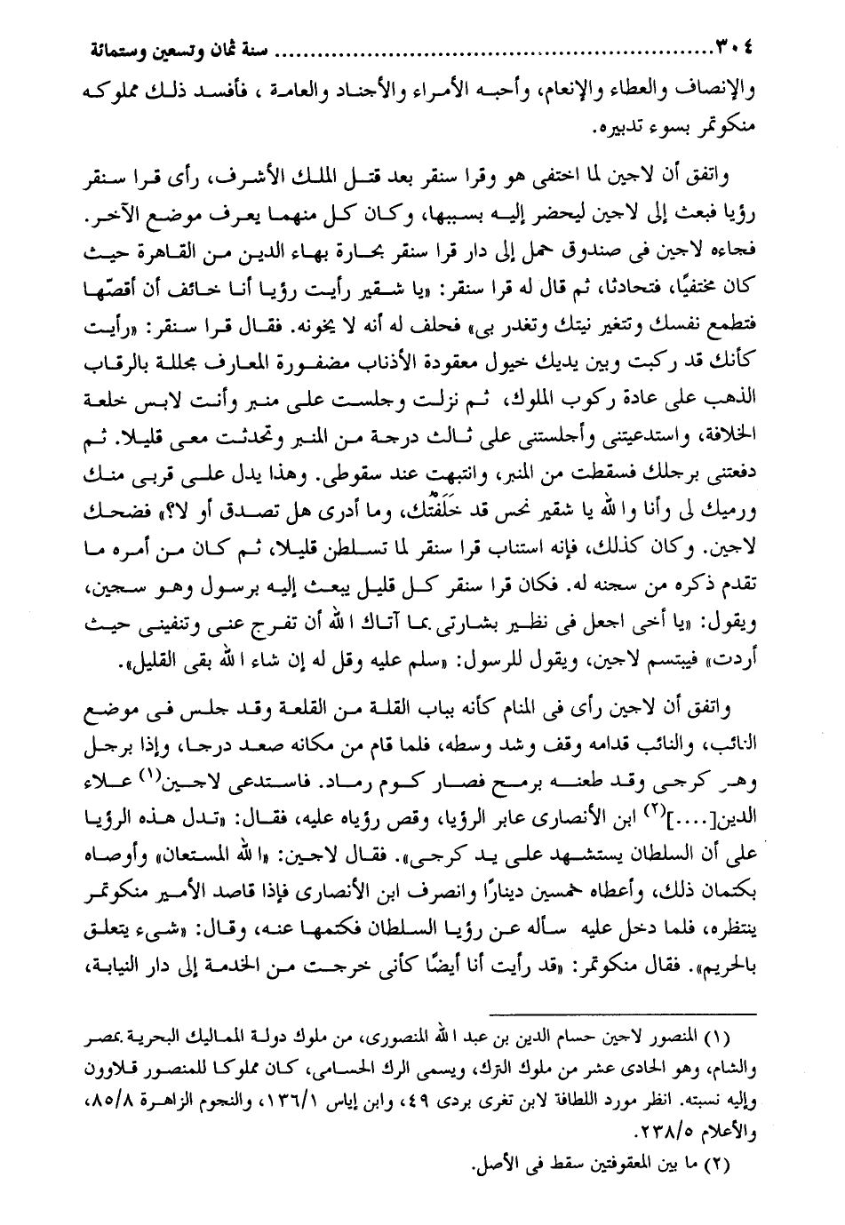 والإنصاف وَالعطَاء والإنعام وأحبه الْأُمَرَاء والأجناد والعامة فأفسد ذَلِك مَمْلُوكه منكوتمر بِسوء تَدْبيره. وَاتفقَ أَن لاجين لما اختفى هُوَ وقرا سنقر بعد قتل الْملك الْأَشْرَف رأى قرا سنقر رُؤْيا فَبعث إِلَى لاجين ليحضر إِلَيْهِ بِسَبَبِهَا وَكَانَ كل مِنْهُمَا يعرف مَوضِع الآخر. فَجَاءَهُ لاجين فِي صندوق حمل إِلَى دَار قراسنقر بحارة بهاء الدّين من الْقَاهِرَة حَيْثُ كَانَ مختفياً فتحادثا ثمَّ قَالَ لَهُ قرا سنقر: يَا شقير رَأَيْت رُؤْيا أَنا خَائِف أَن أقصها فتطمع نَفسك وتتغير نيتك وتغدر بِي فَحلف لَهُ أَنه لَا يخونه. فَقَالَ قراسنقر: رَأَيْت كَأَنَّك قد ركبت وَبَين يَديك خُيُول معقودة الأذناب مضفورة المعارف مُجَللَة بالرقاب الذَّهَب على عَادَة ركُوب الْمُلُوك ثمَّ نزلت وَجَلَست على مِنْبَر وَأَنت لابس خلعة الْخلَافَة واستدعتني وأجلستني على ثَالِث دَرَجَة من الْمِنْبَر وتحدثت معي قَلِيلا. ثمَّ دفعتني برجلك فَسَقَطت من الْمِنْبَر وانتبهت عِنْد سقوطي. وَهَذَا يدل على قربي مِنْك ورميك لي وَأَنا وَالله يَا شقير نحس قد خلفتك وَمَا أَدْرِي هَل تصدق أَو لَا فَضَحِك لاجين. وَكَانَ كَذَلِك فَإِنَّهُ استناب قراسنقر لما تسلطن قَلِيلا ثمَّ كَانَ من أمره مَا تقدم ذكره من سجنه لَهُ. فَكَانَ قراسنقر كل قَلِيل يبْعَث إِلَيْهِ برَسُول وَهُوَ سِجِّين وَيَقُول: يَا أخي اجْعَل فِي نَظِير بشارتي بِمَا آتاك الله أَن تفرج عني وتنفيني حَيْثُ أردْت فيبتسم لاجين وَيَقُول للرسول: سلم وَاتفقَ أَن لاجين رأى فِي الْمَنَام كَأَنَّهُ بِبَاب الْقلَّة من القلعة وَقد جلس فِي مَوضِع النَّائِب والنائب قدامه وقف وَشد وَسطه فَلَمَّا قَامَ من مَكَانَهُ صعد درجا وَإِذا بِرَجُل وَهُوَ كرجي وَقد طعنه بِرُمْح فَصَارَ كوم رماد. فاستدعى لاجين عَلَاء الدّين ابْن الْأنْصَارِيّ عَابِر الرُّؤْيَا وقص رُؤْيَاهُ عَلَيْهِ فَقَالَ: تدل هَذِه الرُّؤْيَا على أَن السُّلْطَان يستشهد على يَد كرجي. فَقَالَ لاجين: الله الْمُسْتَعَان وأوصاه بكتمان ذَلِك وَأَعْطَاهُ خمسين دِينَارا وَانْصَرف ابْن الْأنْصَارِيّ فَإِذا قَاصد الْأَمِير منكوتمر ينتظره فَلَمَّا دخل عَلَيْهِ سَأَلَهُ عَن رويا السُّلْطَان فكتمها عَنهُ وَقَالَ: شَيْء يتَعَلَّق بِالْحَرِيمِ. فَقَالَ منكوتمر: قد رَأَيْت أَنا أَيْضا كَأَنِّي خرجت من الْخدمَة إِلَى دَار النِّيَابَة