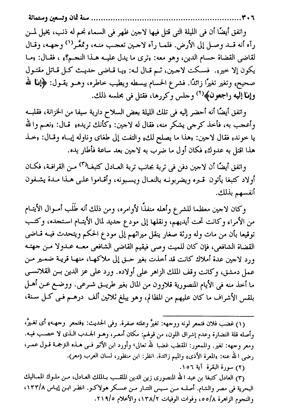 وَاتفقَ أَيْضا أَن فِي اللَّيْلَة الَّتِي قتل فِيهَا لاجين ظهر فِي السَّمَاء نجم لَهُ ذَنْب يخيل لمن رَآهُ أَنه قد وصل إِلَى الأَرْض. فَلَمَّا رَآهُ لاجين تعجب مِنْهُ وتمعر وَجهه وَقَالَ لقَاضِي الْقُضَاة حسام الدّين وَهُوَ مَعَه: ترى مَا يدل عَلَيْهِ هَذَا النَّجْم فَقَالَ: مَا يكون إِلَّا خير. فَسكت لاجين ثمَّ قَالَ لَهُ: يَا قَاضِي حَدِيث كل قَاتل مقتول صَحِيح وَتغَير تغيراً زَائِدا. فشرع الحسام يبسطه ويطيب خاطره وَهُوَ يَقُول: إِنَّا لله وَإِنَّا إِلَيْهِ رَاجِعُون وَجلسَ وكررها فَقتل فِي مَجْلِسه ذَلِك. وَاتفقَ أَيْضا أَنه أحضر إِلَيْهِ فِي تِلْكَ اللَّيْلَة بعض السِّلَاح دارية سَيْفا من الخزانة فقلبه وأعجب بِهِ فَأخذ كرجي يشْكر مِنْهُ فَقَالَ لَهُ لاجين: كَأَنَّك تريده قَالَ: نعم وَالله يَا خوند فَقَالَ لاحين: هَذَا مَا يصلح لَك والتفت إِلَى طغاي وناوله إِيَّاه وَقَالَ: خُذ هَذَا اقْتُل بِهِ عَدوك فَكَانَ أول مَا ضرب بِهِ لاحين بعد سَاعَة فأطار يَده. وَاتفقَ أَيْضا أَن لاجين دفن فِي تربة بِجَانِب تربة الْعَادِل كتبغا من القرافة فَكَانَ أَوْلَاد كتبغا يأْتونَ قَبره ويضربونه بالنعال ويسبونه وَأَقَامُوا على هَذَا مُدَّة يشفون أنفسهم بذلك. وَكَانَ لاجين مُعظما للشَّرْع وَأَهله منفذاً لأوامره وَمن ذَلِك أَنه طلب أَمْوَال الْأَيْتَام من الْأُمَرَاء وَكَانَت تَحت أَيْديهم ونقلها إِلَى مُودع حَدِيد لمَال الْأَيْتَام استجده وَكتب توقيعا بِأَن من مَاتَ وَله وَرَثَة صغَار ينْقل ميراثهم إِلَى مُودع الحكم ويتحدث فِيهِ قَاضِي الْقُضَاة الشَّافِعِي فَإِن كَانَ للْمَيت وَصِيّ فيقيم القَاضِي الشَّافِعِي مَعَه عُدُولًا من جِهَته ورد لاجين عدَّة أَمْلَاك كَانَت قد أخذت بِغَيْر حق إِلَى ملاكها مِنْهَا قَرْيَة ضمير من عمل دمشق وَكَانَت وقف الْملك الزَّاهِر على أَوْلَاده. ورد على عز الدّين بن القلانسي مَا أَخذ مِنْهُ فِي الْأَيَّام المنصورية قلاوون من المَال بِغَيْر طَرِيق شَرْعِي. وَوضع عَن أهل بلقس الْأَشْرَاف مَا كَانَ عَلَيْهِم من الْمَظَالِم وَهُوَ يبلغ ثَلَاثِينَ ألف دِرْهَم فِي كل سنة