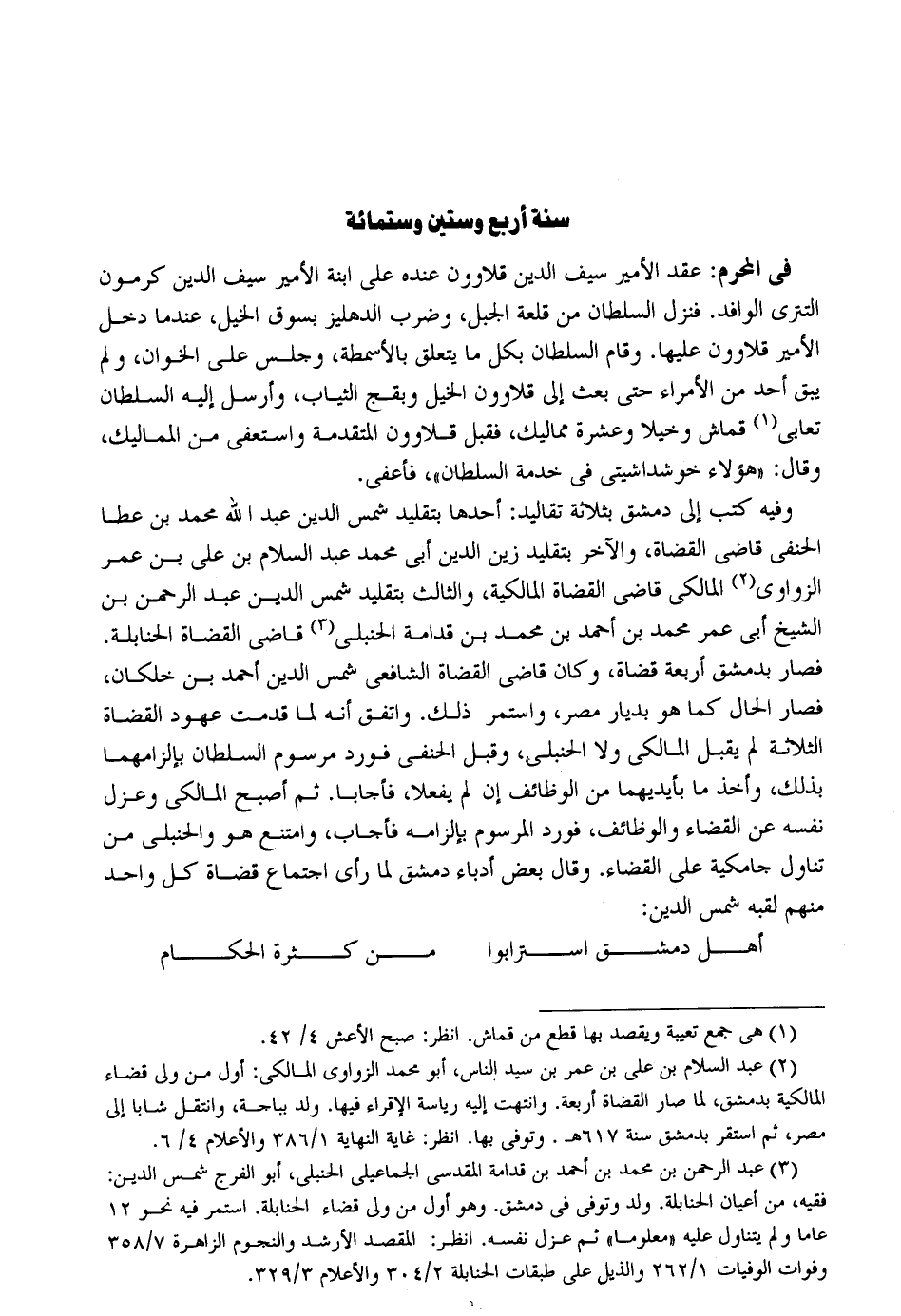 سنة أَربع وَسِتِّينَ وسِتمِائَة فِي الْمحرم: عقد الْأَمِير سيف الدّين قلاوون عِنْده على ابْنة الْأَمِير سيف الدّين كرمون التتري الْوَافِد. فَنزل السُّلْطَان من قلعة الْجَبَل وَضرب الدهليز بسوق الْخَيل عِنْدَمَا دخل الْأَمِير قلاوون عَلَيْهَا. وَقَامَ السُّلْطَان بِكُل مَا يتَعَلَّق بالأسمطة وَجلسَ على الخوان وَلم يبْق أحد من الْأُمَرَاء حَتَّى بعث إِلَى قلاوون الْخَيل وبقج الثِّيَاب وَأرْسل إِلَيْهِ السُّلْطَان تعابى قماش وخيلا وَعشرَة مماليك فَقبل قلاوون الْمُتَقَدّمَة واستعفى من المماليك وَقَالَ: هَؤُلَاءِ خوشداشيتي فِي خدمَة السُّلْطَان فأعفي. وَفِيه كتب إِلَى دمشق بِثَلَاثَة تقاليد: أَحدهَا بتقليد شمس الدّين عبد الله مُحَمَّد بن عطا الْحَنَفِيّ قَاضِي الْقُضَاة وَالْآخر بتقليد زين الدّين أبي مُحَمَّد عبد السَّلَام بن على بن عمر الزواوي الْمَالِكِي قَاضِي الْقُضَاة الْمَالِكِيَّة وَالثَّالِث بتقليد شمس الدّين عبد الرَّحْمَن بن الشَّيْخ أبي عمر مُحَمَّد بن أَحْمد بن مُحَمَّد بن قدامَة الْحَنْبَلِيّ قَاضِي الْقُضَاة الْحَنَابِلَة. فَصَارَ بِدِمَشْق أَرْبَعَة قُضَاة وَكَانَ قَاضِي الْقُضَاة الشَّافِعِي شمس الدّين أَحْمد بن خلكان فَصَارَ الْحَال كَمَا هُوَ بديار مصر وَاسْتمرّ ذَلِك. وَاتفقَ إِنَّه لما قدمت عهود الْقُضَاة الثَّلَاثَة لم يقبل الْمَالِكِي وَلَا الْحَنْبَلِيّ وَقبل الْحَنَفِيّ فورد مرسوم السُّلْطَان بإلزامهما بذلك وَأخذ مَا بأياديهما من الْوَظَائِف إِن لم يفعلا فأجابا. ثمَّ أصبح الْمَالِكِي وعزل نَفسه عَن الْقَضَاء والوظائف فورد المرسوم بإلزامه فَأجَاب وَامْتنع هُوَ والحنبلي من تنَاول جامكية على الْقَضَاء. وَقَالَ بعض أدباء دمشق لما رَأْي اجْتِمَاع قُضَاة كل وَاحِد مِنْهُم لقبه شمس الدّين: أهل دمشق استرابوا من كَثْرَة الْحُكَّام